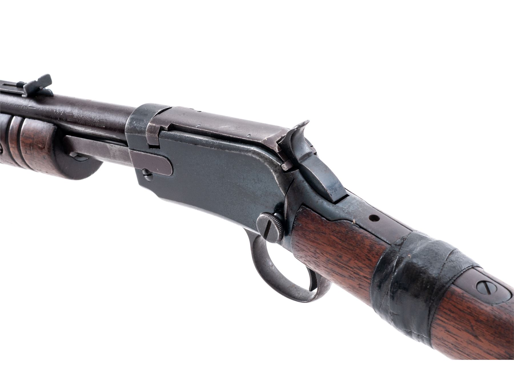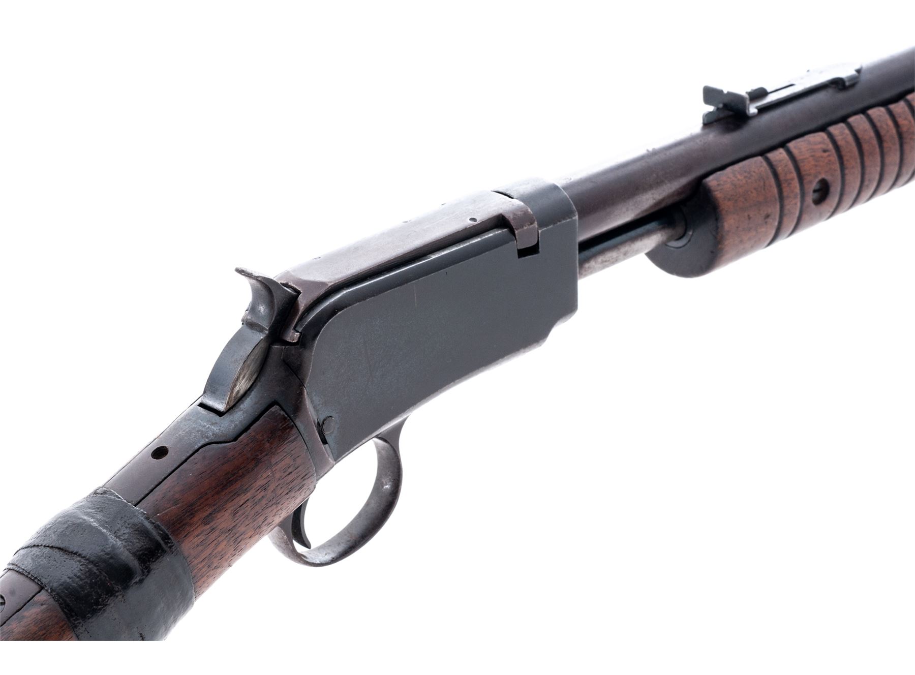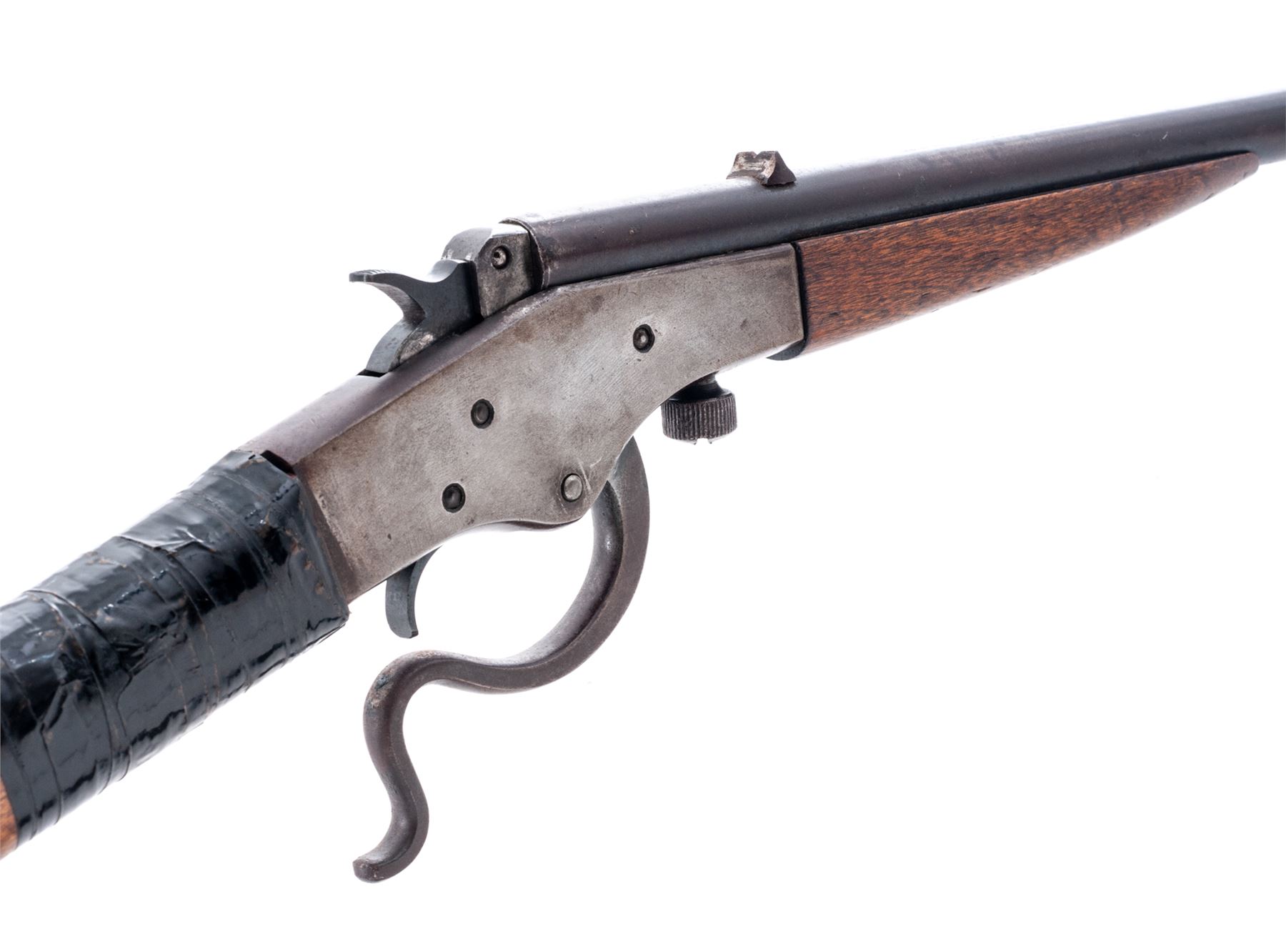 Lot of Two (2) Boys' Single Shot Rifles: (1) J. Stevens ''Crack Shot'' No. 26 Rifle, NVSN, .22 LR RF cal., 20'' round barrel with missing blade front and dovetailed notched rear sights; steel receiver with large knurled bottom takedown screw and serpentine operating lever marked ''Crack Shot-26'' on left side; plain oil-stained hardwood forend and straight buttstock with steel buttplate. Mfg'd 1912-39. Condition is about good, the metal parts retaining no original finish with an overall gunmetal gray color and clear markings (slight battering at barrel address), the buttstock with what appears to be black electrical tape covering a break repair at wrist and a hole drilled through near toe, perhaps for a leather thong. Action functions as designed; bore is clean with defined rifling. (2) Winchester Model 62A Pump Action Rifle, #146722, .22 S-L-LR RF cal., 23'' round barrel with dovetailed blade front and adjustable open rear; blued tubular cartridge magazine; blued steel receiver with large knurled takedown screw on left side; oil-stained walnut grooved forend slide and straight buttstock. Mfg'd 1942. Condition is good to very good, the metal retaining perhaps 15% blue blending with brown patina, the buttstock with what may be black electrical tape covering a break repair at wrist. Action is smooth; bore shines with defined rifling. Est.: $150-$250/Lot. (Both C&R)