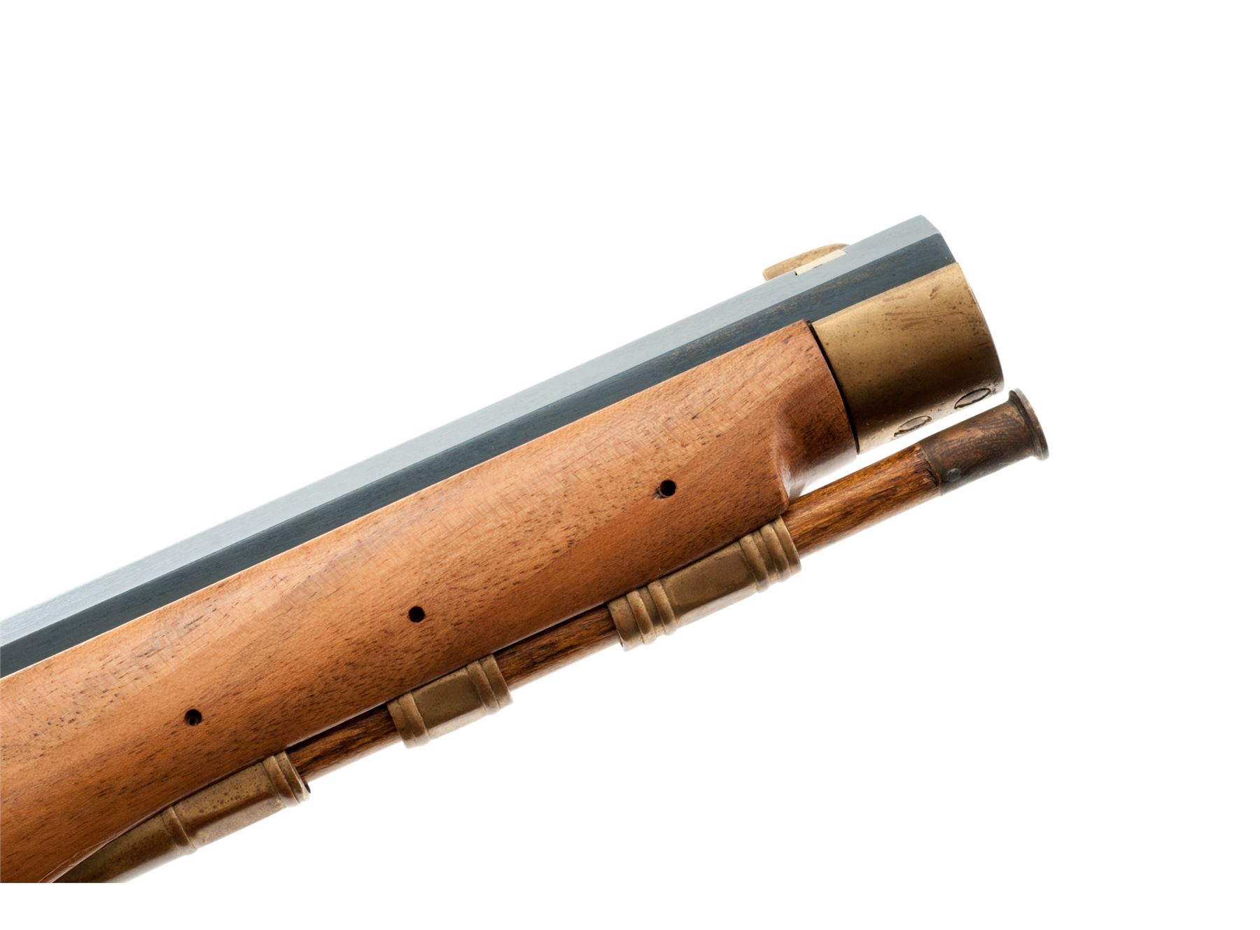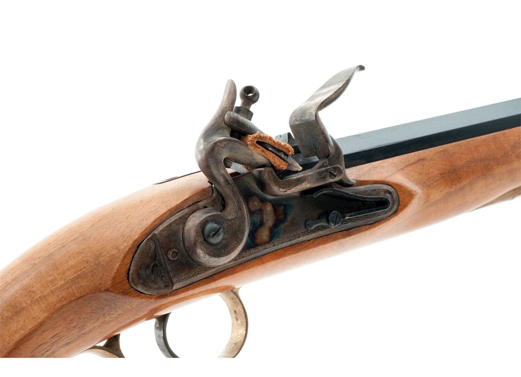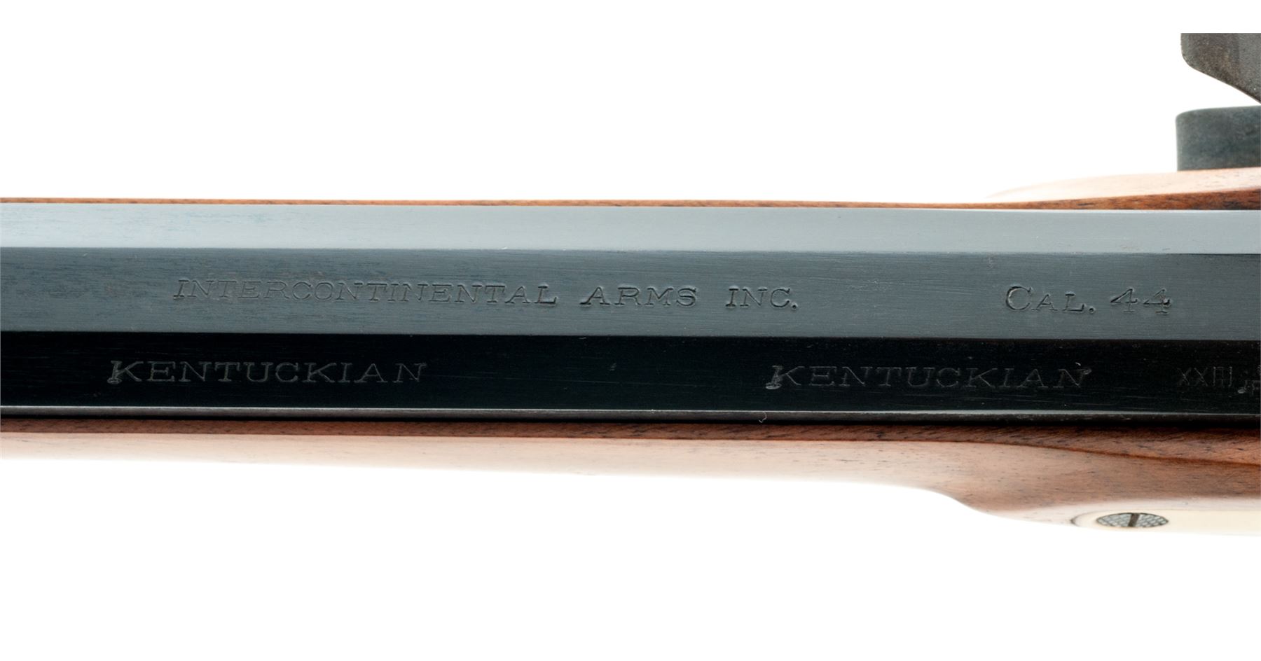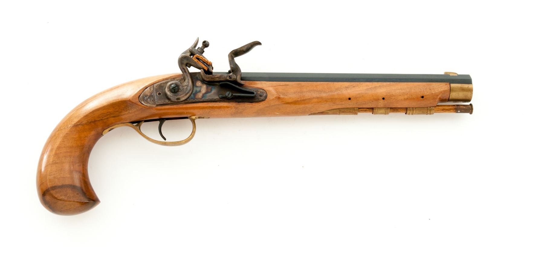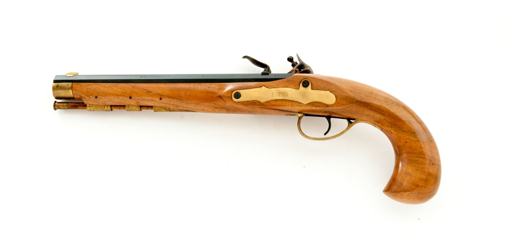 Modern Made Kentucky Style Single Shot Flintlock Pistol, #3734, .45 cal., 9-3/4'' blued octagonal barrel with brass dovetailed blade front sight and notched steel rear, marked ''Intercontinental Arms Inc.'' and ''Cal. 44'' on top flat and ''Kentuckian'' (twice) with proofmarks and serial number on left angled flat; case hardened border-engraved lockplate, hammer and pan; brass sideplate engraved ''R. Fries''; brass triggerguard, nosecap and three octagon-shaped ramrod thimbles; brass-tipped hardwood ramrod. Nicely shaped and varnished light-colored hardwood fullstock. Condition is as new and apparently unfired, showing only the lightest handling marks to stock. Action is smooth and tight; bore is shiny with distinct rifling. Est.: $100-$200. (No FFL Required)