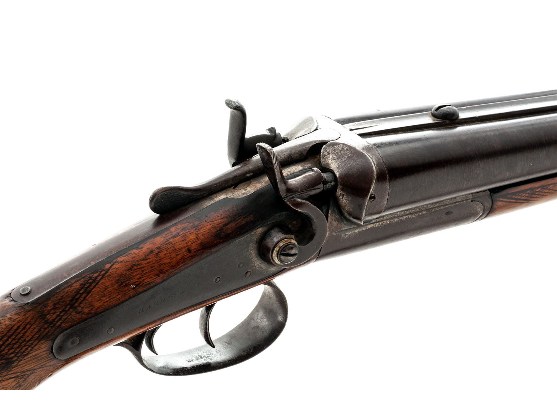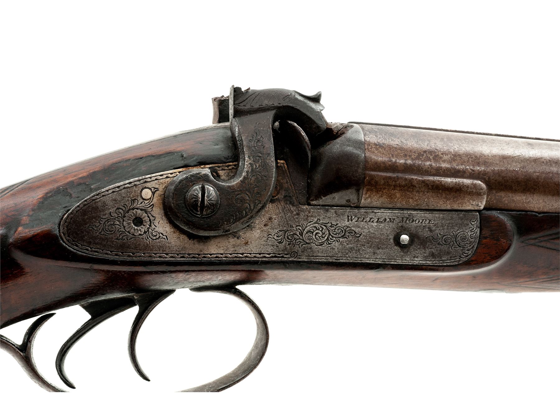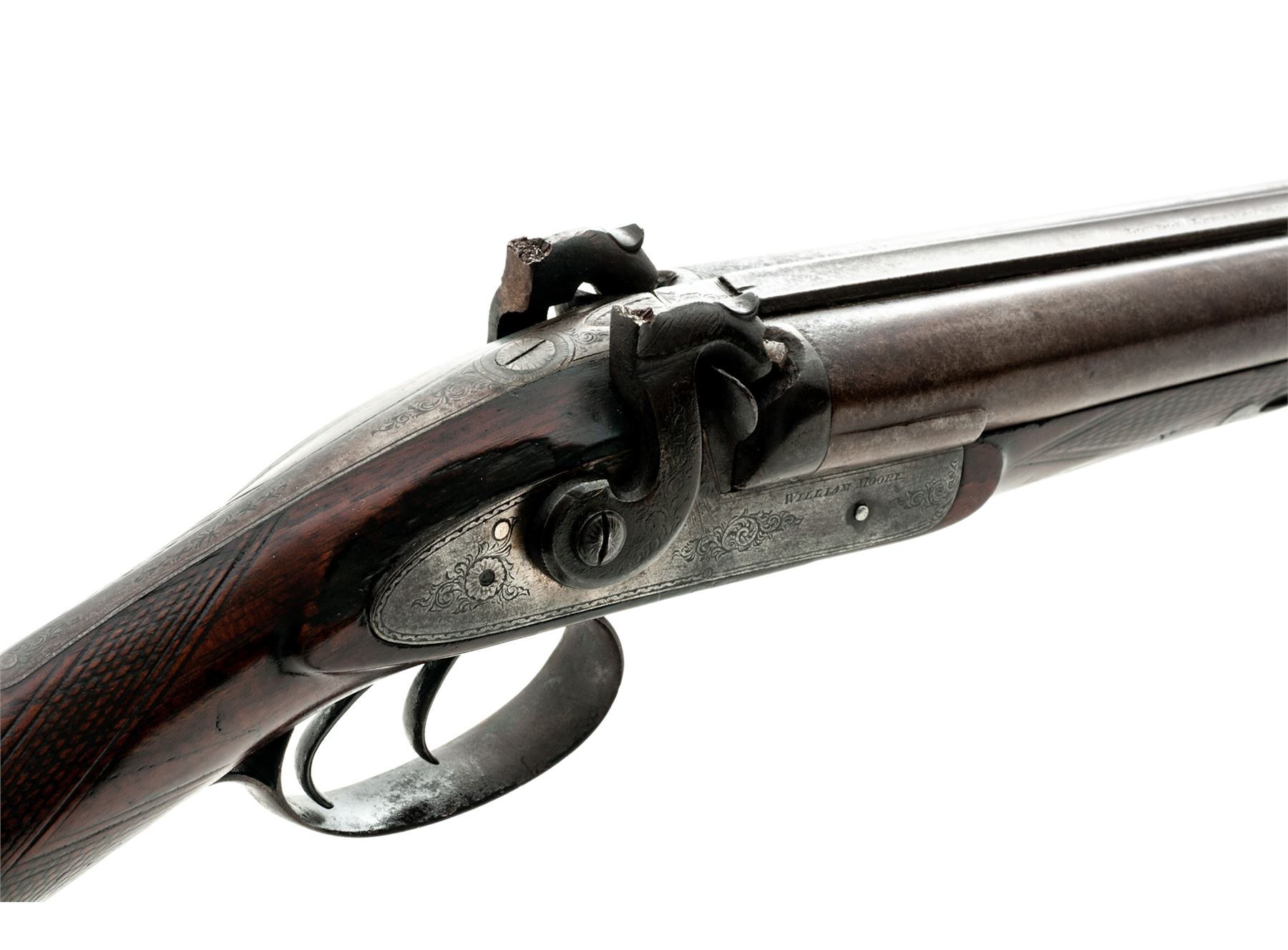 Lot of Two (2) Antique Side-by-Side Shotguns: (1) William Moore 12 ga. percussion, with lightly engraved sideplates and triggerguard, double triggers, checkered stock and forearm, and steel buttplate. Condition is fair overall with broken hammers and damaged forend. Checkering has worn smooth on buttstock and forend, with burn marks around sideplate. (2) Harris Co. 12 ga., double triggers, top rib marked ''Belgian Twist''. Condition is fair overall with one broken hammer, loss at toe and buttplate. Stock has been sanded with checkering worn smooth. Great wallhangers. Est.: $200-$300/lot. (Antique)