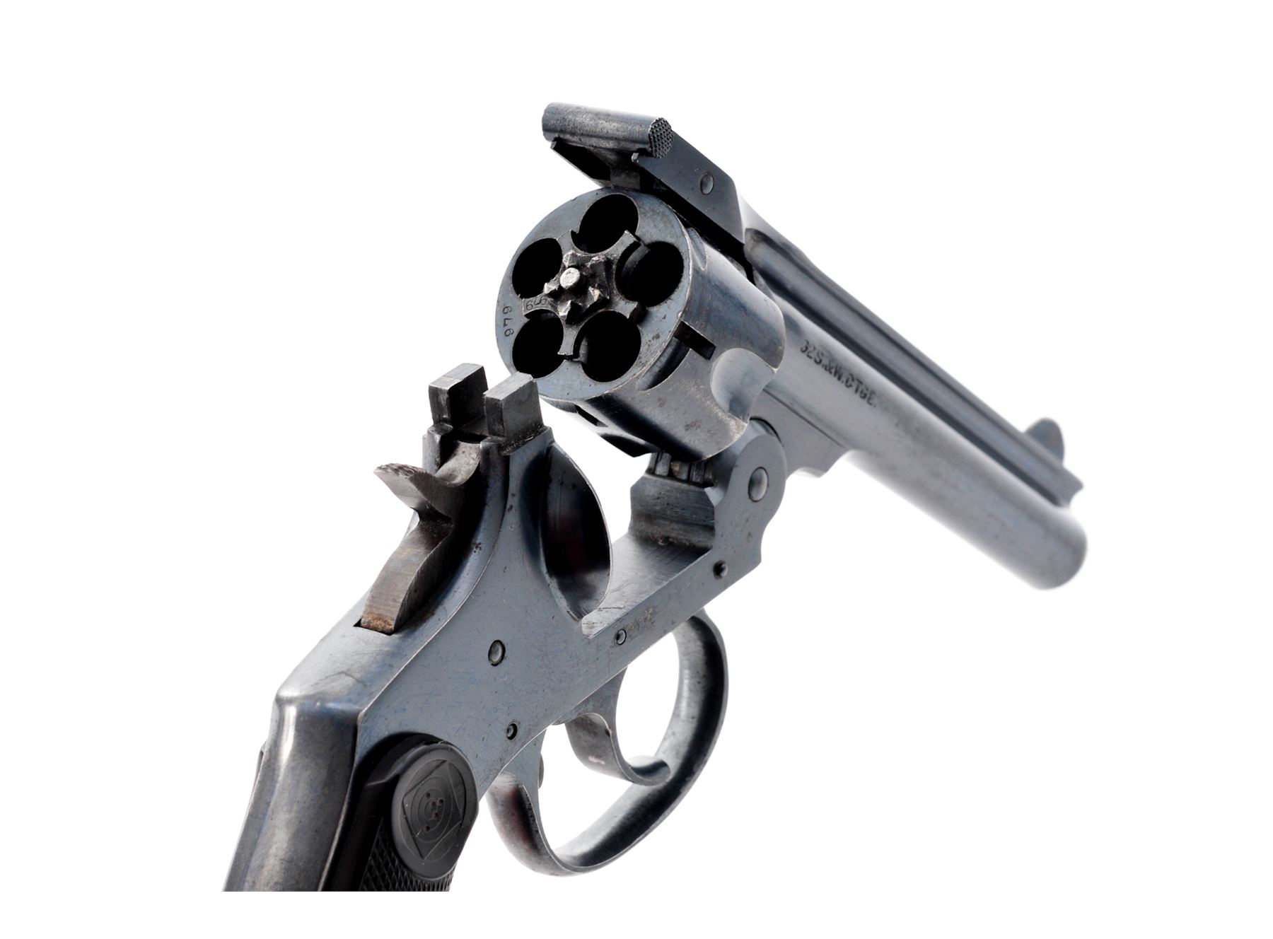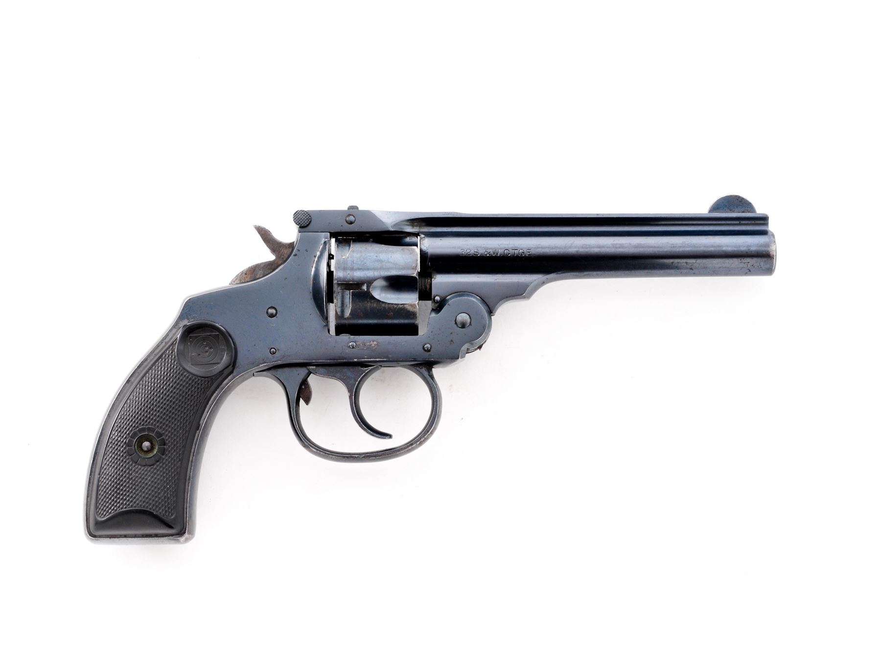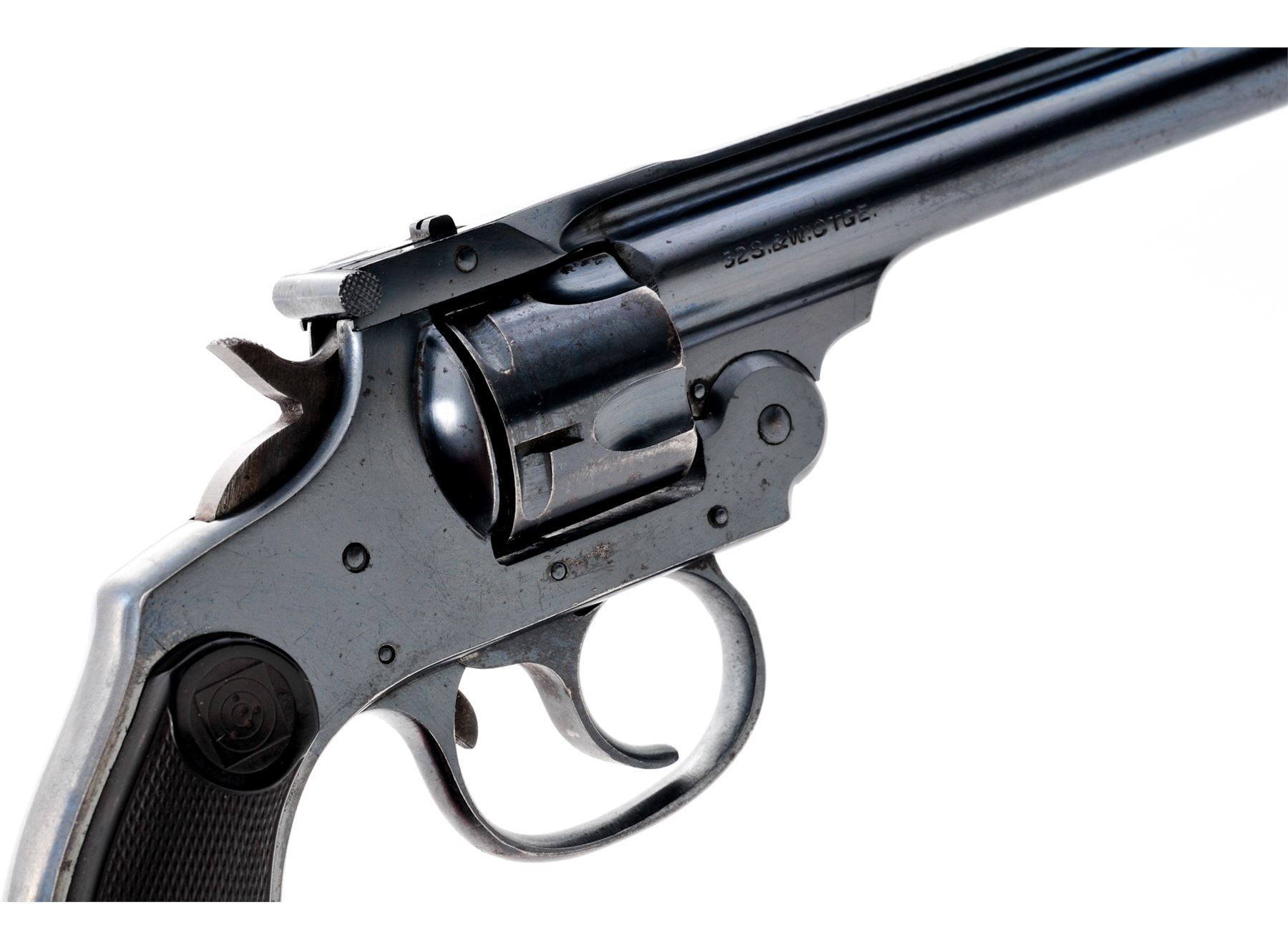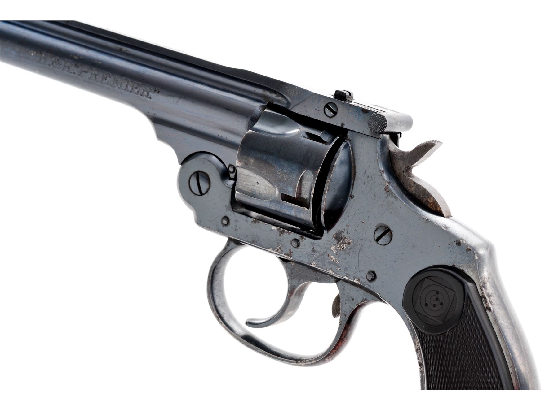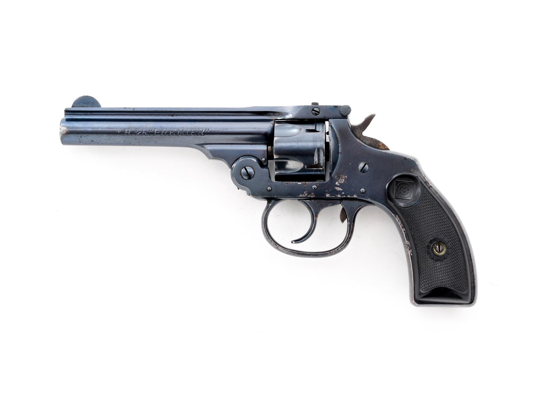 Harrington & Richardson ''Premier'' Double Action Revolver, #490979, .32 S&W cal., 4'' barrel, blue finish, case hardened hammer, checkered hard rubber grips with ''H&R Target Logo'', round front sight, rear sight is integral with the latch. Metal surfaces retain approx. 95% of a high polished blue finish and rate as very good overall, with scattered reddish brown surface freckling and some intermittent patches of fine pitting, most noticeably on the left side of frame. Grips are near excellent with clean checkering and show only light handling marks. Barrel address, etc. is clear. Good action, excellent bore with deep rifling. Est.: $100-$150. (C&R)