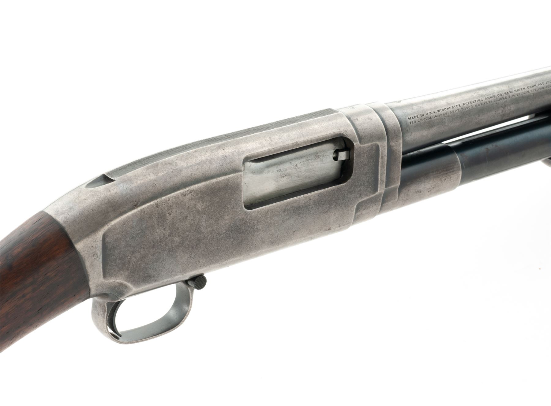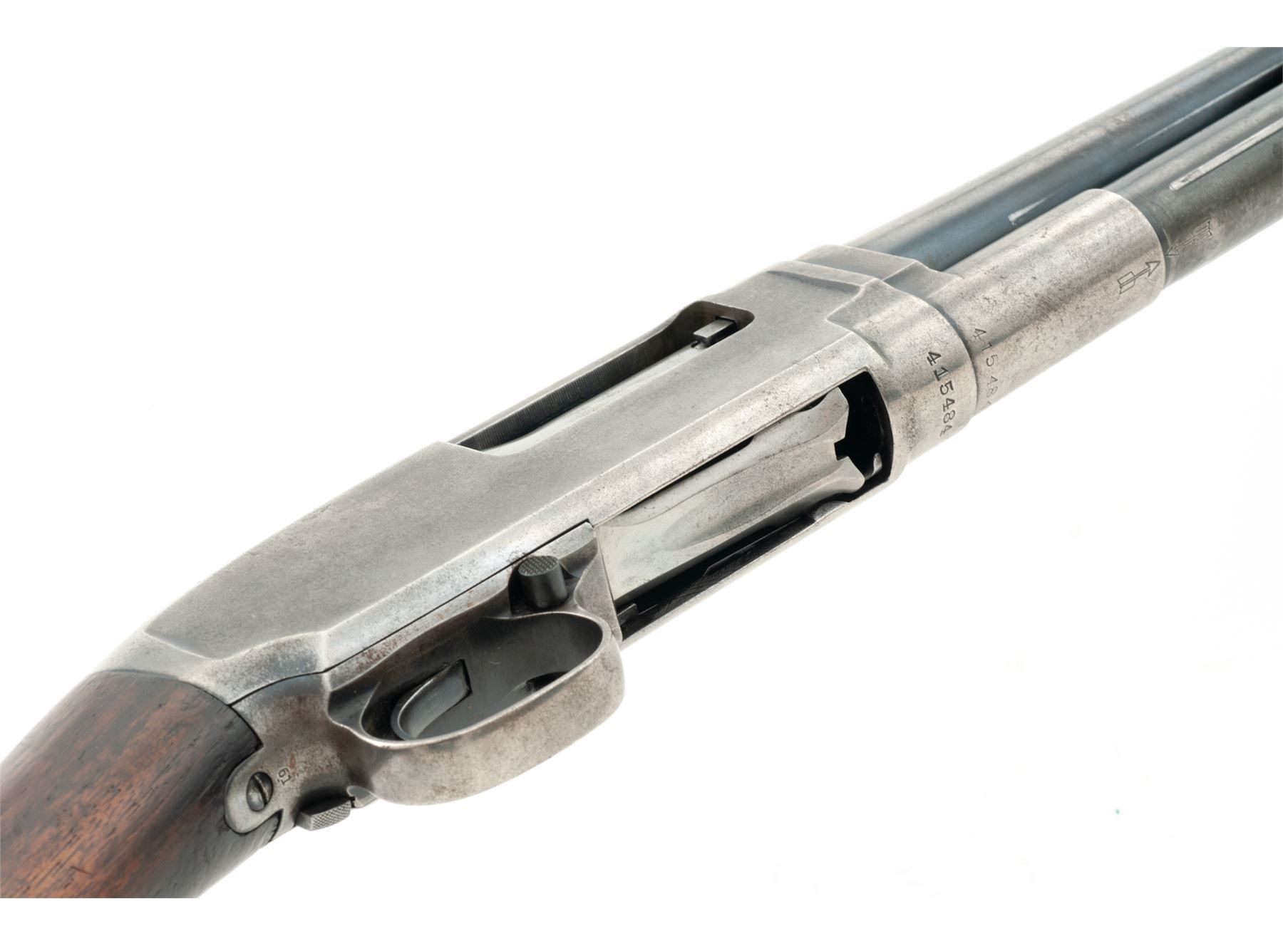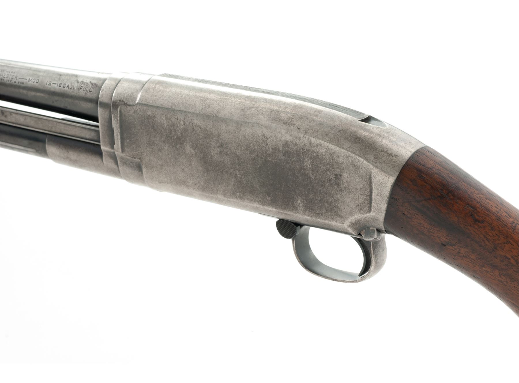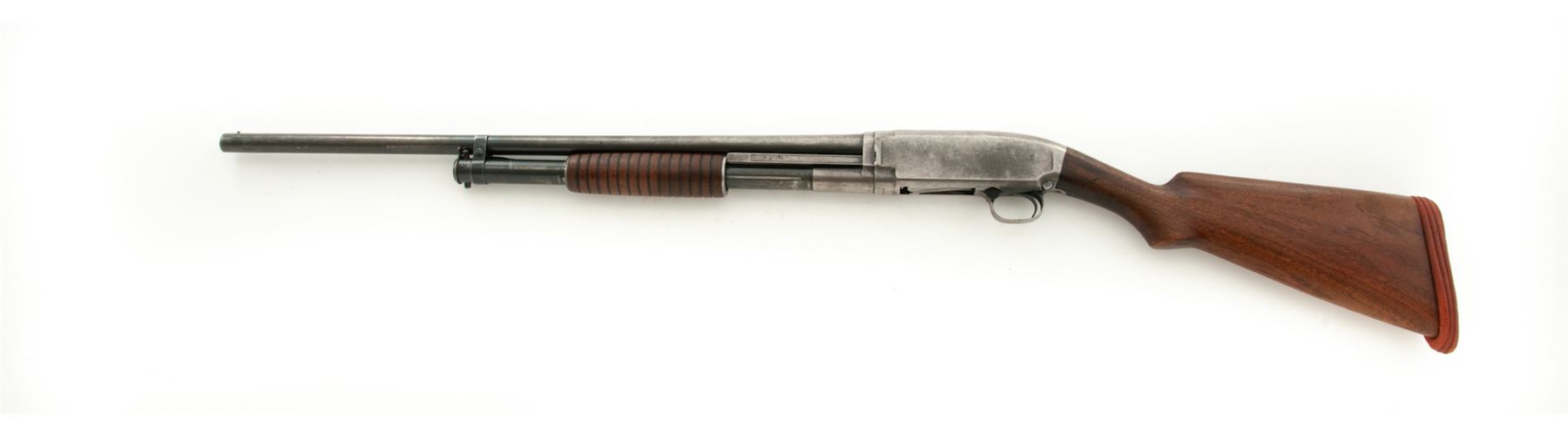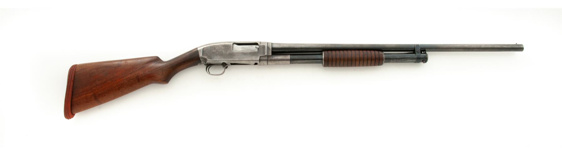 Mid-20's Winchester Model 12 Slide-Action Shotgun, #415484, plain 16 ga., nickel steel barrel has been cut to 25.5'', CYL bore (barrel is marked MOD), smooth pistol grip walnut stock and 14-groove forend, non-factory red rubber recoil pad, with brass bead front sight. Top of barrel and receiver are both Winchester proofed. Mfg'd 1925. Condition is fair overall. Metal with approx. 15%-20% blue finish, balance is silvery gray with some darkening. Barrel with a little bit of light pitting and a few small dents around 1''-2'' down from the muzzle. Factory lettering is legible. Buttstock with little remaining finish and shows age and wear consistent with the rest of the shotgun. Worn pad needs replacement; Length of pull to wood is 13-3/8''. Forend is good. Very good action and bright bore. Est.: $150-$250. (C&R)