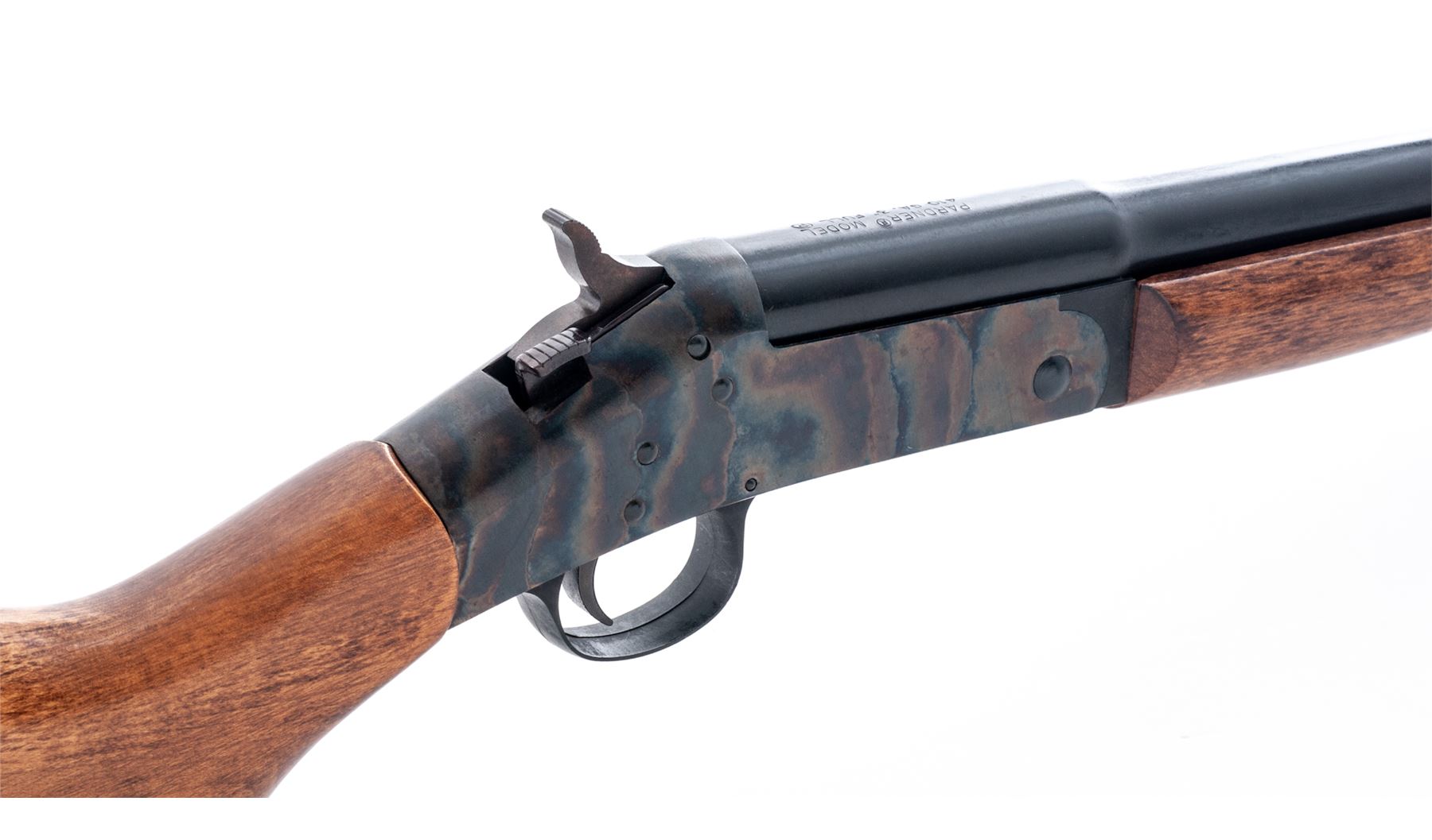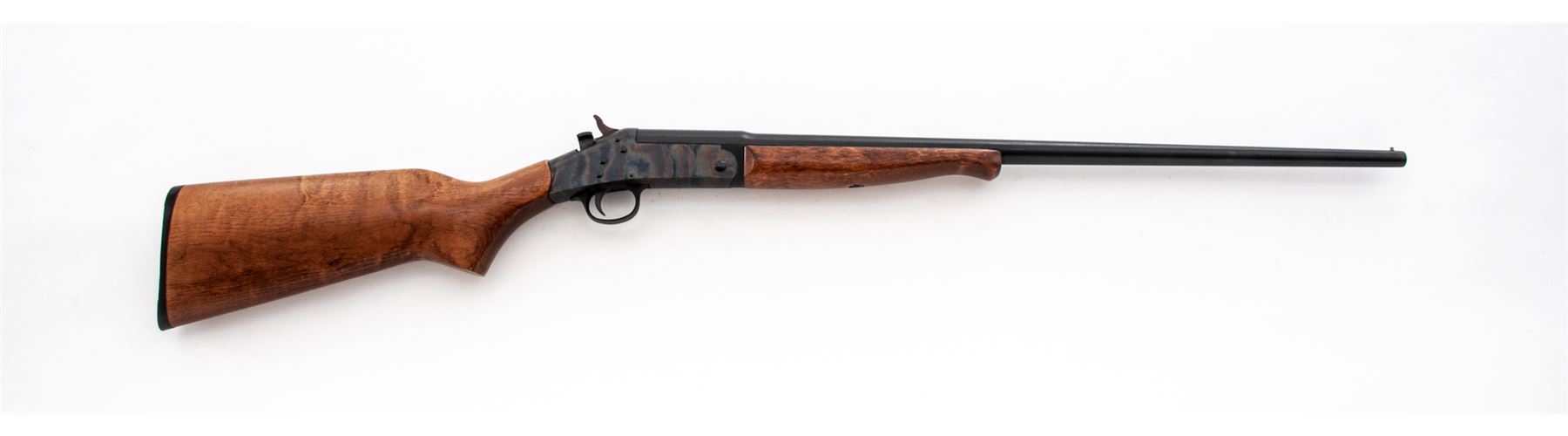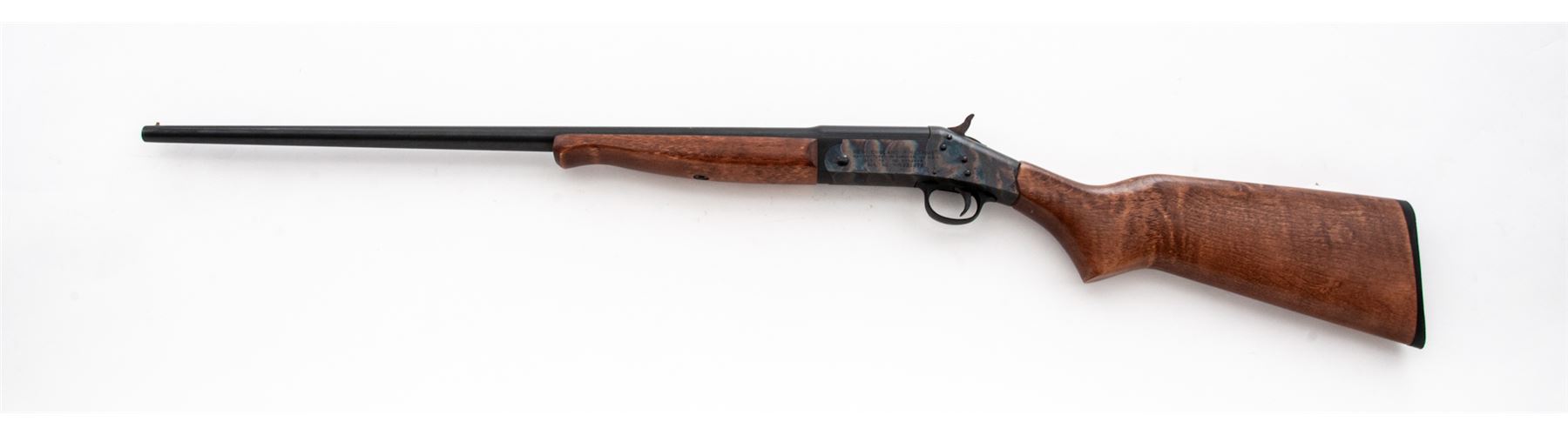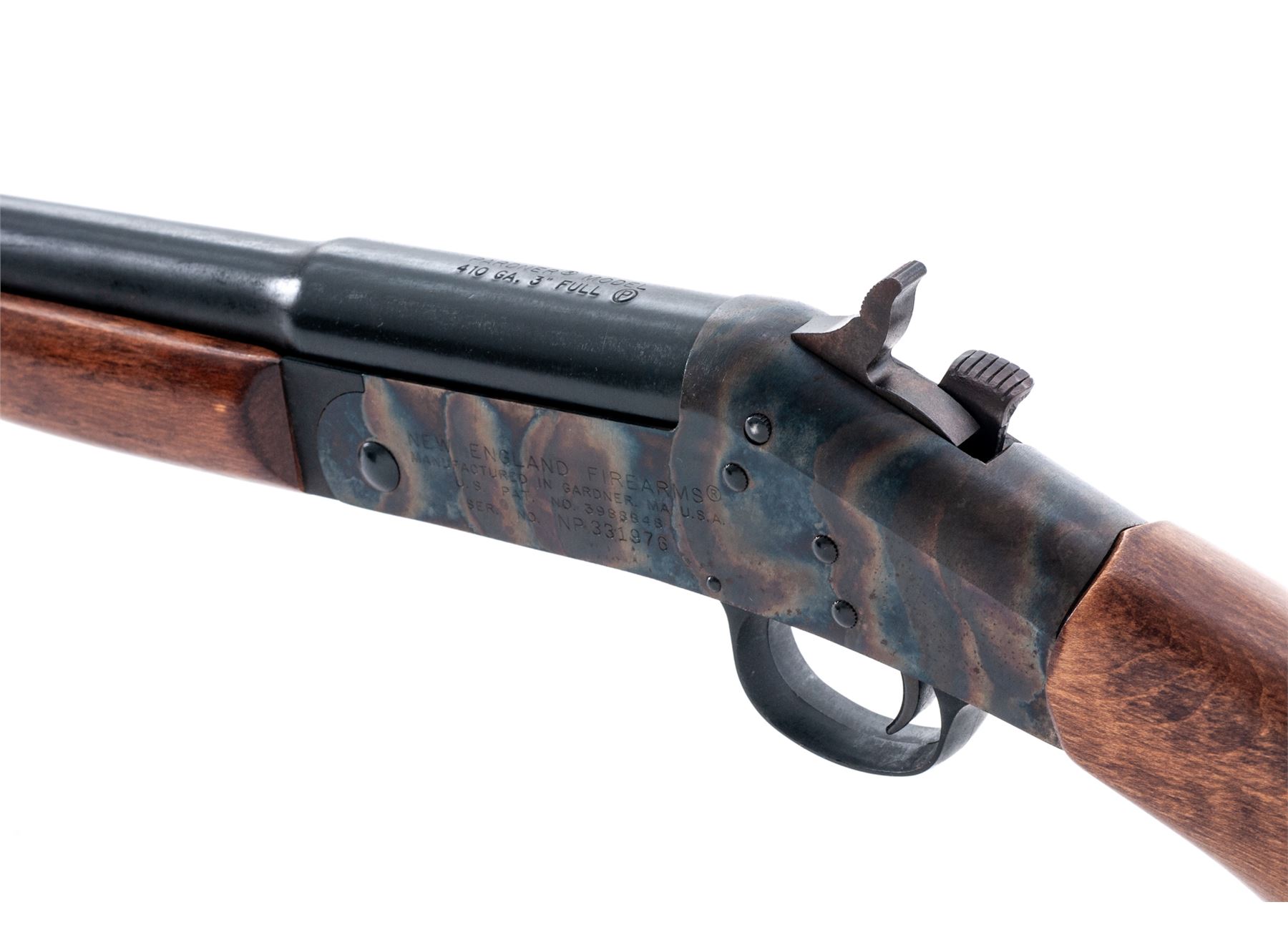 New England Firearms ''Pardner'' Model Single Barrel Shotgun, #NP331976, .410 ga., 26'' round barrel with bead front sight and auto extractor is choked F; plain oil-stained walnut forend with semi-Schnabel tip and pistol-grip buttstock with grooved black plastic buttplate having the ''NEF'' logo in a circular relief panel. Condition is excellent, the barrel retaining approx. 95% original blue with scratches at muzzle; the receiver showing fiery case colors. Stocks are smooth, solid and unmarked. Action is tight; bore is bright except for a few inches from breech. Est.: $100-$200. (Modern)