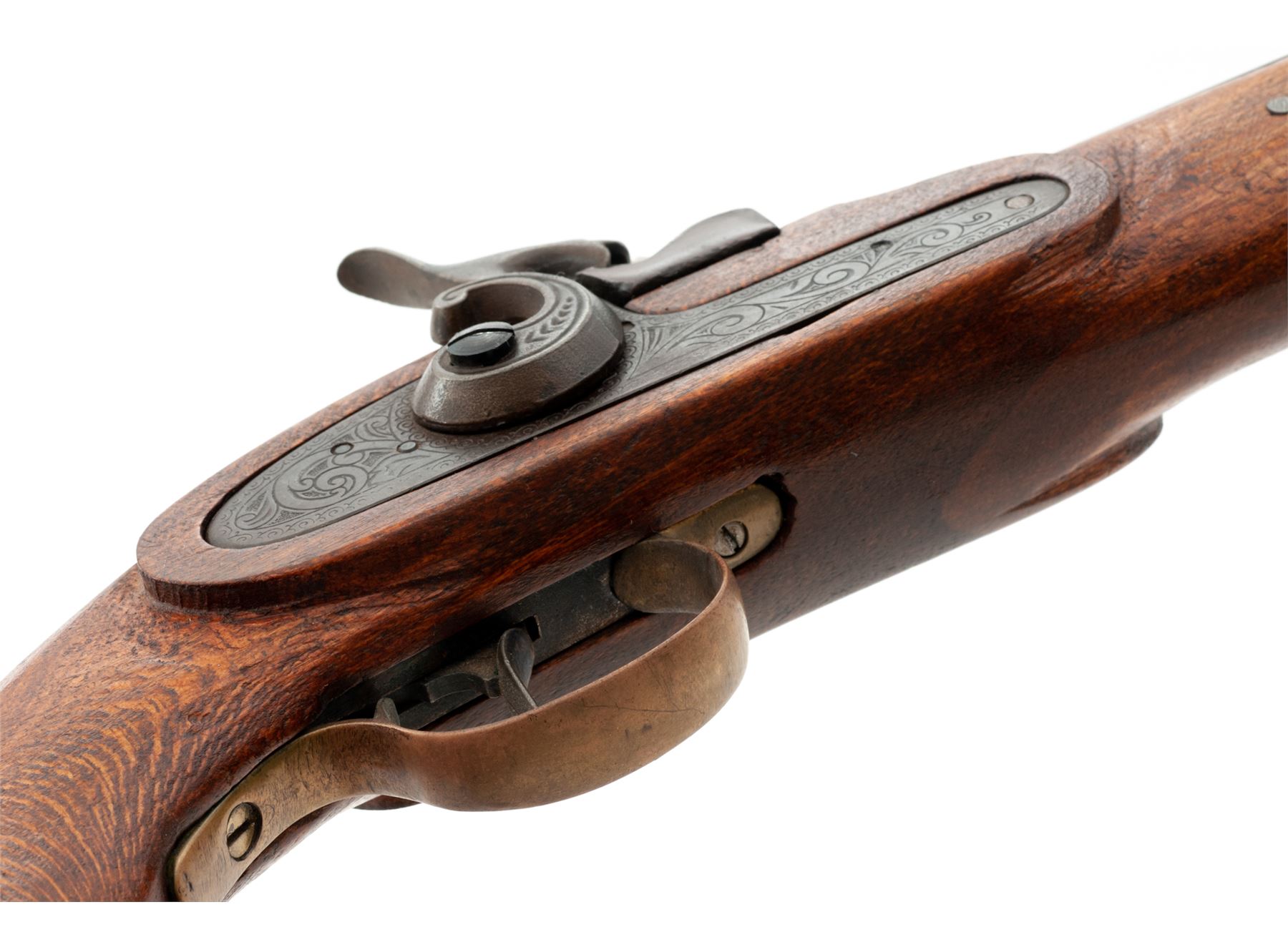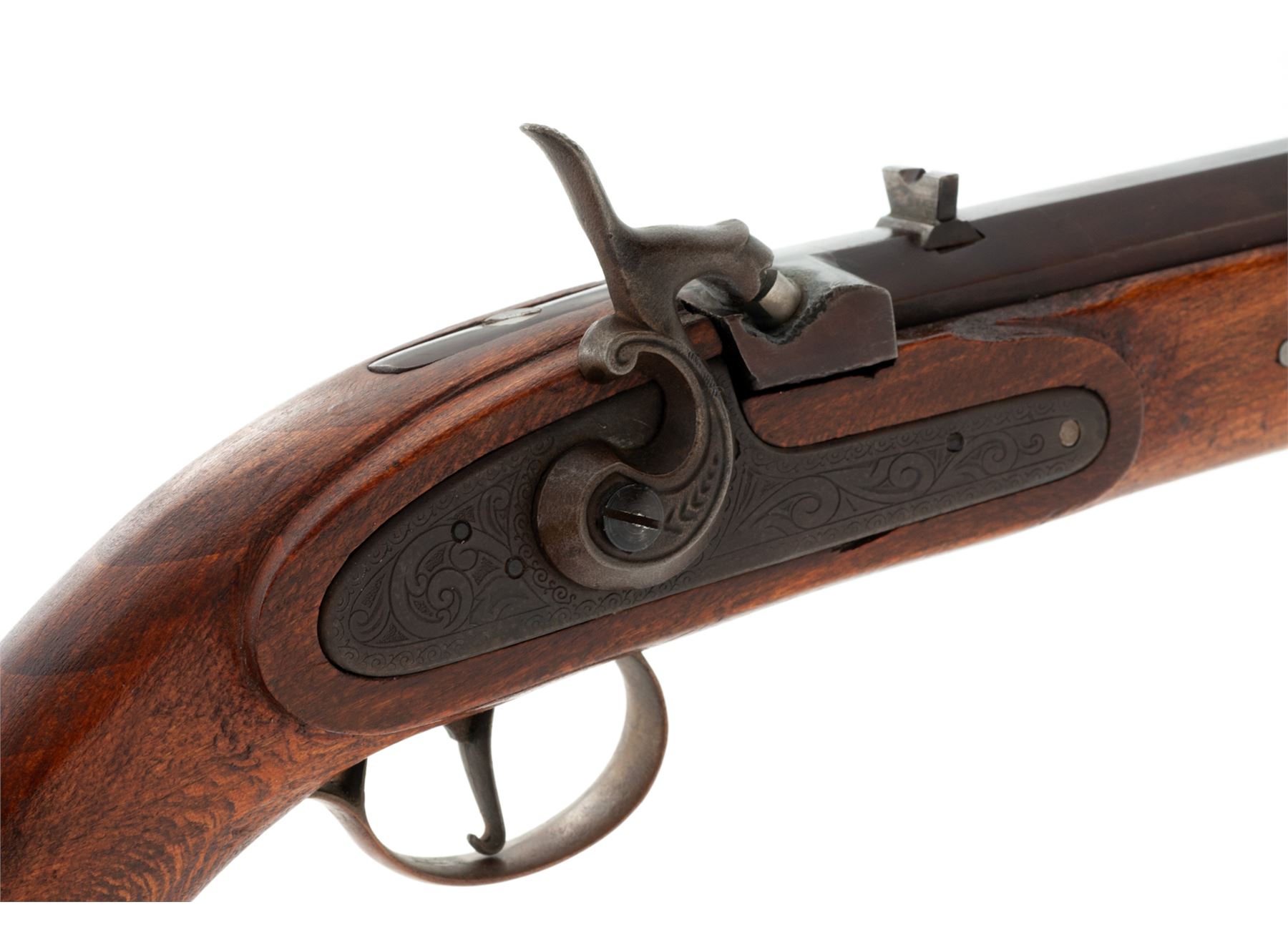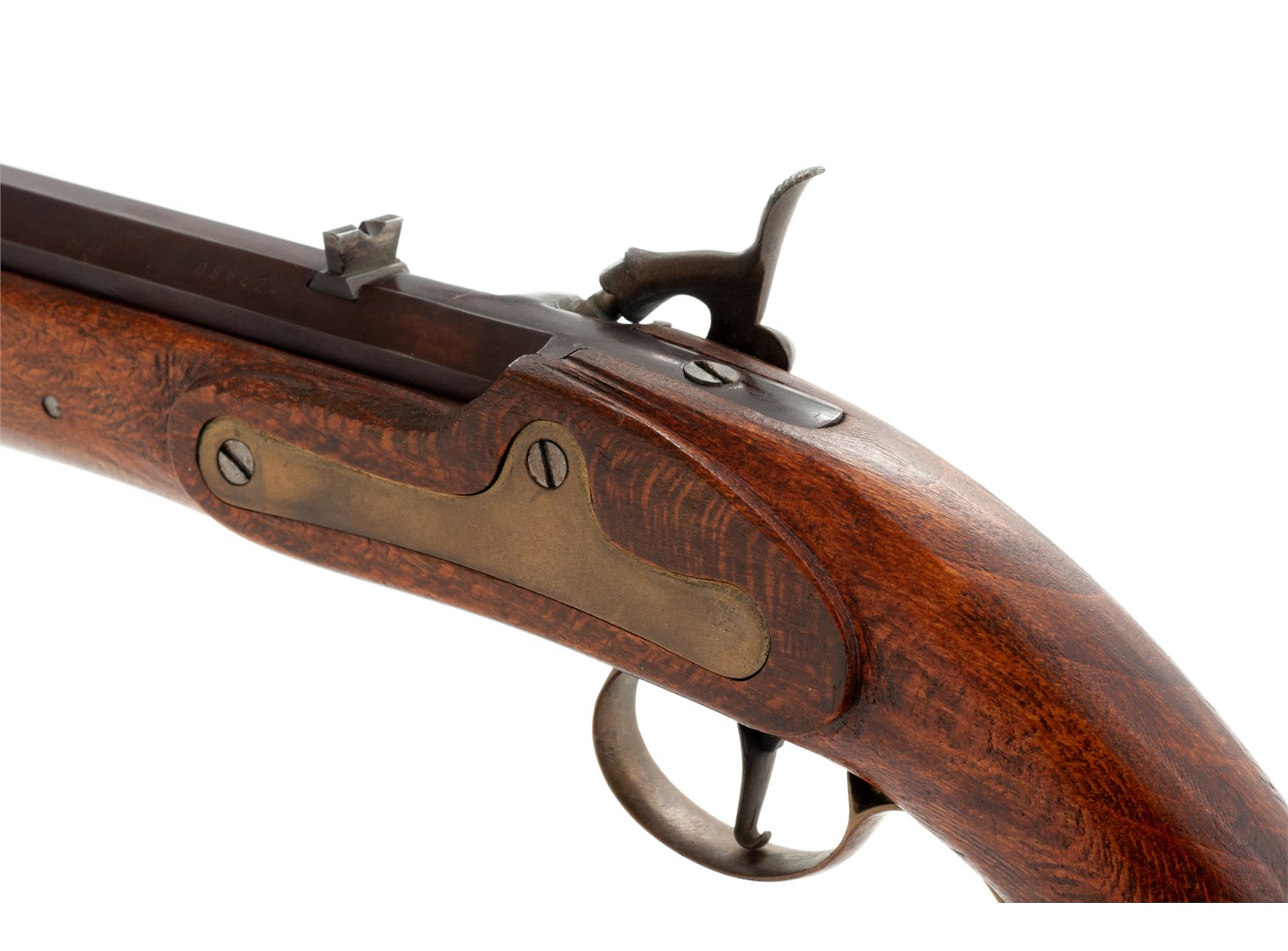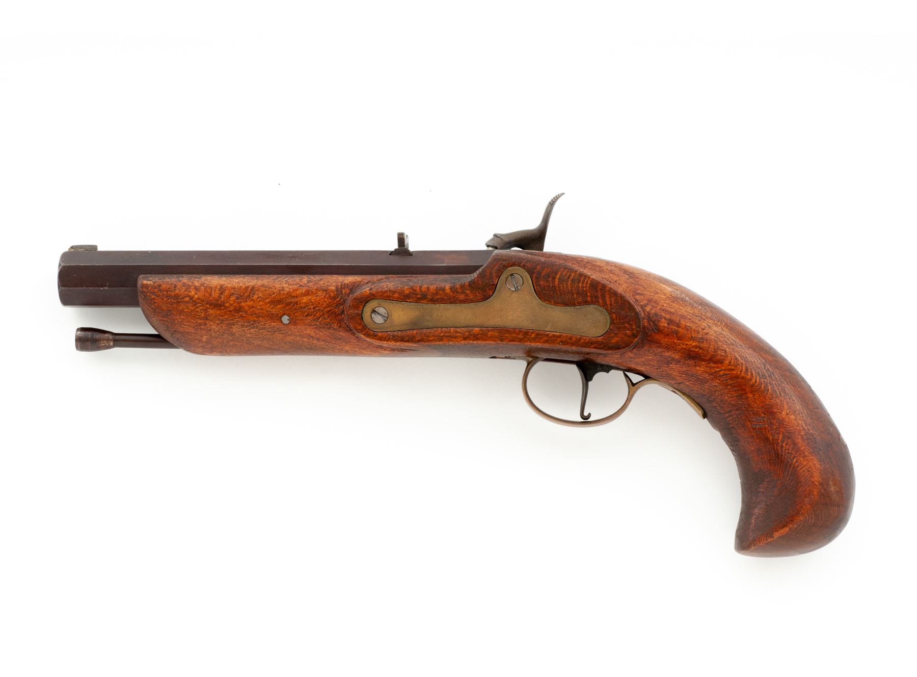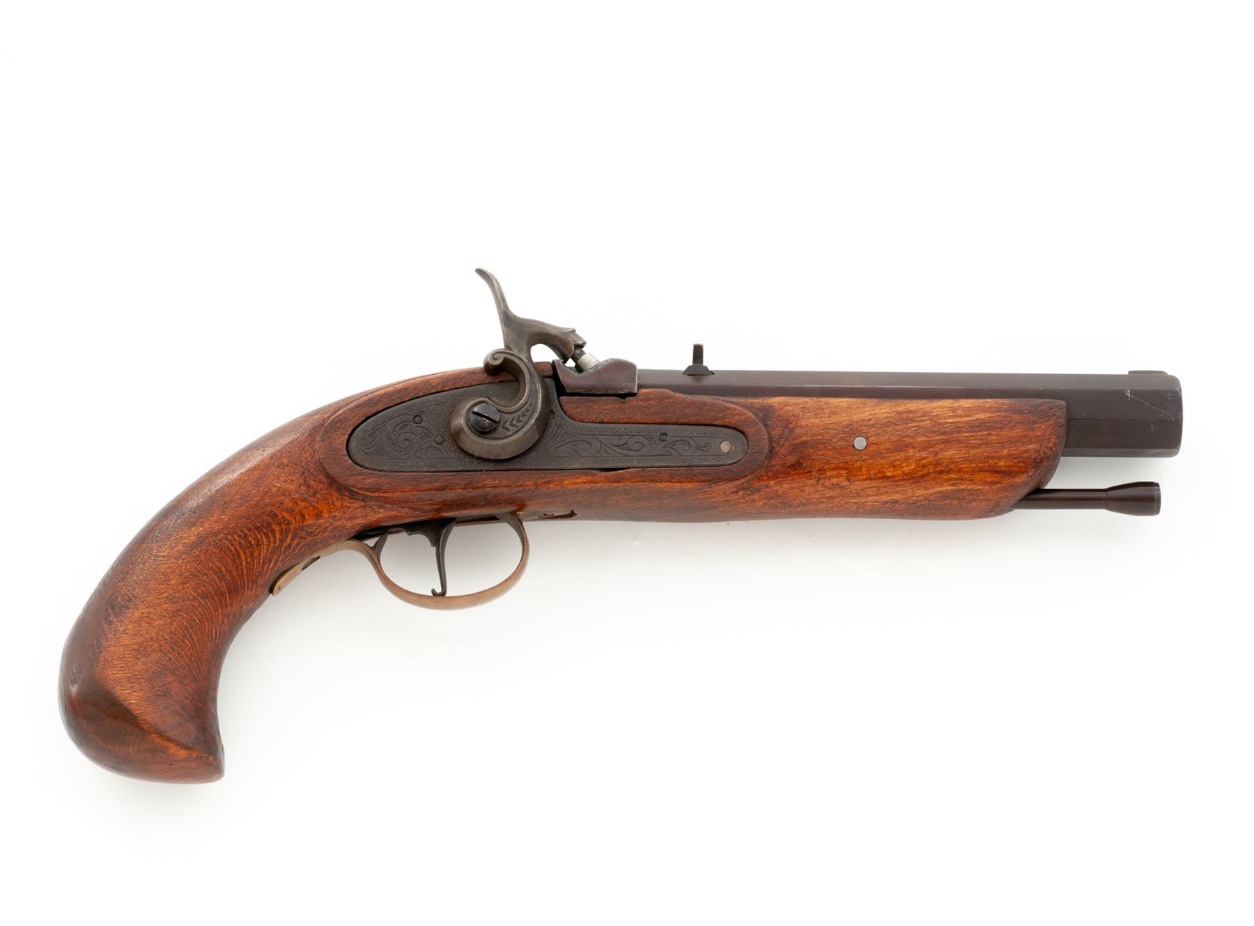 Modern Made Single Shot Percussion Pistol, #098424, approx. .48 cal., 6.75'' octagonal barrel with low brass blade front sight and large V-notch rear is marked ''Blackpowder Only'' and perhaps ''Chuukar'' (indistinct), along with the serial number on left angled flat. Steel lockplate is floral engraved but otherwise unmarked, hammer with distinct curved profile and high spur, brass sideplate and triggerguard, trigger with early-style hook at bottom, steel tulip-head ramrod, with one-piece hardwood stock. Condition is very good to excellent, the barrel retaining most of its original brown finish and the brass an aged patina. Stock shows rather crude workmanship and could use finishing. Action is crisp; bore is clean with deep rifling. Est.: $150-$250. (No FFL Required)
