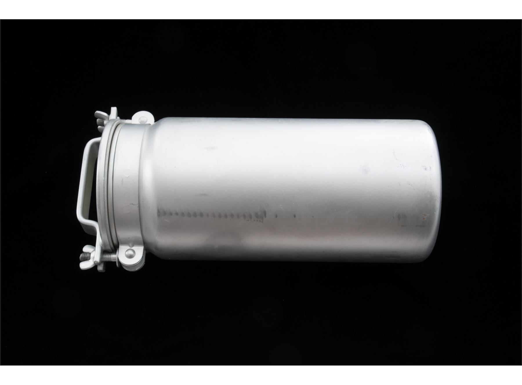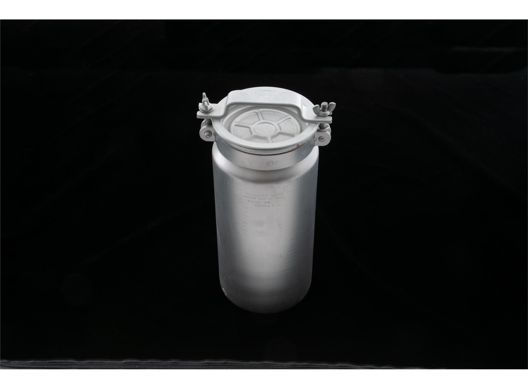 1945 Dated U.S. Navy Mk. 1 Mod. 1 Sample Powder Tank, mfg'd by T.A.C.U. Co., aluminum, 15'' tall, approx. 6'' across, water tight lid with rubber seal. In fine overall used condition. No major wear and the seal appears good. Est.: $40-$80.