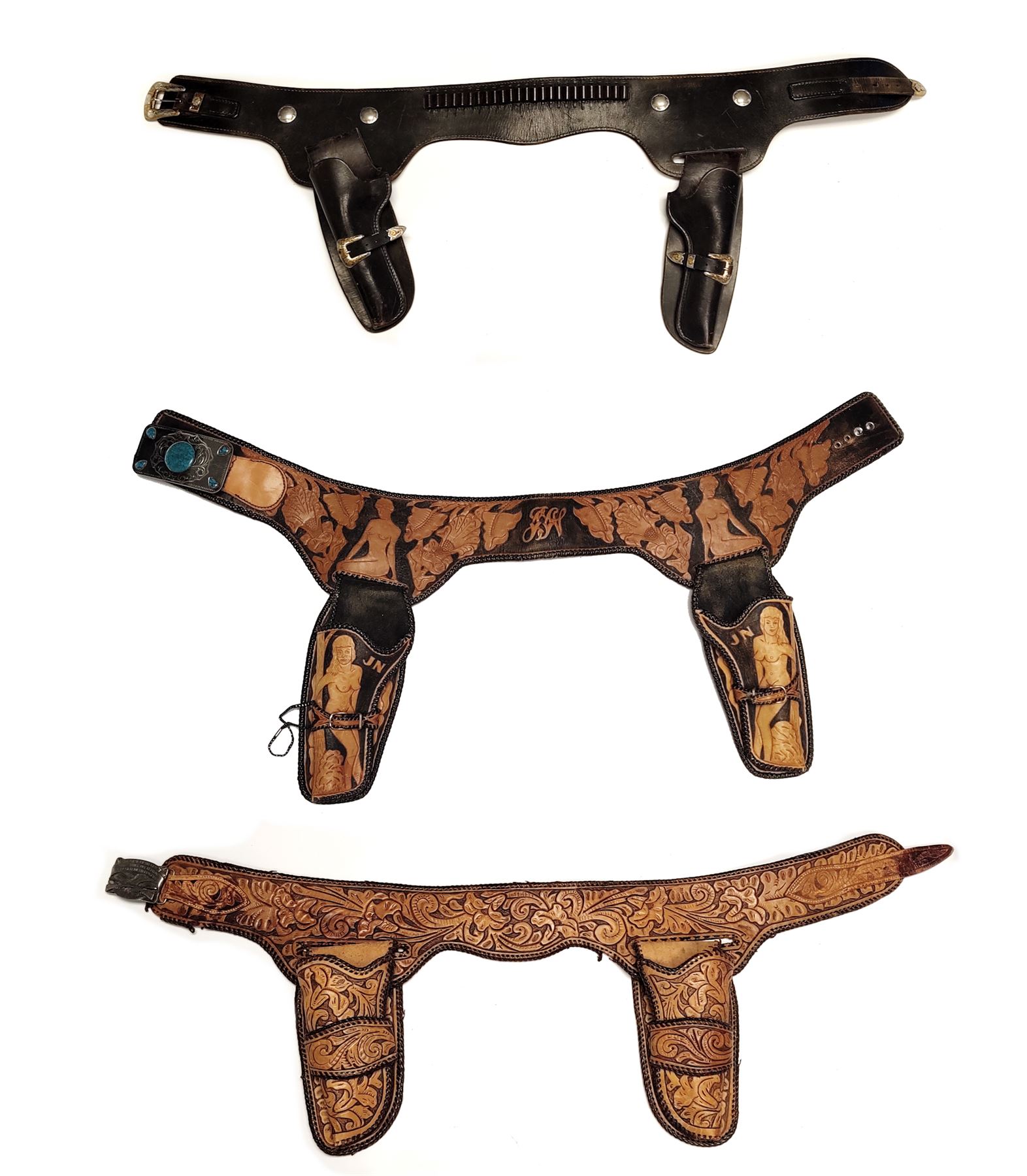 Lot of Three (3) Western Style Leather Holster and Belt Rigs: (1) Black leather rig, with four conchos; engraved buckles and belt tips marked ''Oswalde/Denver, CO/Solid Nickel''. (2) Floral carved double holster rig, with 2nd Amendment belt buckle, for 5-1/2'' single action. (3) Floral, leaf & nude carved double holster rig, for 5-1/2'' single action, with nickel silver engraved and turquoise belt buckle; initials ''JN'' to holster and back of belt. All three rigs are unmarked as to maker. Condition to all is good showing wear and use. Est.: $150-$250/lot.