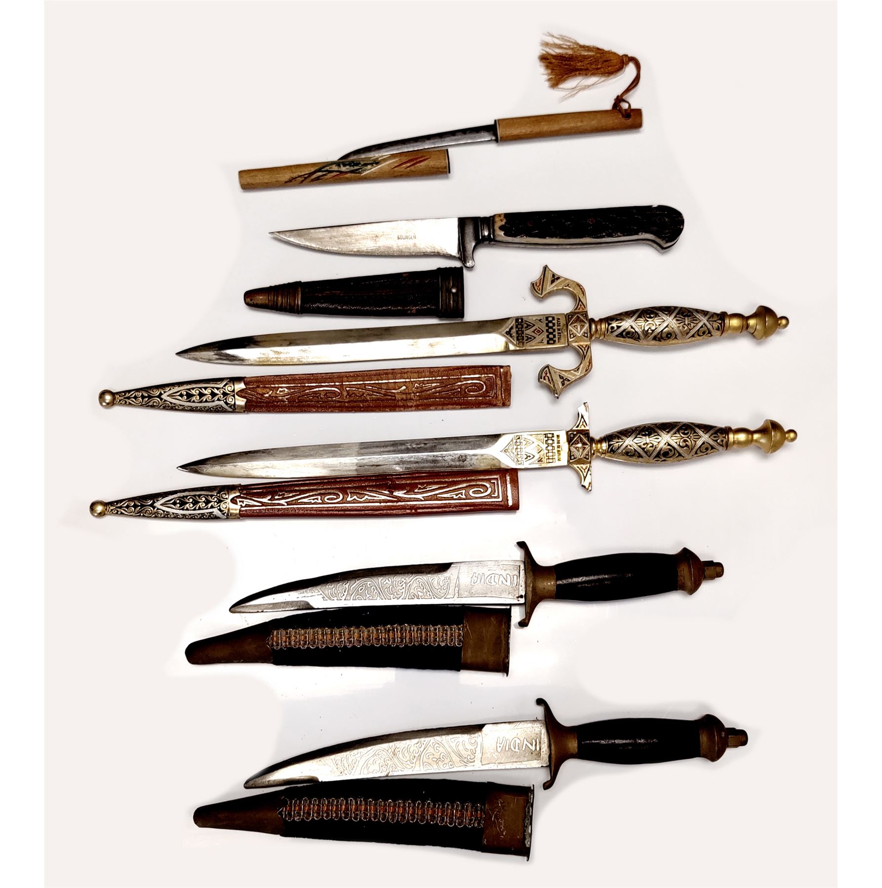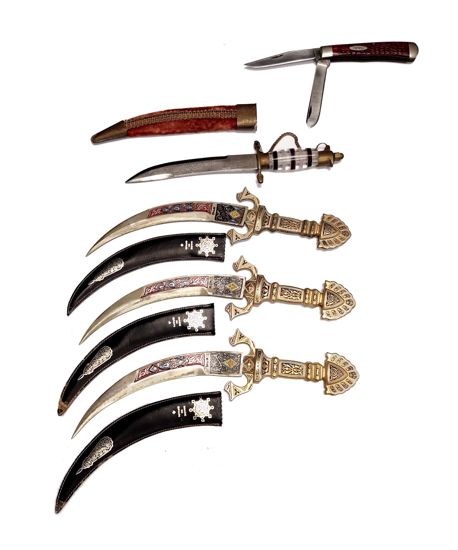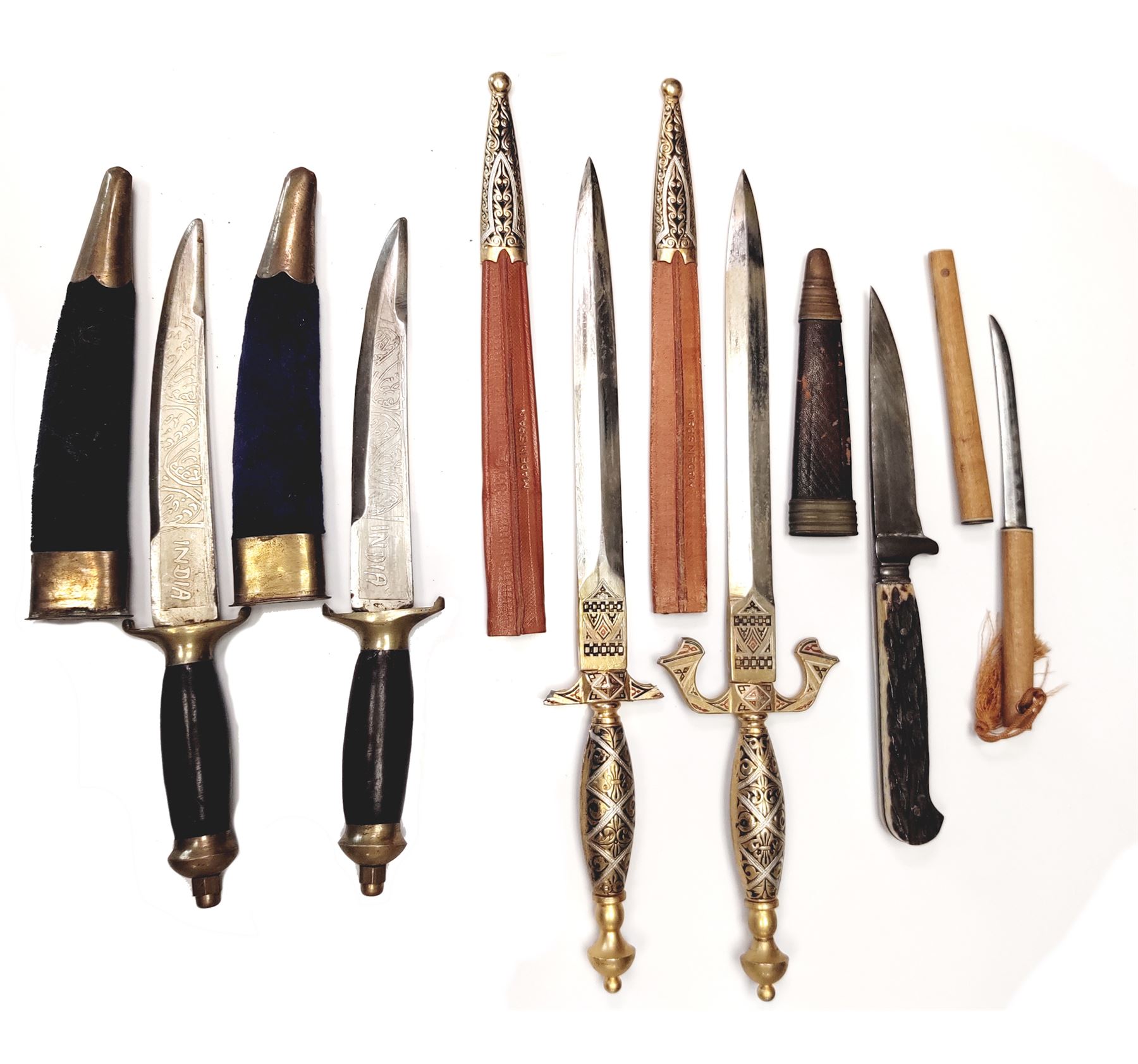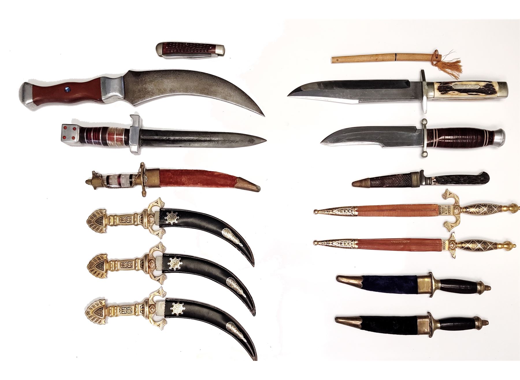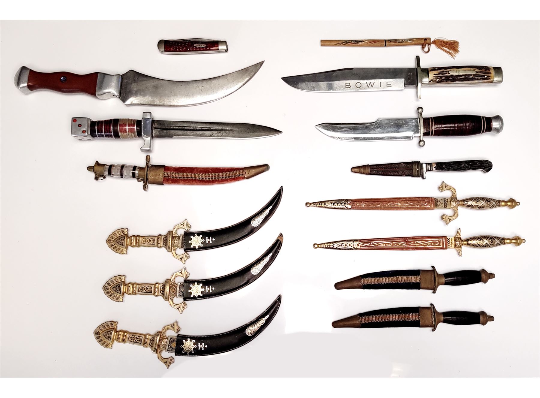 Lot of Fifteen (15) Misc. Knives, including a stag-handled Bowie, 8'' blade marked ''G.C. Co./Germany''; Bowie marked ''Soligen, Germany'' with 6'' blade; small stag-handled knife, 4'' blade marked ''Solingen'', in leather sheath; Case II folding knife, blade marked ''Tested XX Razor Edge''; one 14.5'' curved blade knife, unmarked; one 12'' knife with Lucite grip and dice pommel; along with nine (9) Middle Eastern style decorative knives in sheaths. Conditions range from fair to good. Est.: $150-$250/lot.