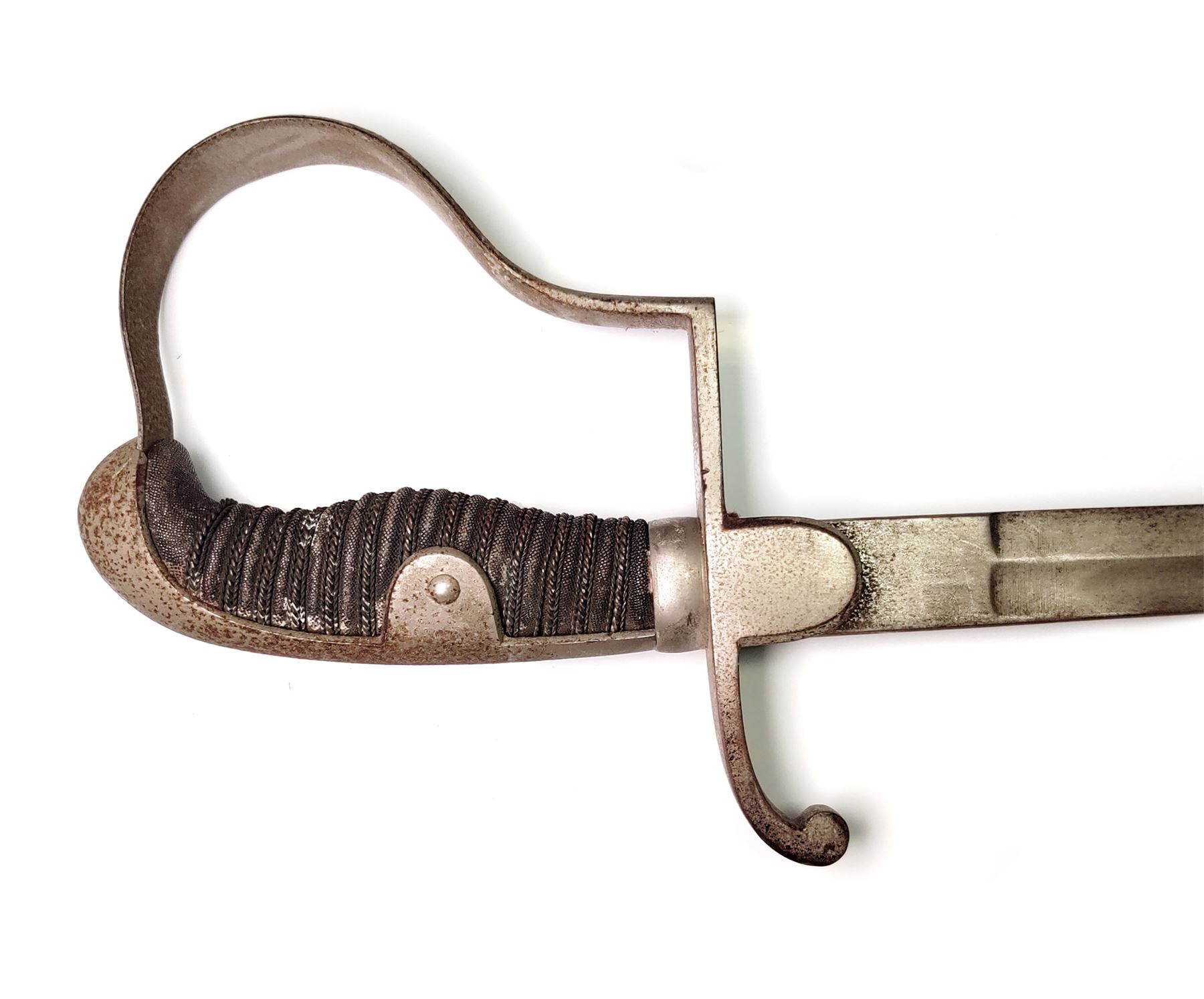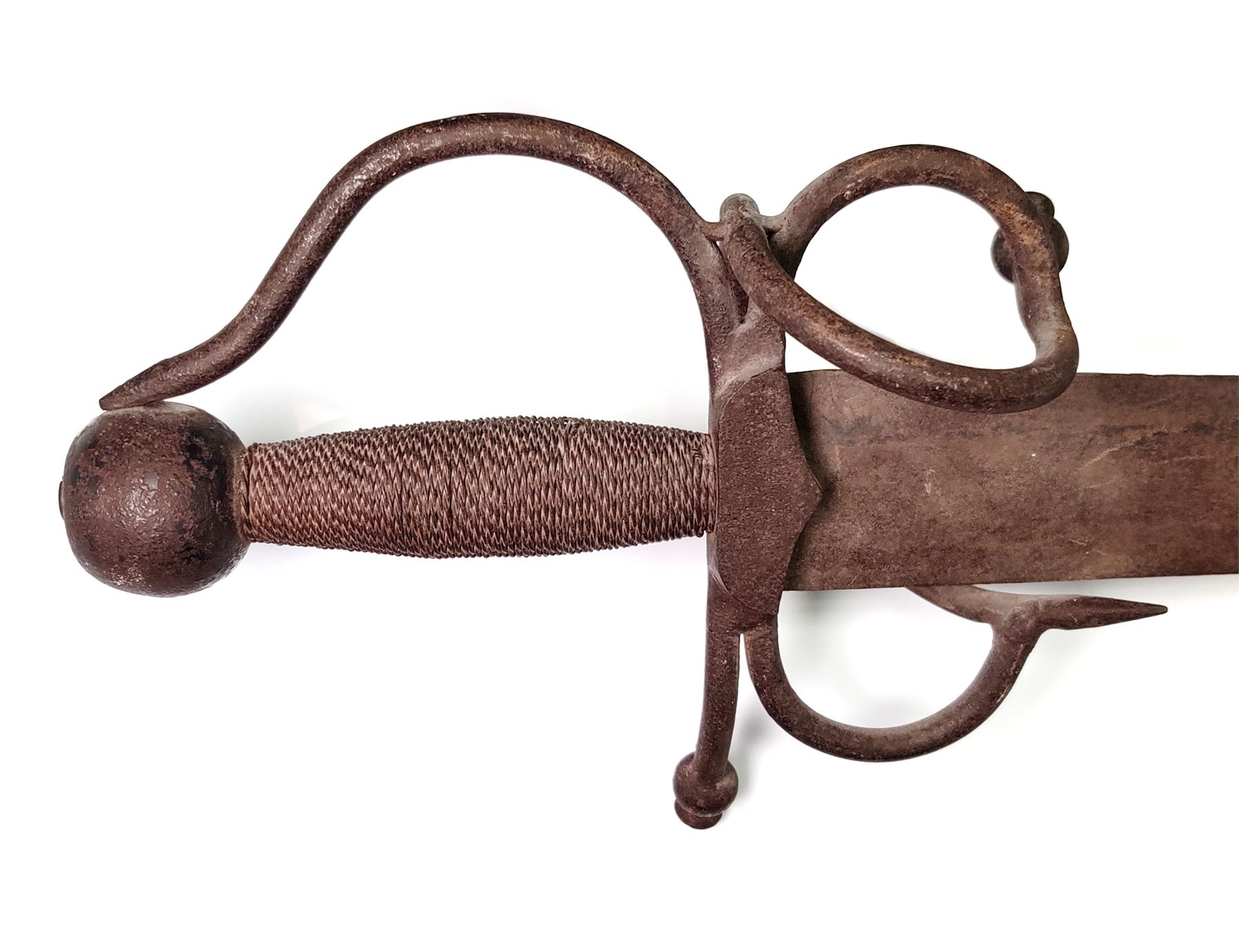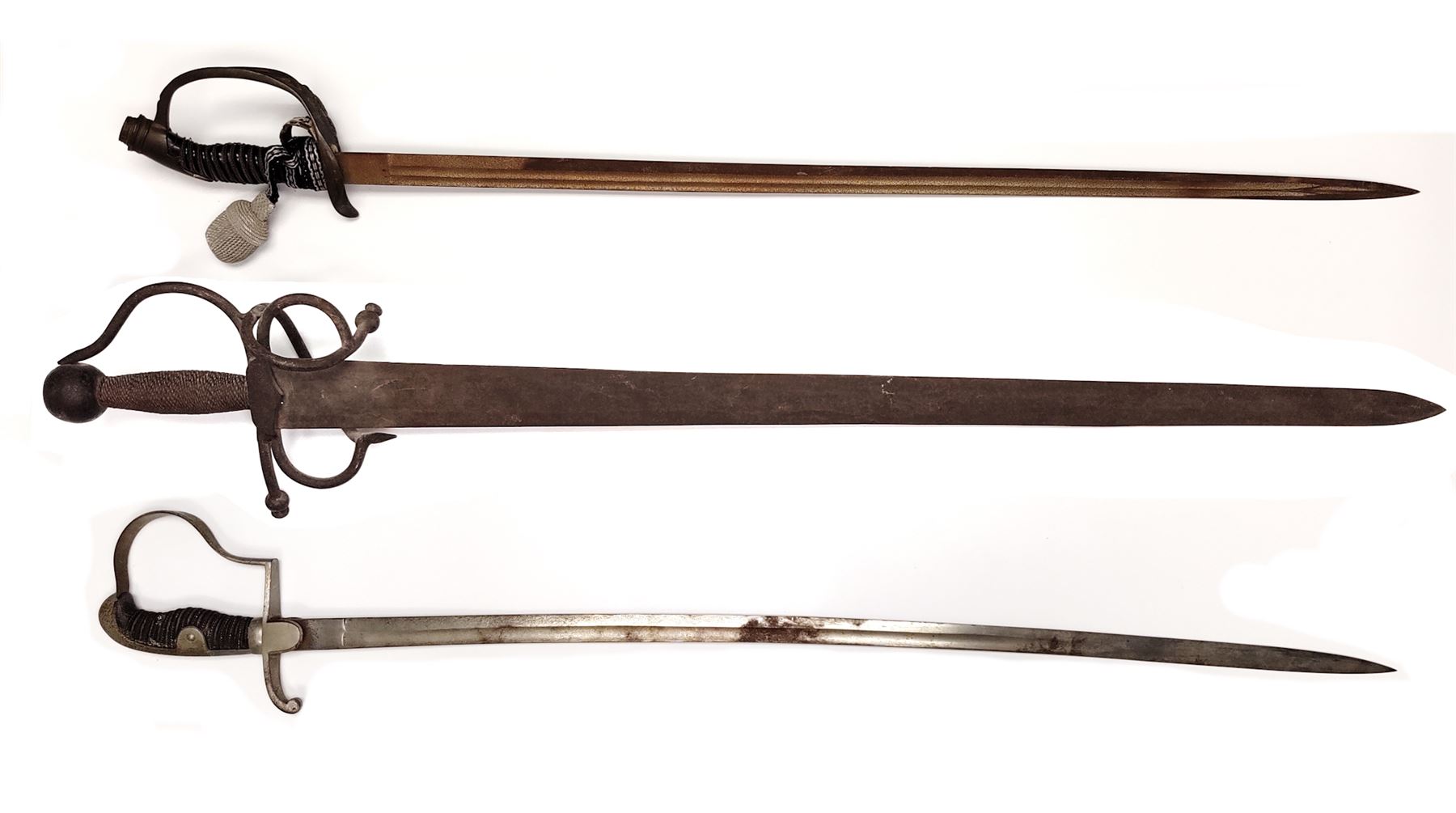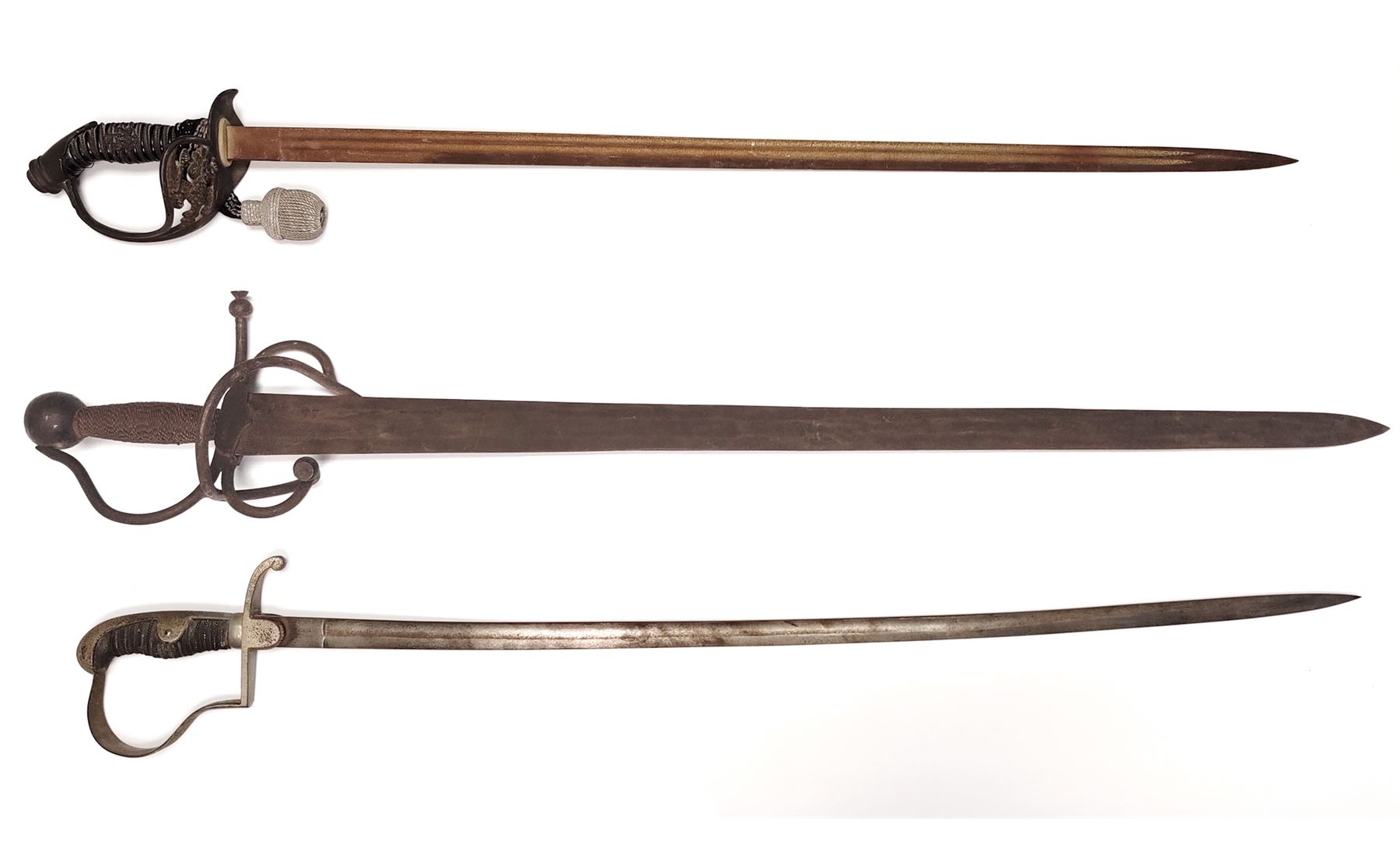 Lot of Three (3) Misc. Swords: (1) Imperial German Enlisted Sword, 31.5'' blade, with nickel-plated dove's head pommel. Wire-wrapped grip remains intact. (2) Imperial Army Sword, 31.5'' blade, with pierced guard featuring Prussian bird with crown. Wire-wrapped grip and emblem intact. Later era frog attached. (3) Reproduction English back sword, 33'' blade, with wire-wrapped grip. All are in fair to good condition. All blades are well rusted and unmarked. Est.: $150-$250/lot.