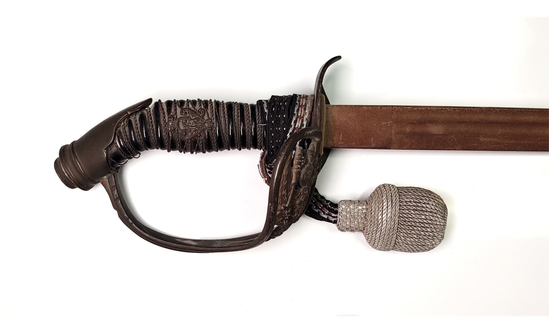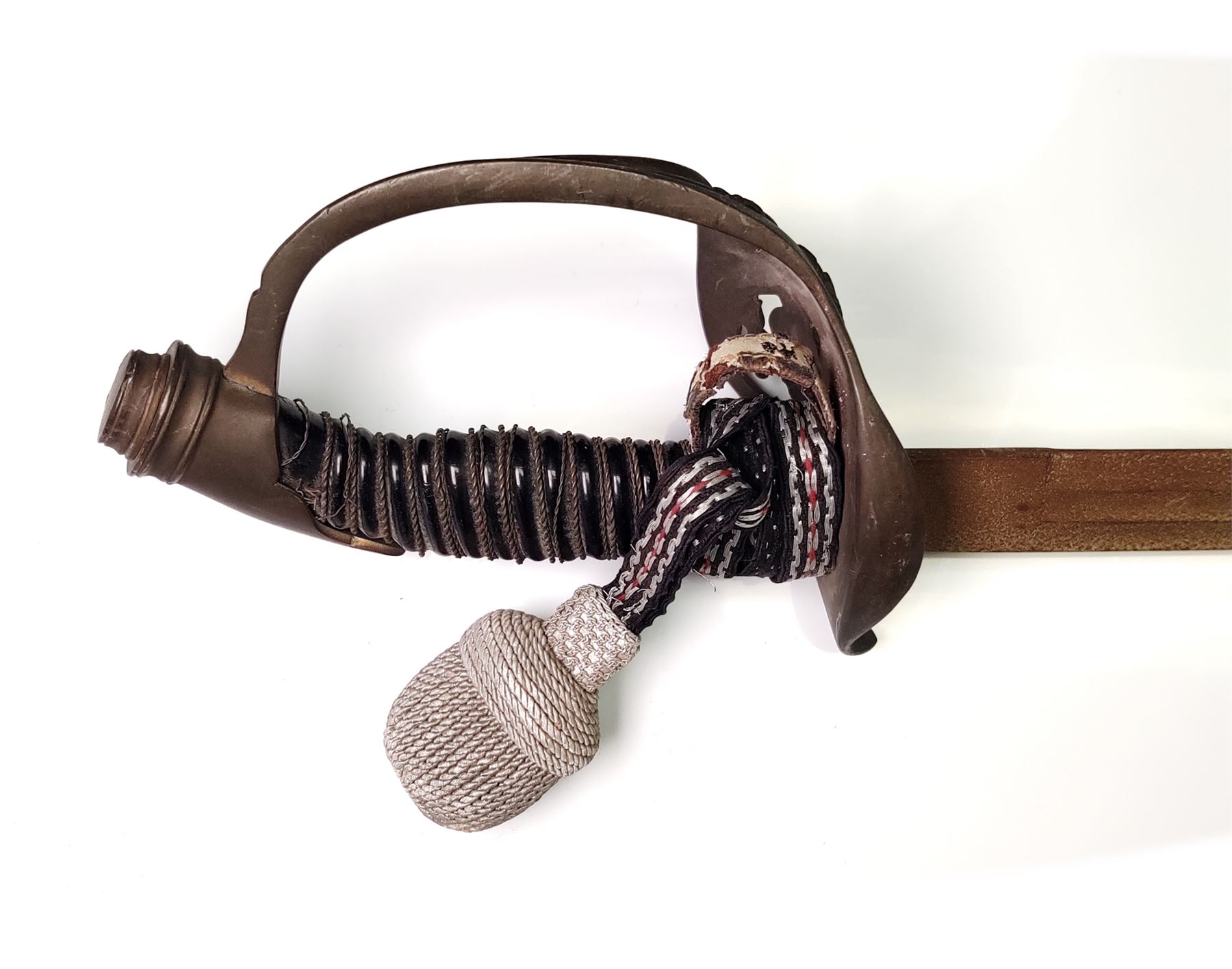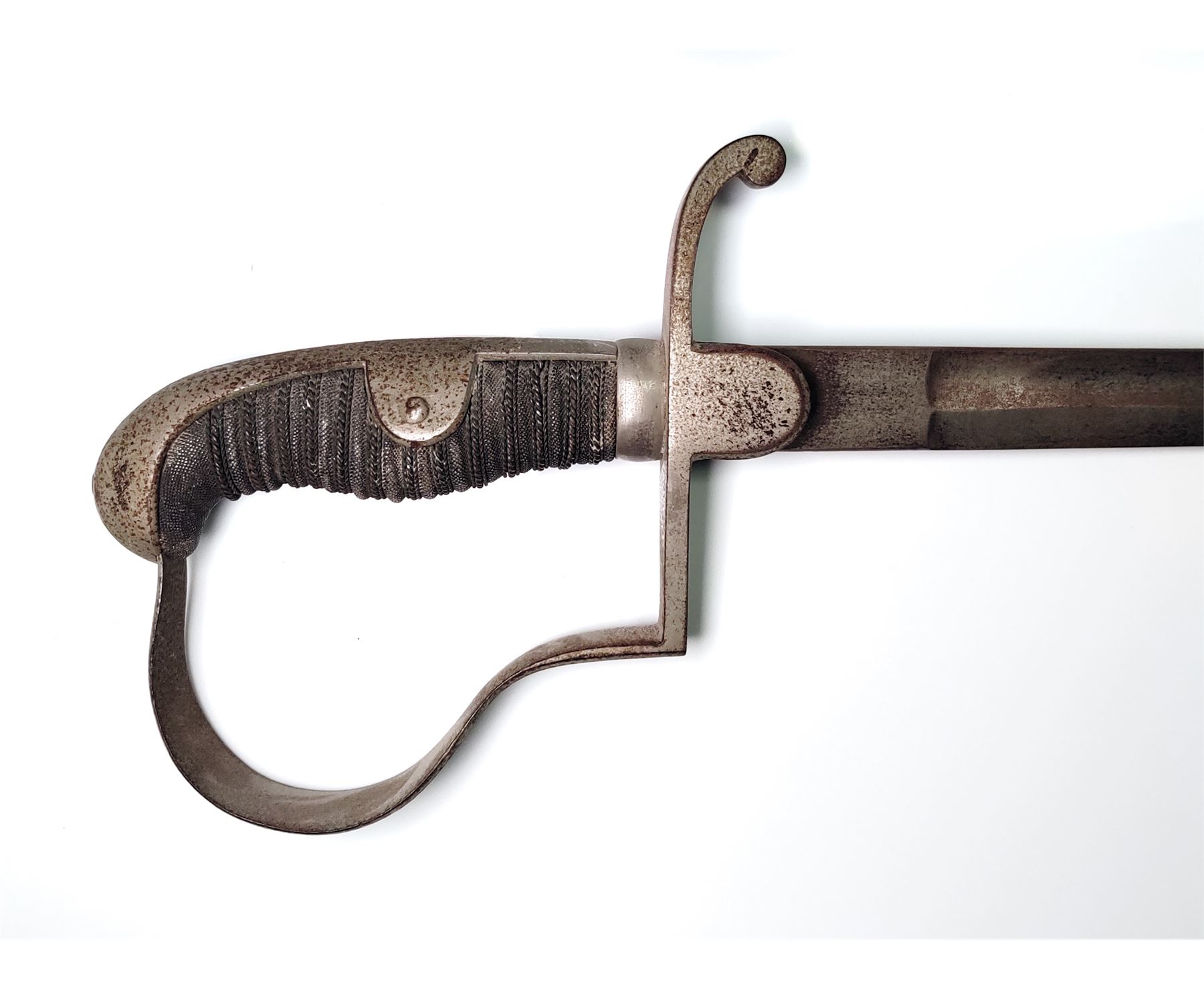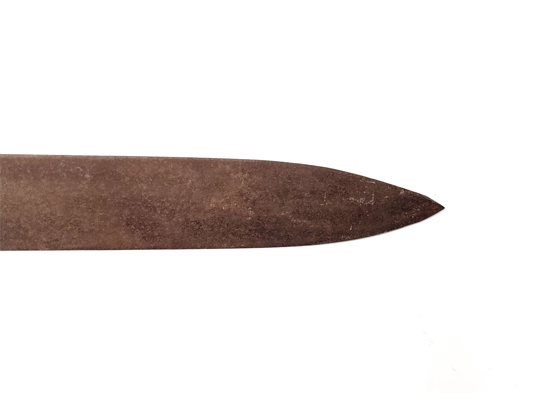 Lot of Three (3) Misc. Swords: (1) Imperial German Enlisted Sword, 31.5'' blade, with nickel-plated dove's head pommel. Wire-wrapped grip remains intact. (2) Imperial Army Sword, 31.5'' blade, with pierced guard featuring Prussian bird with crown. Wire-wrapped grip and emblem intact. Later era frog attached. (3) Reproduction English back sword, 33'' blade, with wire-wrapped grip. All are in fair to good condition. All blades are well rusted and unmarked. Est.: $150-$250/lot.