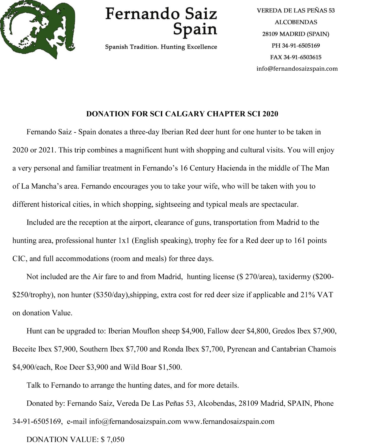 Not included are airfare to and from Madrid, hunting license of $270 per area, taxidermy related costs of $200-$250 per trophy, non-hunter daily rate ($350/day), Veterinary Certificate/Export Permit of $200 per trophy, extra cost for Red Deer size if applicable, and 21% VAT on the donation value of $7050.