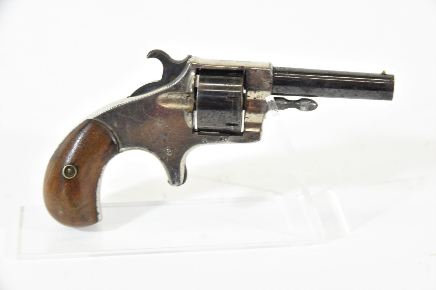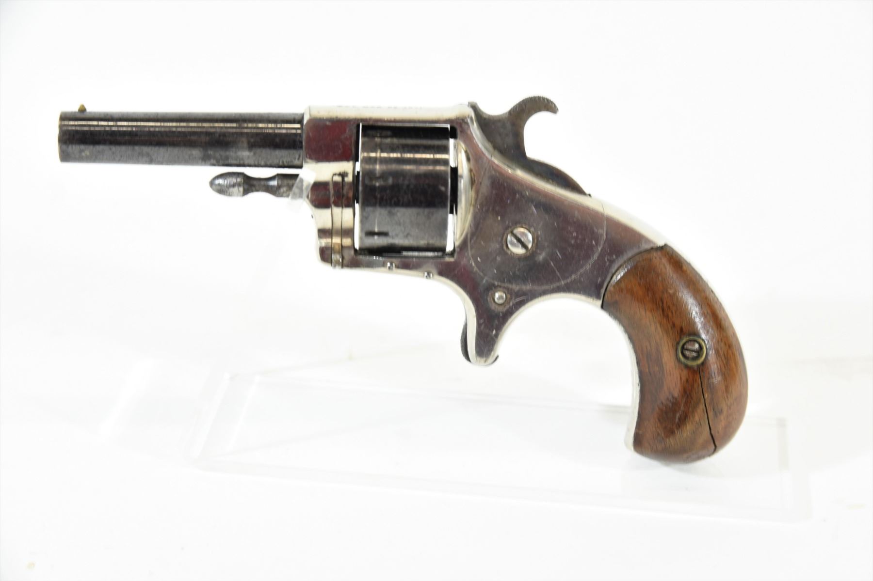 Prohibited, revolver, 22 Short, 58mm barrel, SN 1823. Left grip cracked, bluing worn and pitted, nickel plating has pitting, bore pitted.