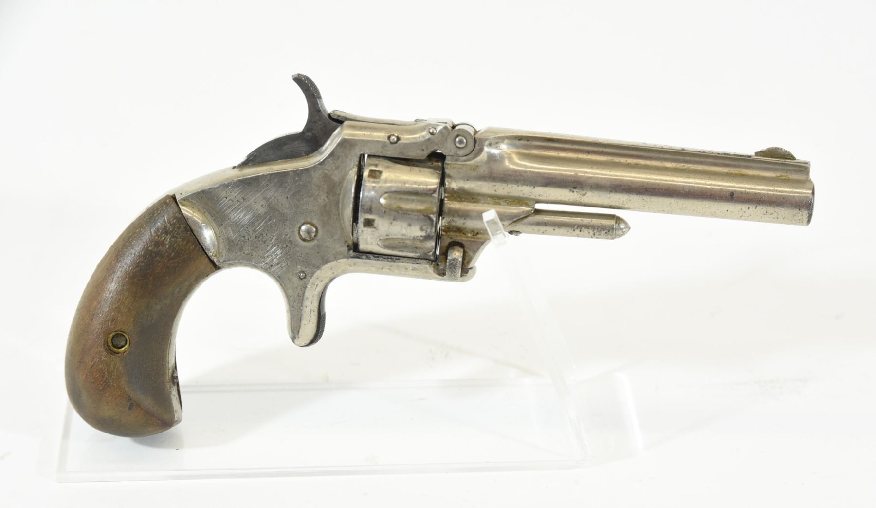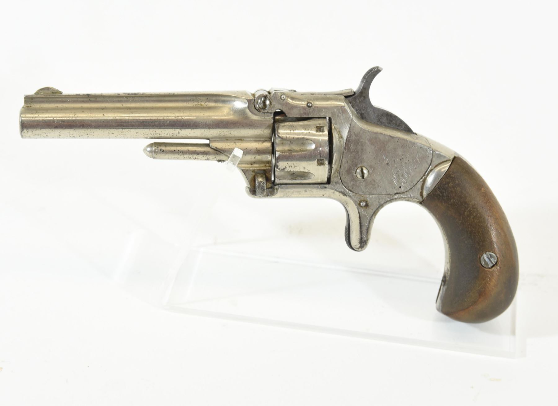 Prohibited, revolver, 22 Short, 81mm barrel, SN 86008. Wood grips have a couple of marks, nickel plating has pitting all over, bore pitted.