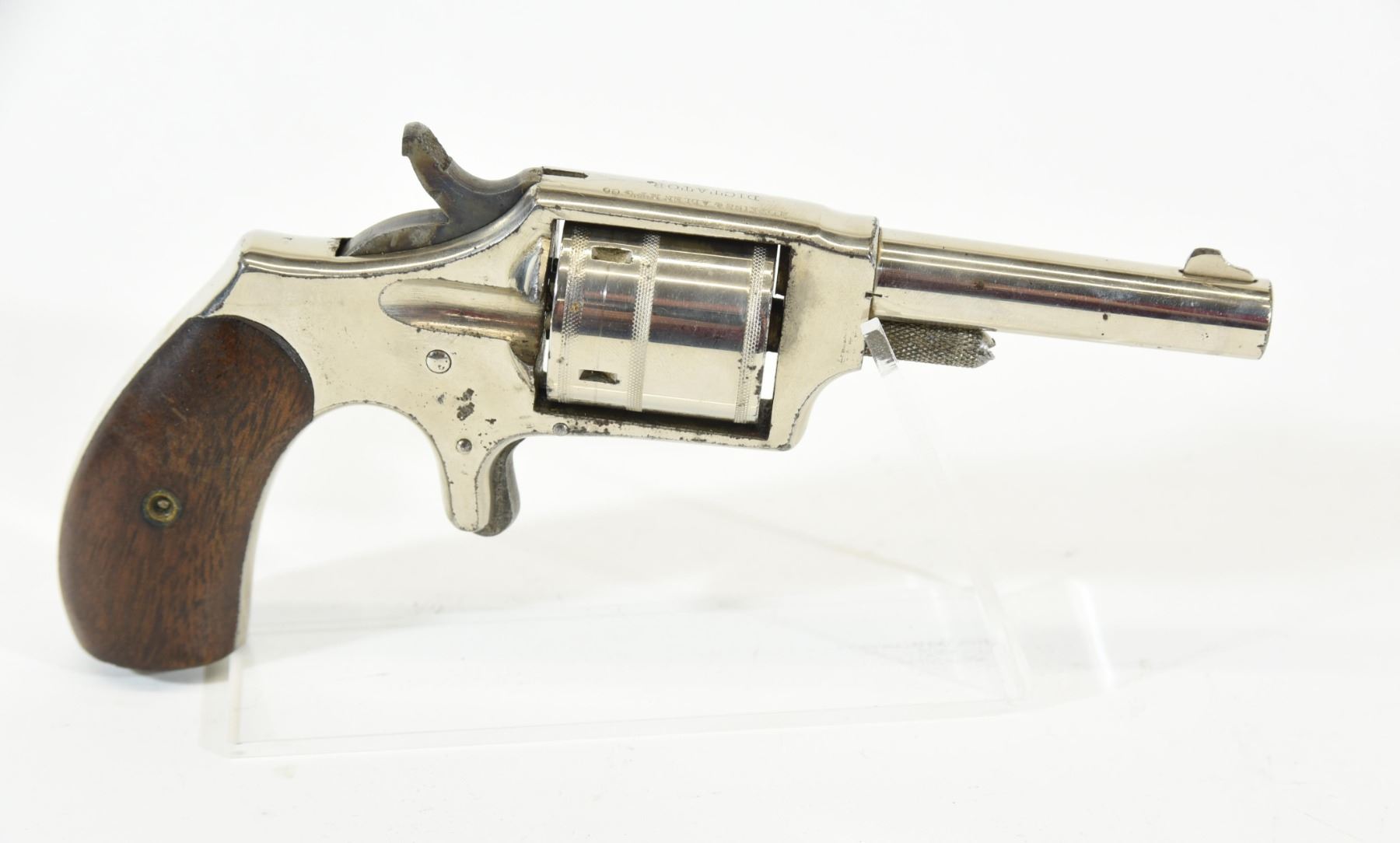 Antique, revolver, 32 RF, 73mm barrel, SN 2953. Wood grips have a scratch, nickel plating has some pit marks, bore has pitting.