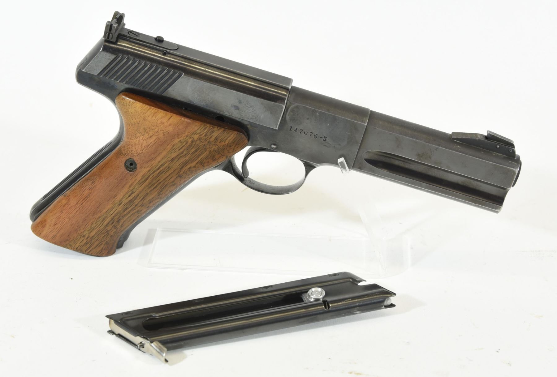 Restricted, semi auto, 22LR, 114mm barrel, SN 147076S. Wood grips very good, bluing fading with light scratches and pitting, bore excellent.