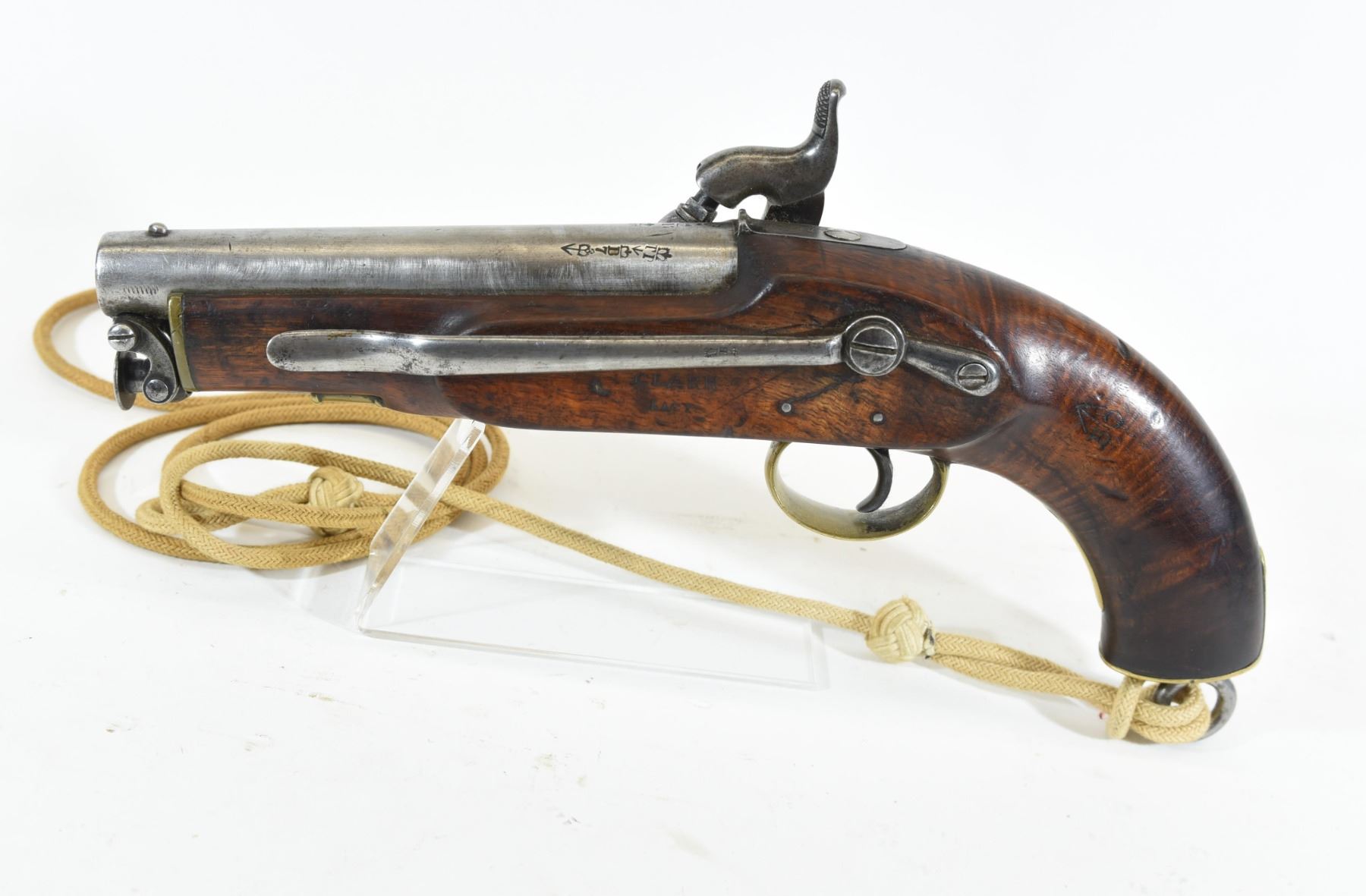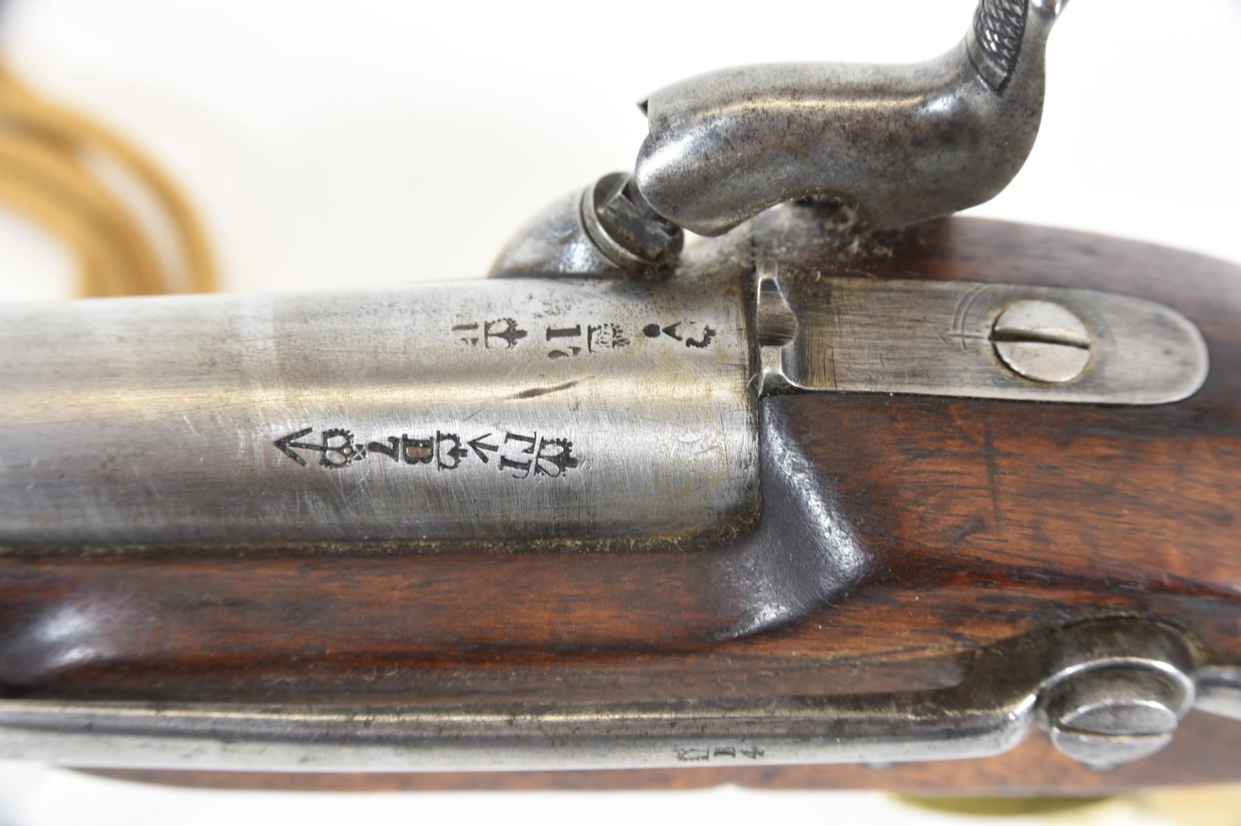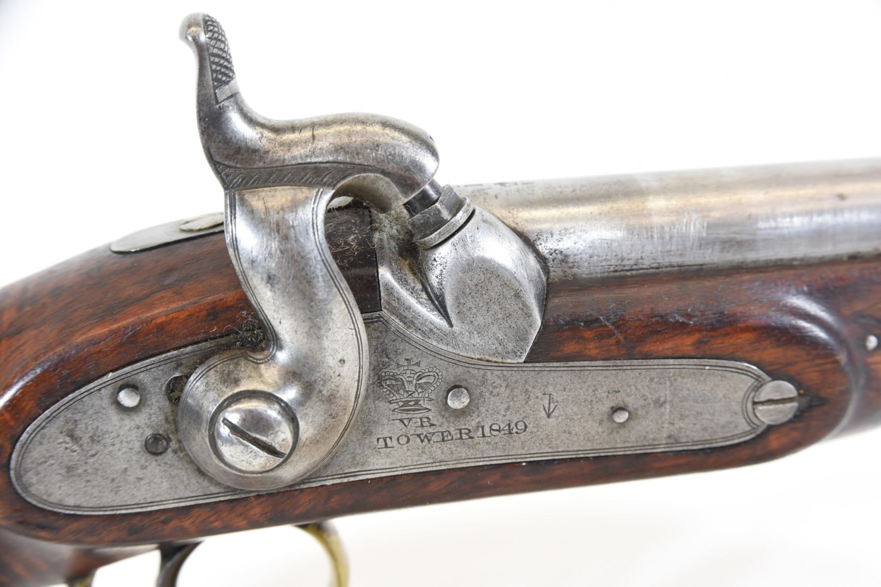 Antique, single shot, 57 percussion, 125mm barrel, SN none. Wood has some dents, metal work has no finish, bore pitted. Wood marked Clark Lacey, BO with arrow, crown over 16 and 17, Tower lock dated 1849, lanyard. Trigger guard brass hand marked VIII. Comes with some reference material.