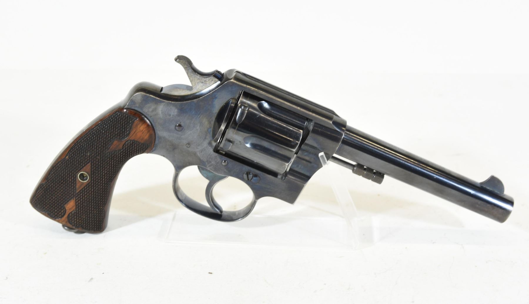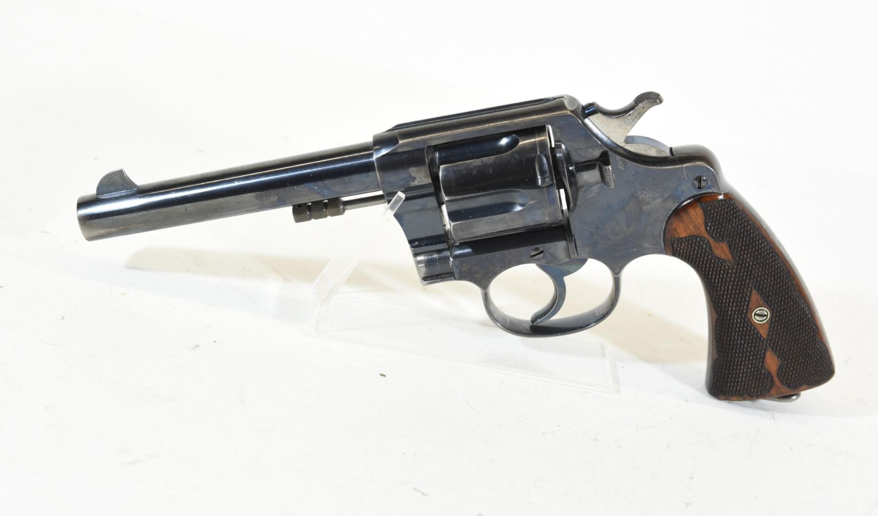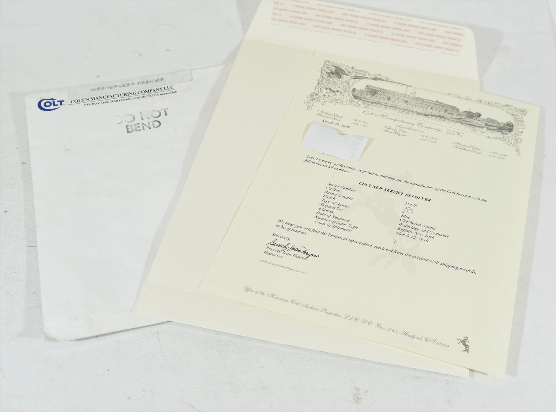 Restricted, revolver, 45 Colt, 140mm barrel, SN 25428. Wood grips have some chips, bluing is worn with bare patches, bore excellent. Comes with historical authenticity letter from Colt.