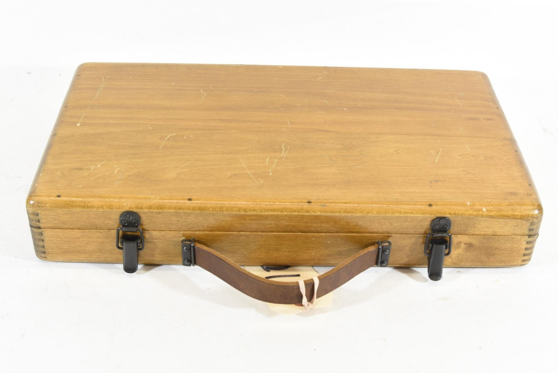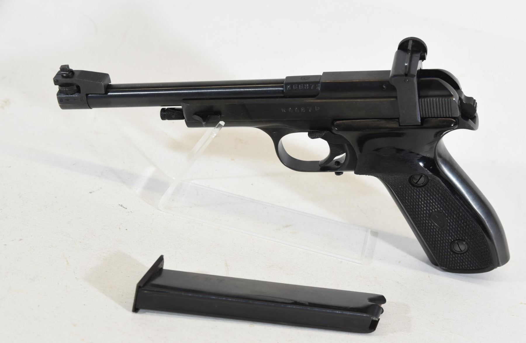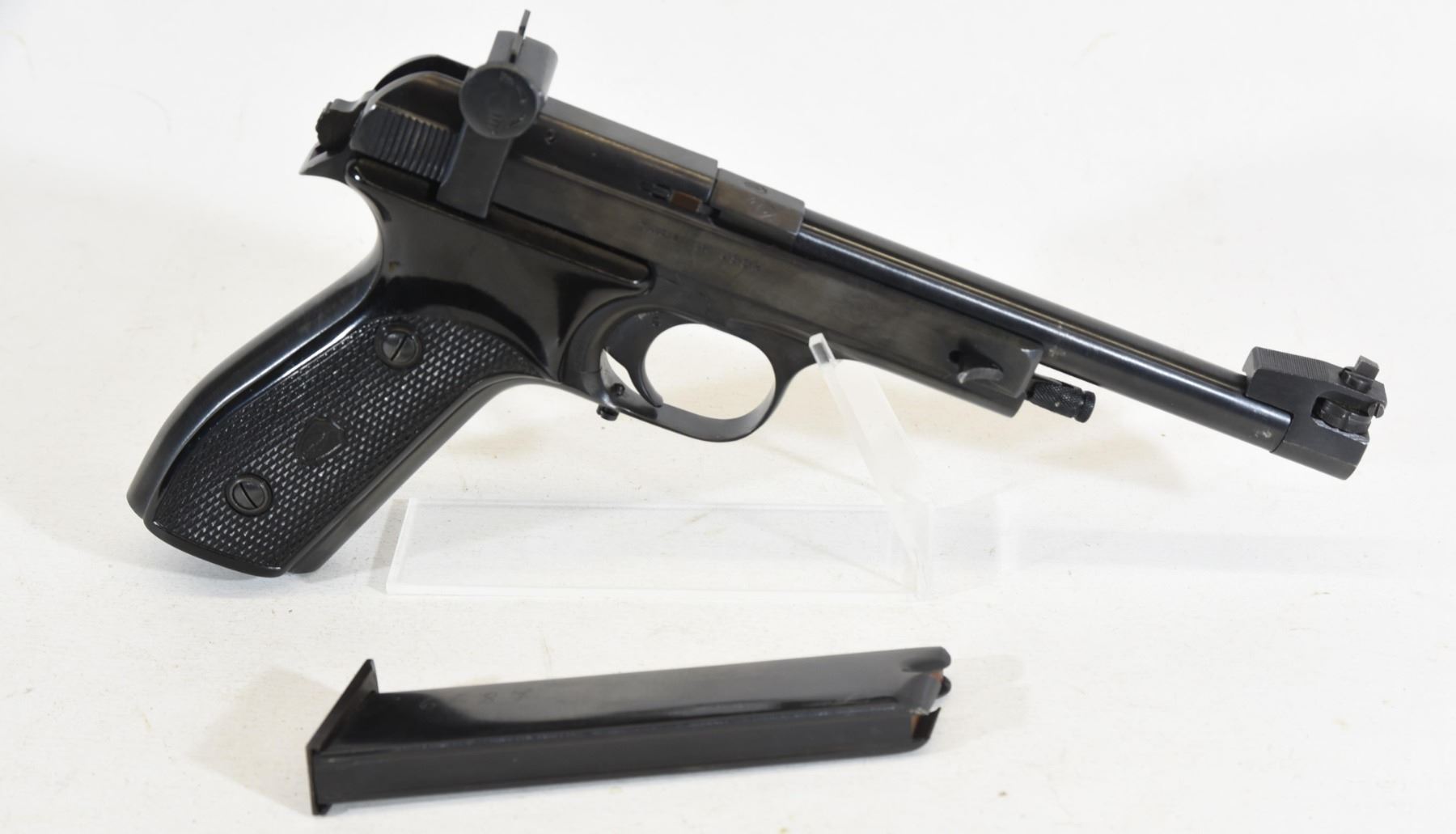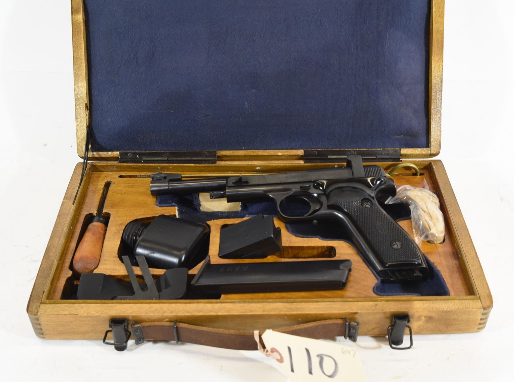 Restricted, semi auto, 22LR, 152mm barrel, SN K6687P. Left grip filed down, bluing has a couple of small marks, bore very good. Comes with wooden display box, cleaning kit and tools.