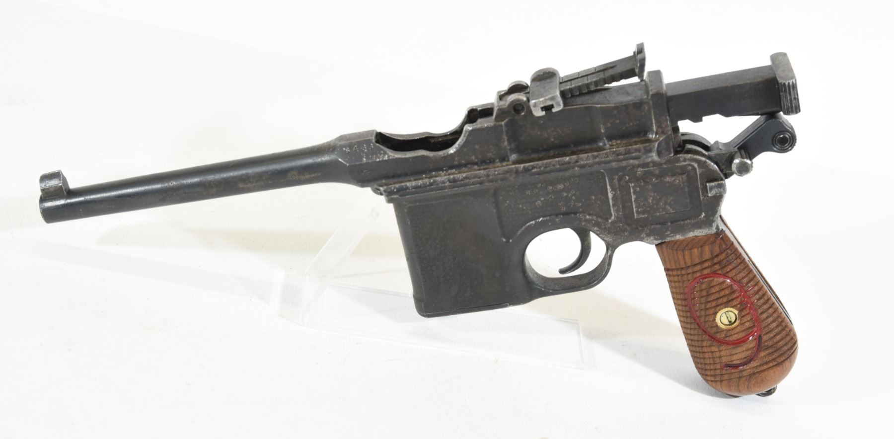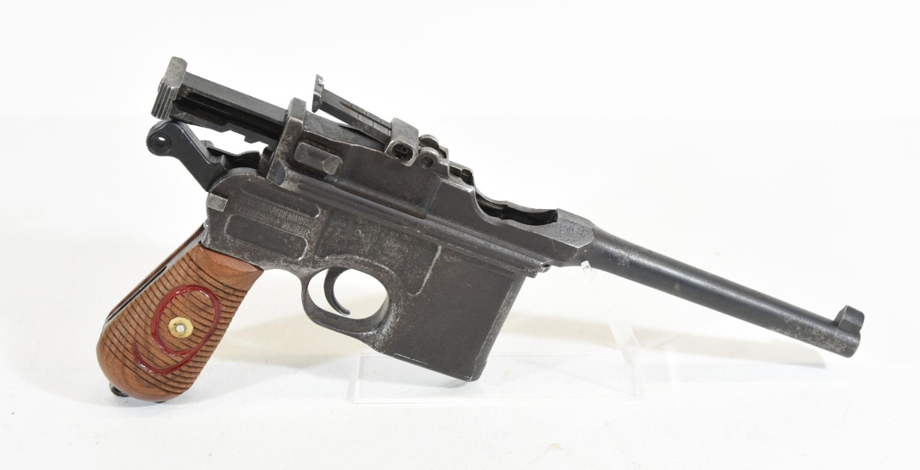 Restricted, 9mm, 140mm barrel, SN 8488, wooden grips are excellent but not originals, bluing is pitted, bore is dark rifling prominent, back sight is loose missing adjustment screw, recoil spring is weak