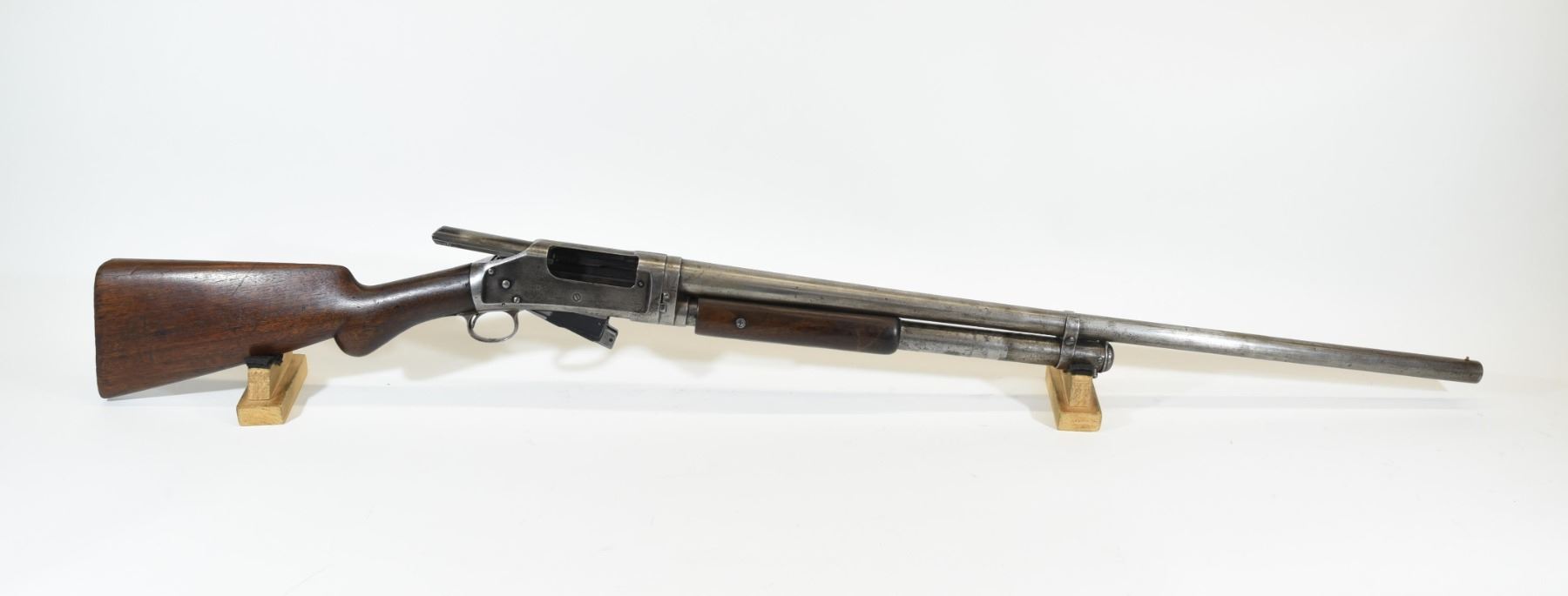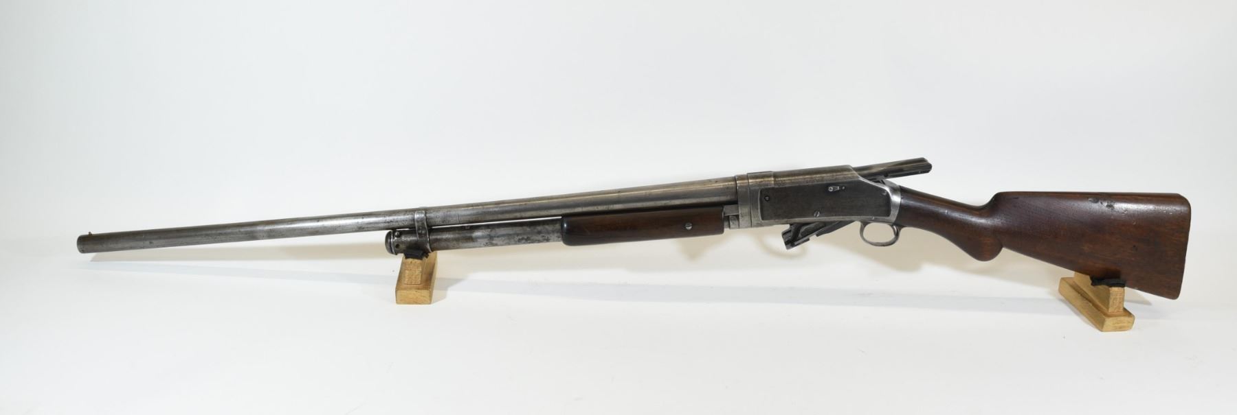 Non-restricted, pump action, 12 ga. 2 3/4", 30" full choke barrel, SN 205718. Wood has 3 cracks in fore arm one is full length, butt stock has a couple of light cracks, chip out by receiver and a few light dints, no butt pad, bluing is grey, bore is marked and has 2 or 3 rings on the inside.