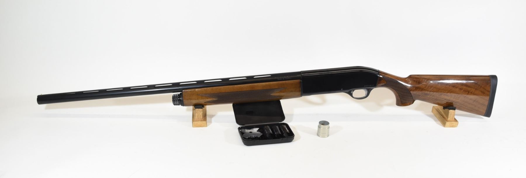 Non-restricted, semi auto, 12. ga. 3", 28" vent rib barrel, SN AD31051. Wood is excellent, bluing is excellent, bore is excellent. Comes with mod., full & imp.cyl. choke tubes with wrench and stock shims. Gun is as new and is said to have only shot one round of skeet.