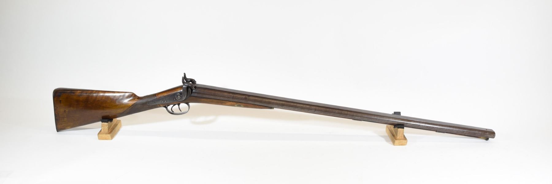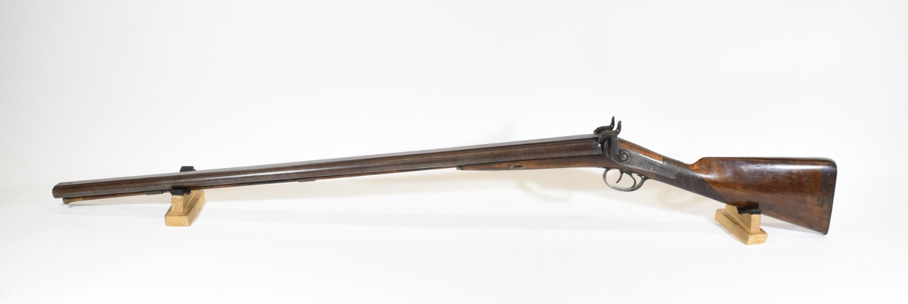 Non-restricted, multi barrel, 14 bore, 33 1/2" Damascus twist barrels with wide 7/8" rib, SN none. Wood has light marks, bluing is brown, bores are good. Said to have shot a round of skeet this past year with no issues.