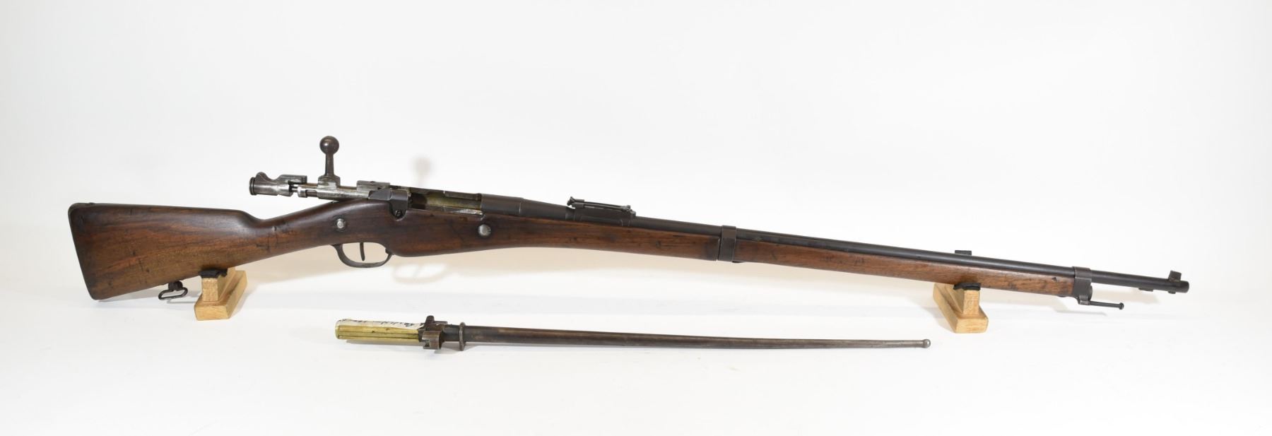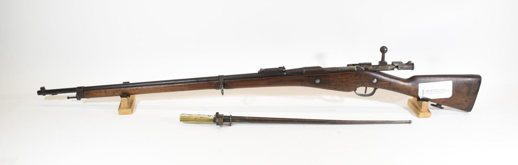 Non-restricted, bolt action, 8mm, 32" barrel, SN 58350. Wood has a couple of dents, bluing is dull and is showing spots of corrosion along the front stock, appears to have some brazing at end of barrel where it goes into the receiver, bore is good. Comes with a bayonet with different serial number, bolt number does not match.