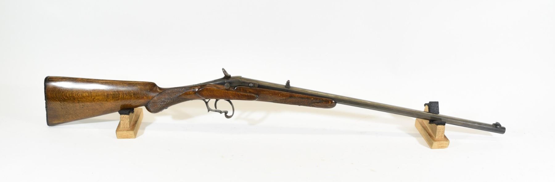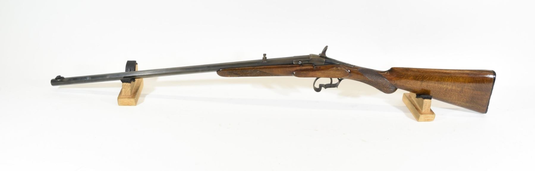 Non-restricted, single shot, .22 cal., 22" barrel, SN 3. Wood is very good and has been refinished, bluing is just showing a touch of brown, bore is excellent, not original rear sight.