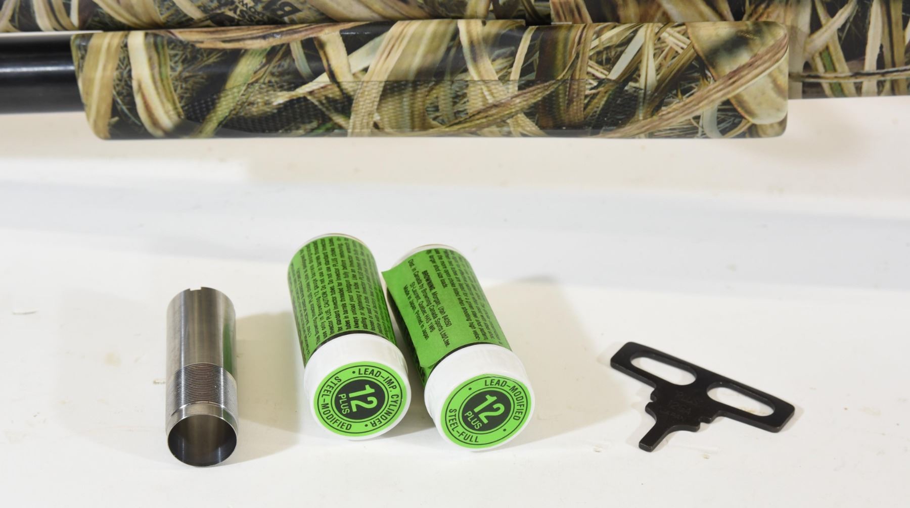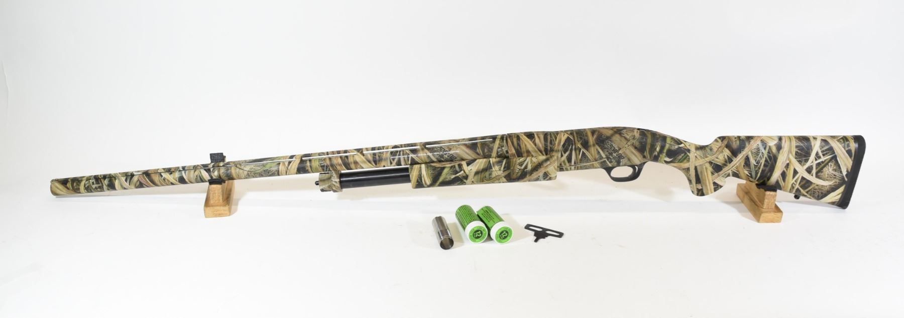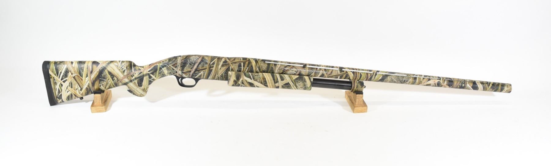 Non-restricted, pump action, 12 ga. 3 1/2", 28" vent rib barrel with full, mod, & imp. cyl. invector choke tubes and a Carlson's bip im .715 tube, SN 02933ZX121. Synthetic max 4 camo stock in excellent condition, bore is very good.