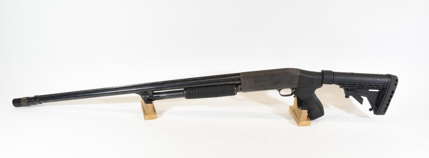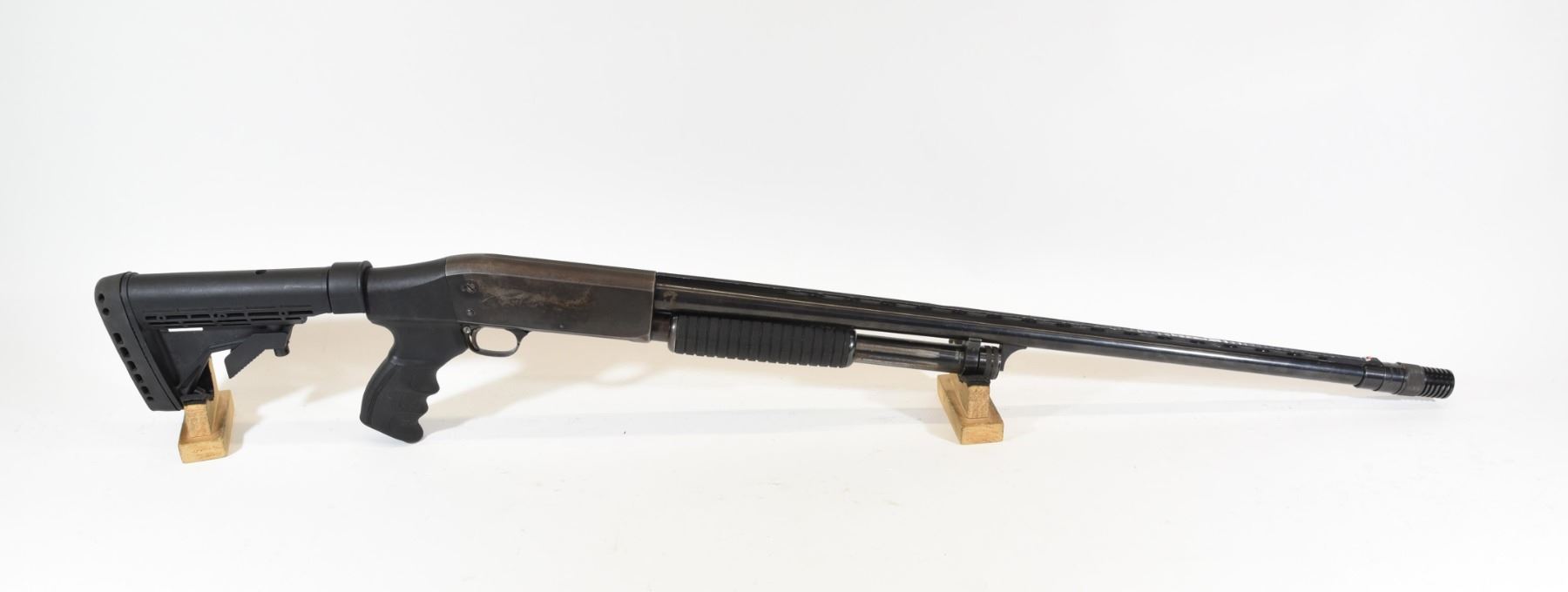 Non-restricted, pump action, 12 ga. 2 3/4", 26" vent rib barrel with a poly-choke, SN 821364-4. Adjustable synthetic stock in good condition, bluing is starting to turn grey, bore has just a bit of light pitting.