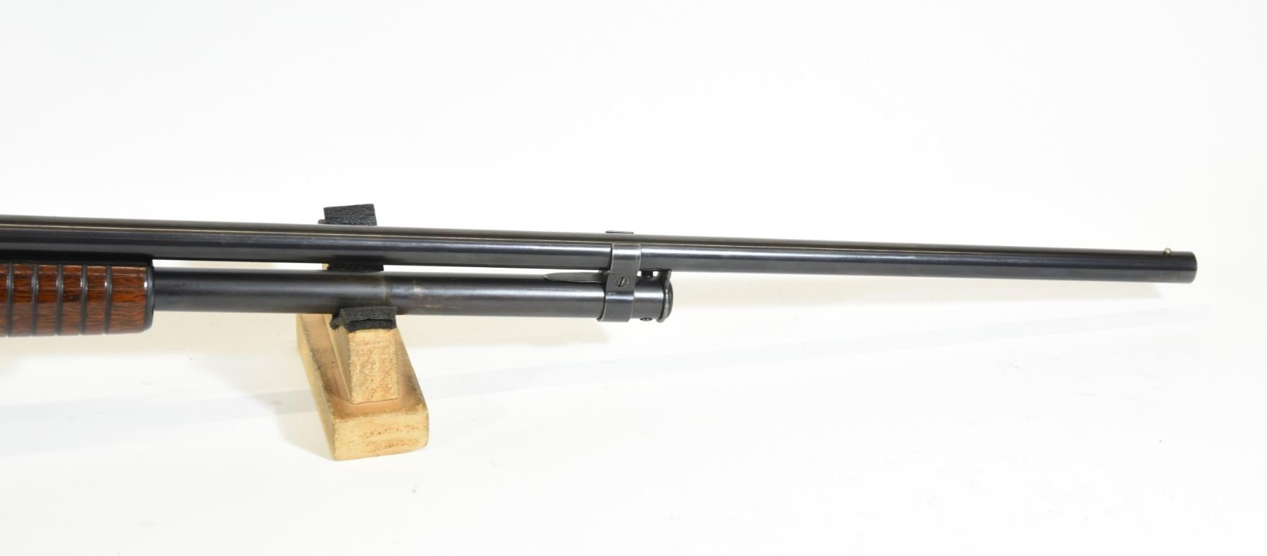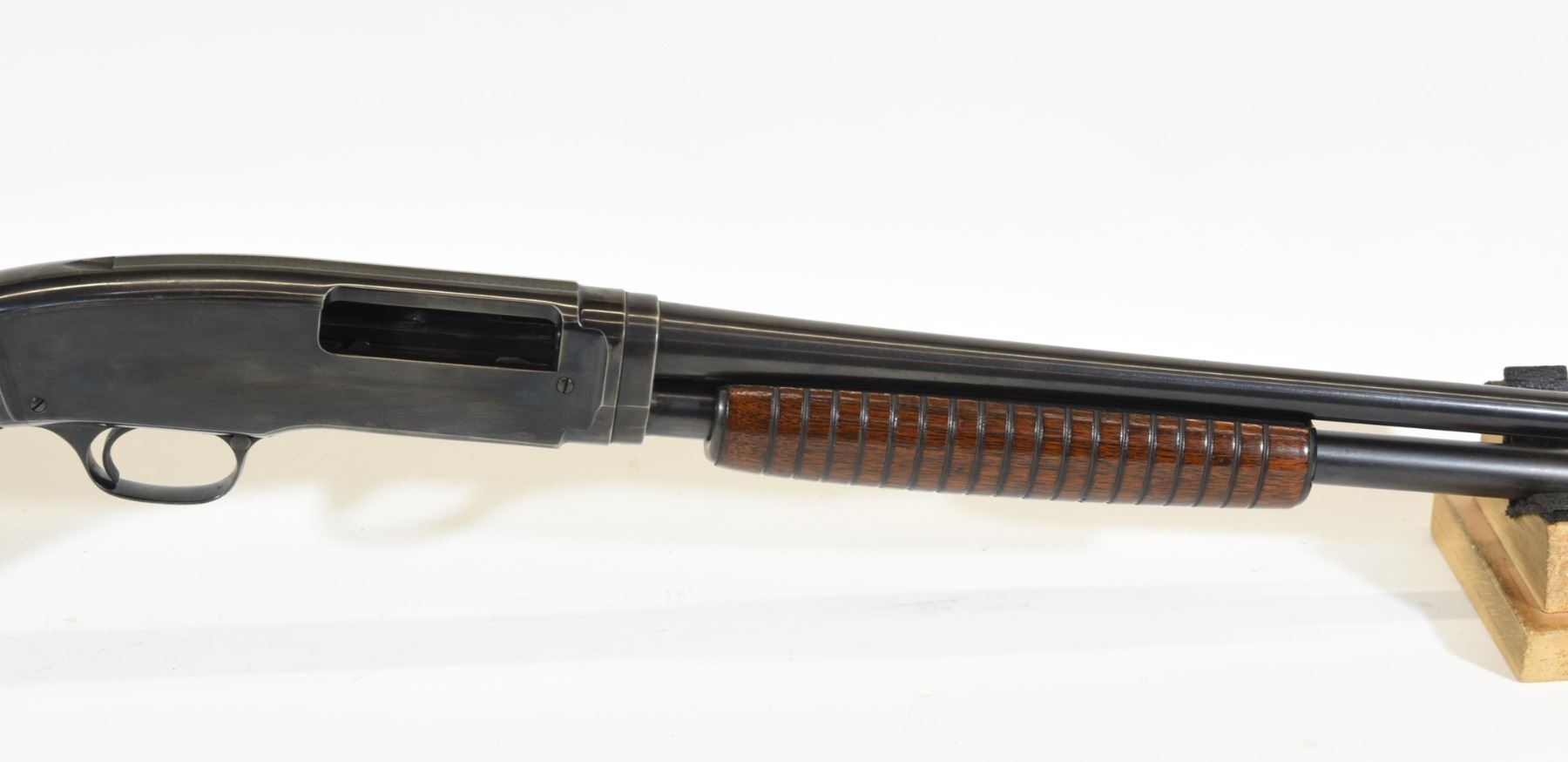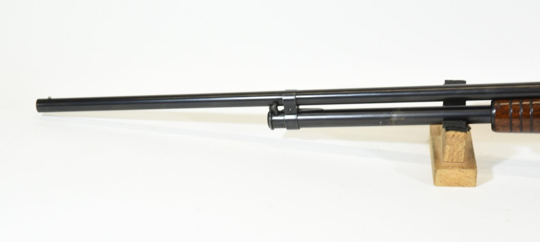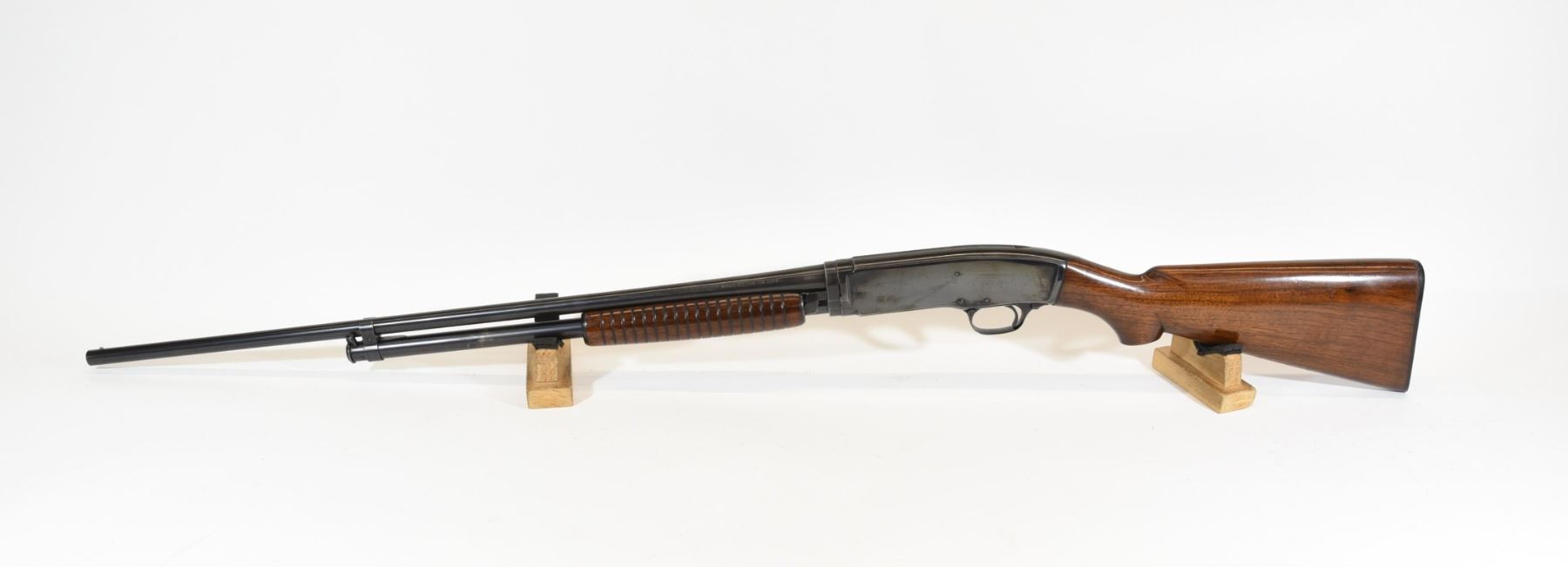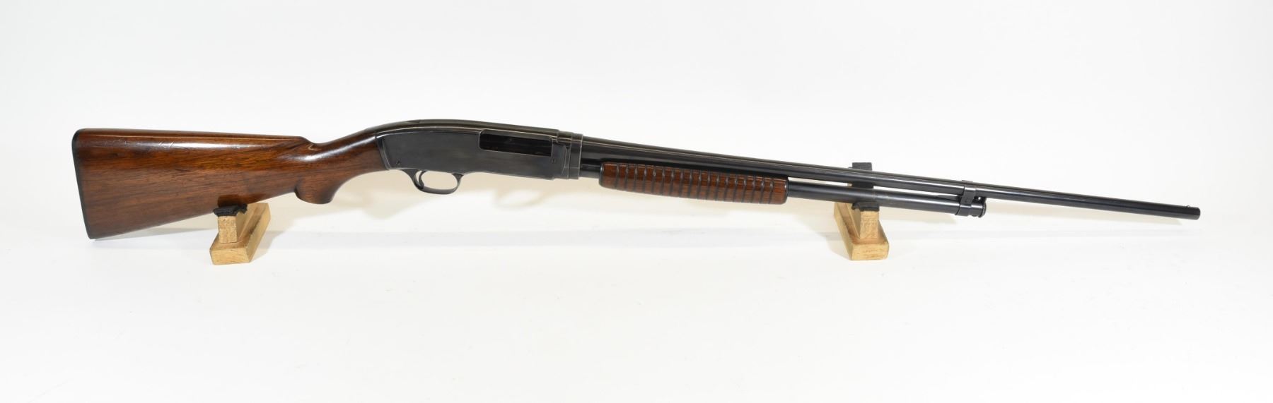 Non-restricted, pump action, .410 3", 26" barrel, SN 56607. Wood is good with some light marks, bluing is good, bore is very good.