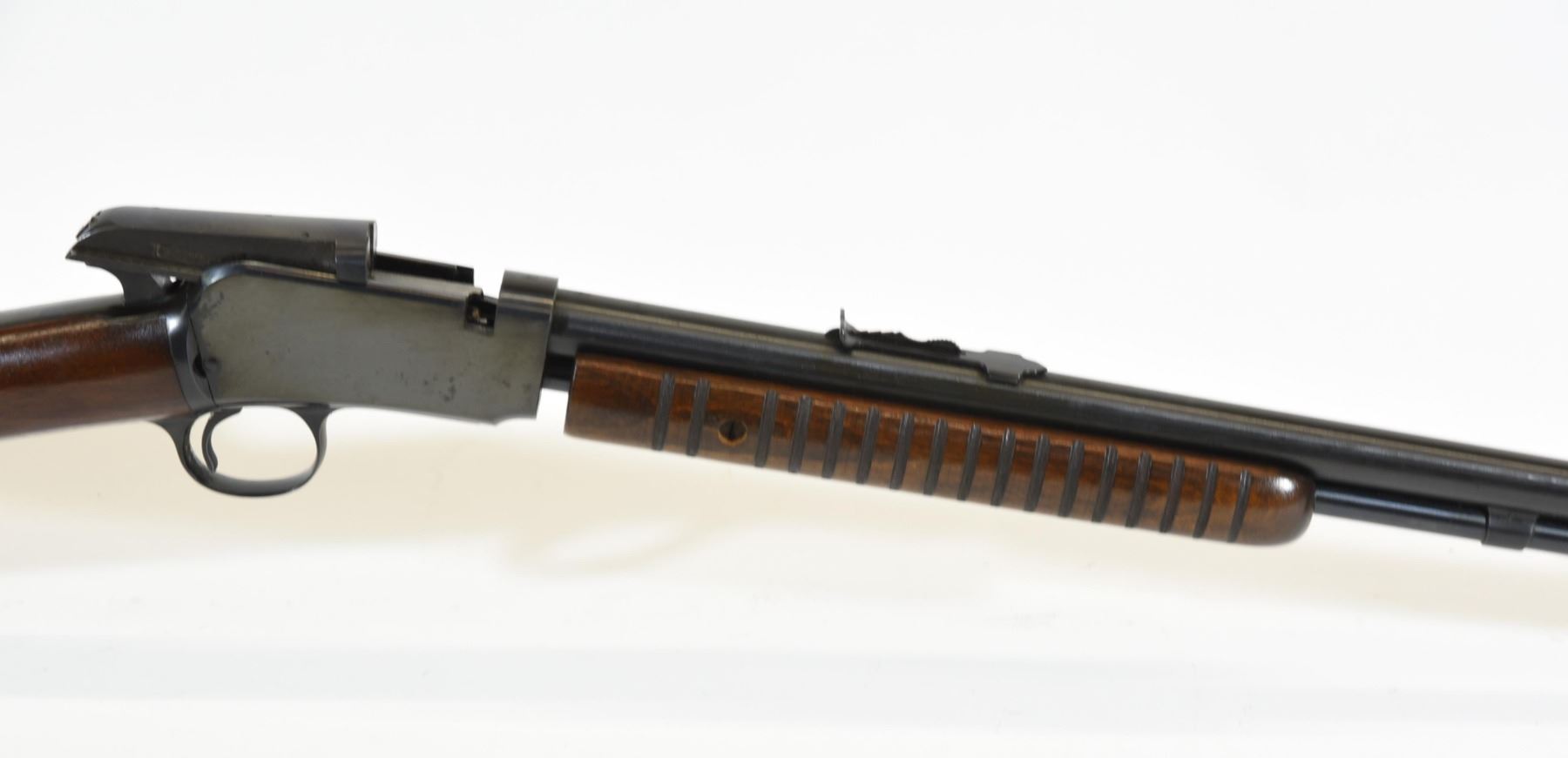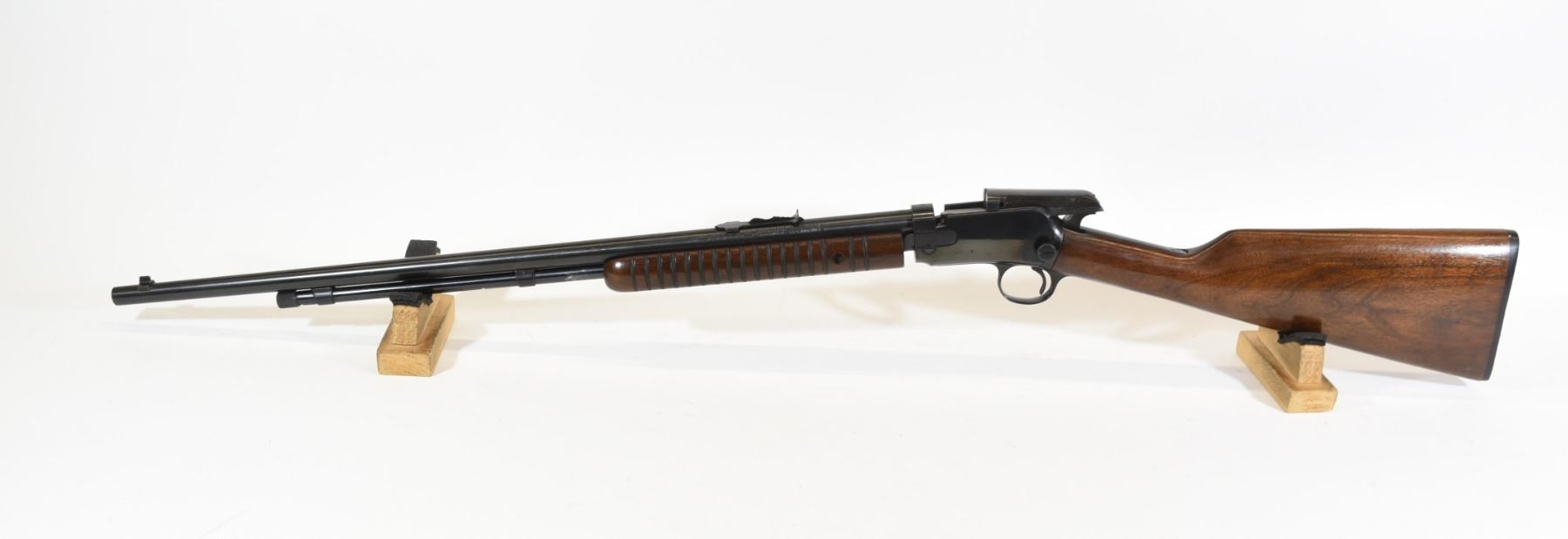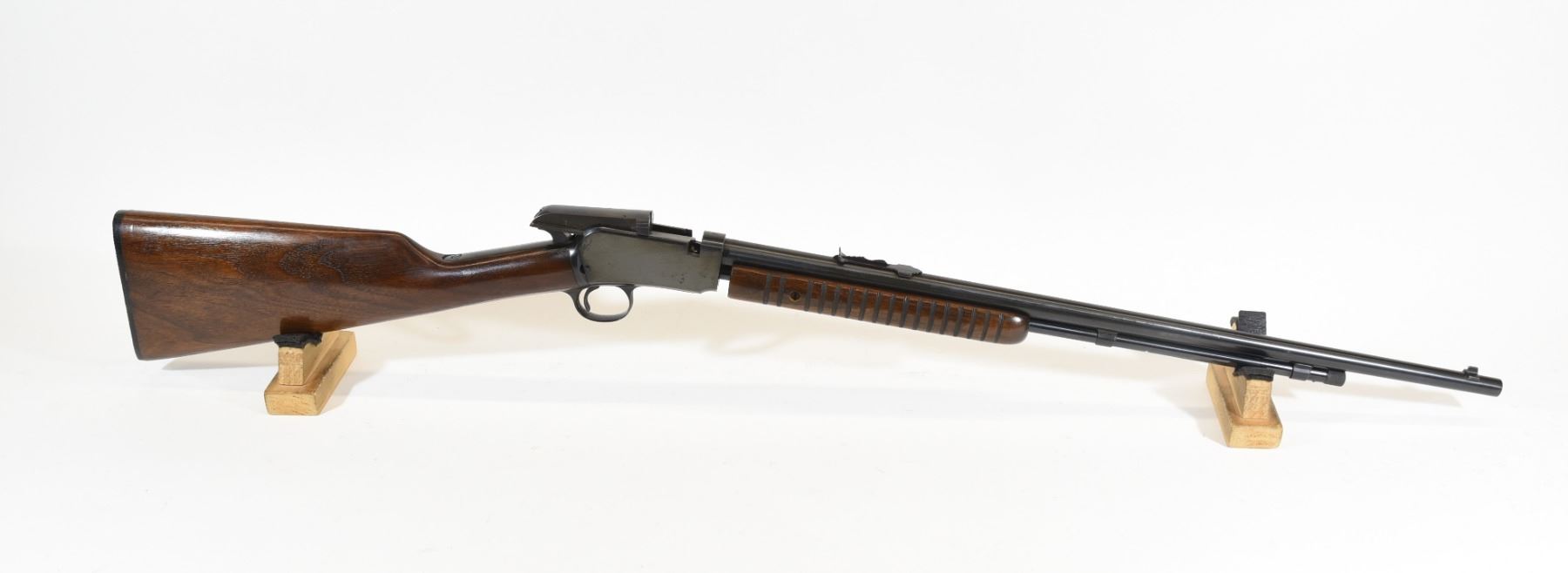 Non-restricted, pump action, .22 s-l-lr, 23" barrel, SN 326233. Wood is very good, bluing is very good, bore is excellent.
