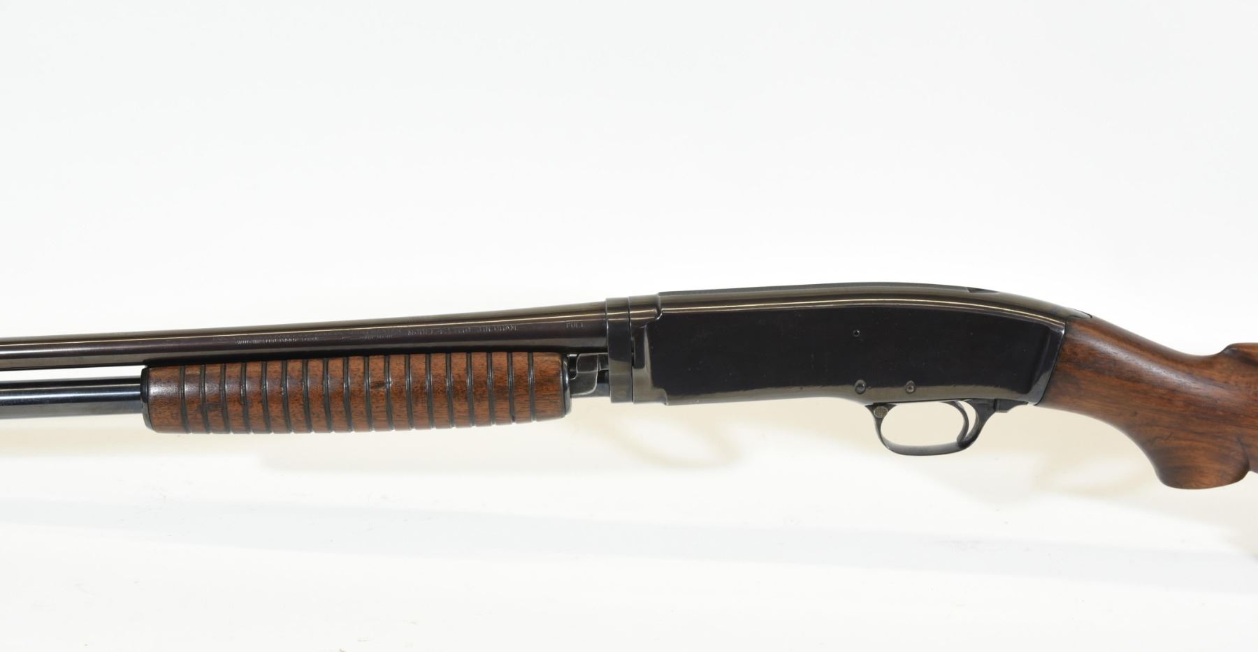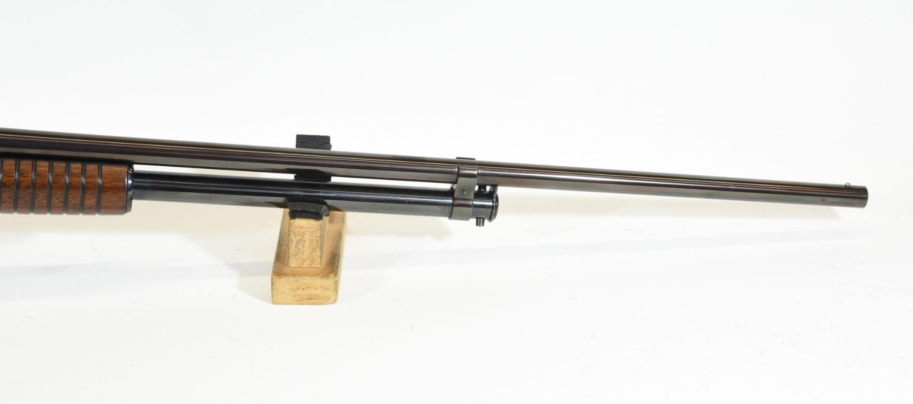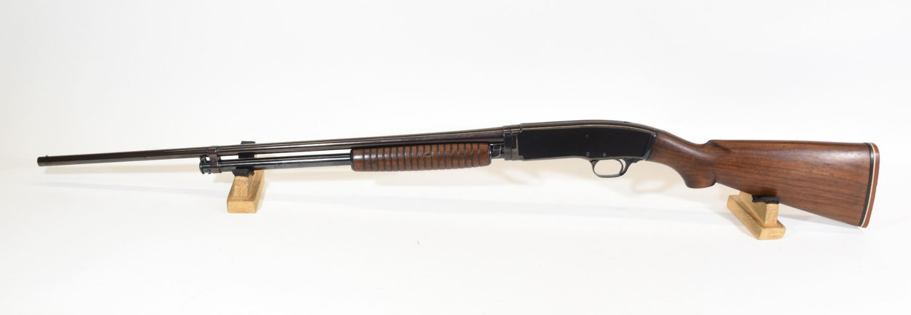 Non-restricted, pump action, .410 3", 26" full choke barrel, SN 55611. Wood is very good with a few very light marks, bluing is very good but appears to have been reblued, bore is very good.