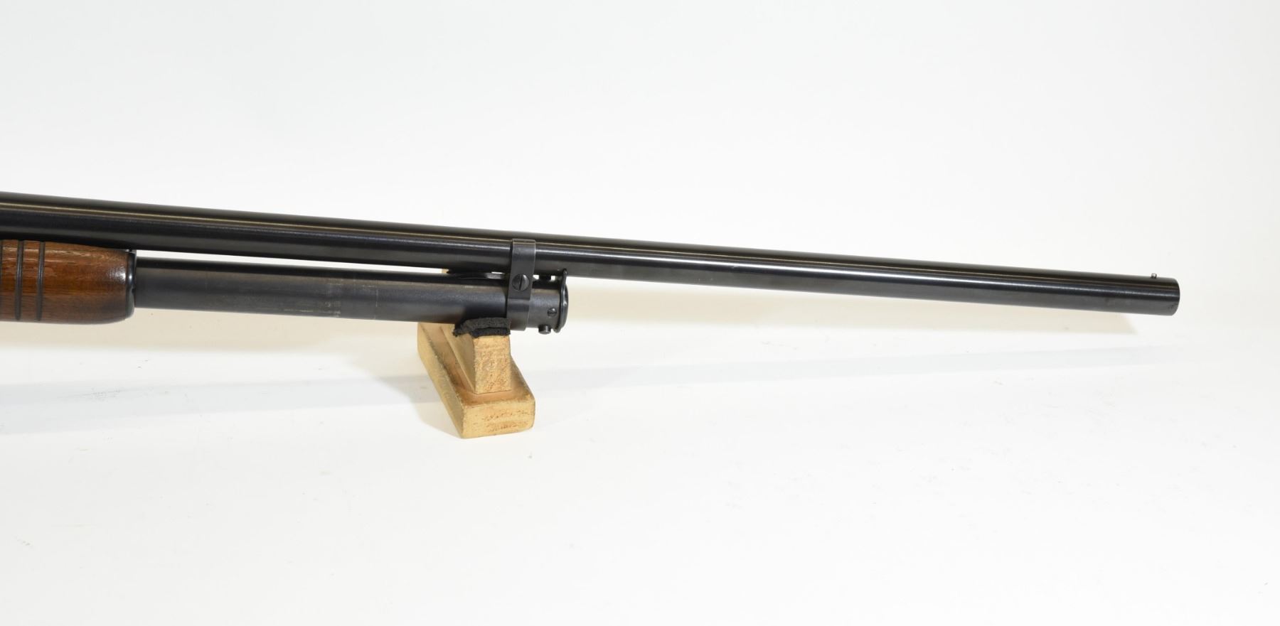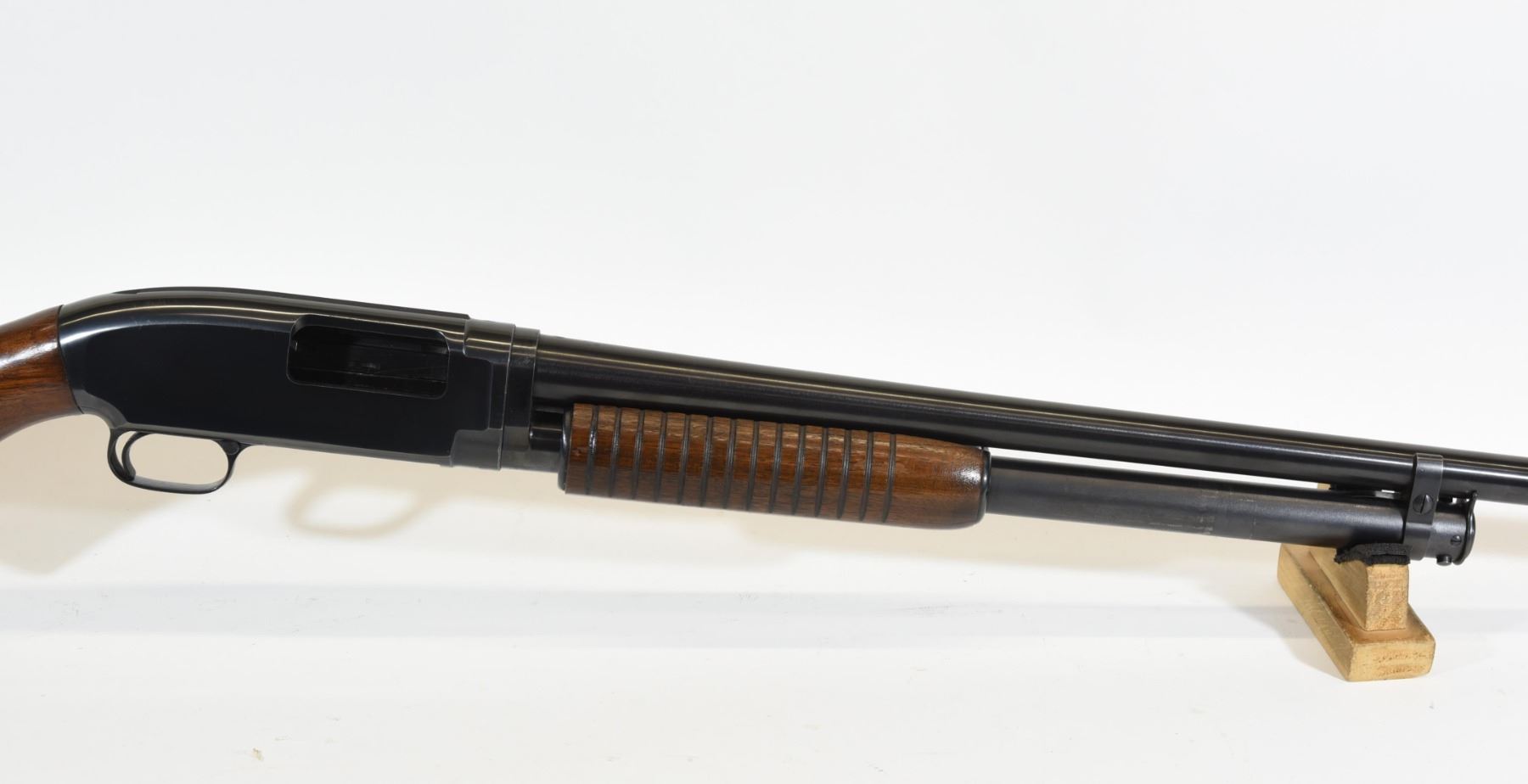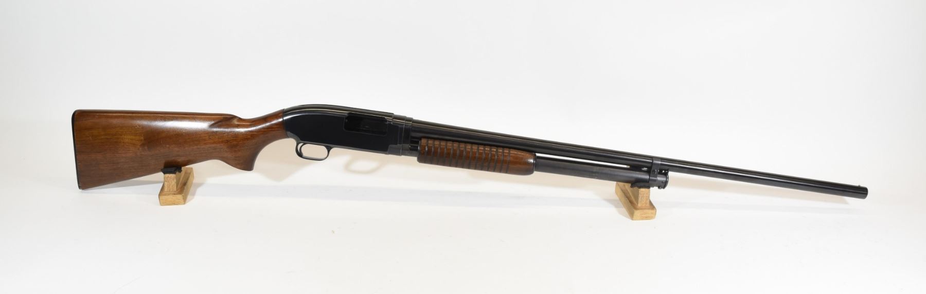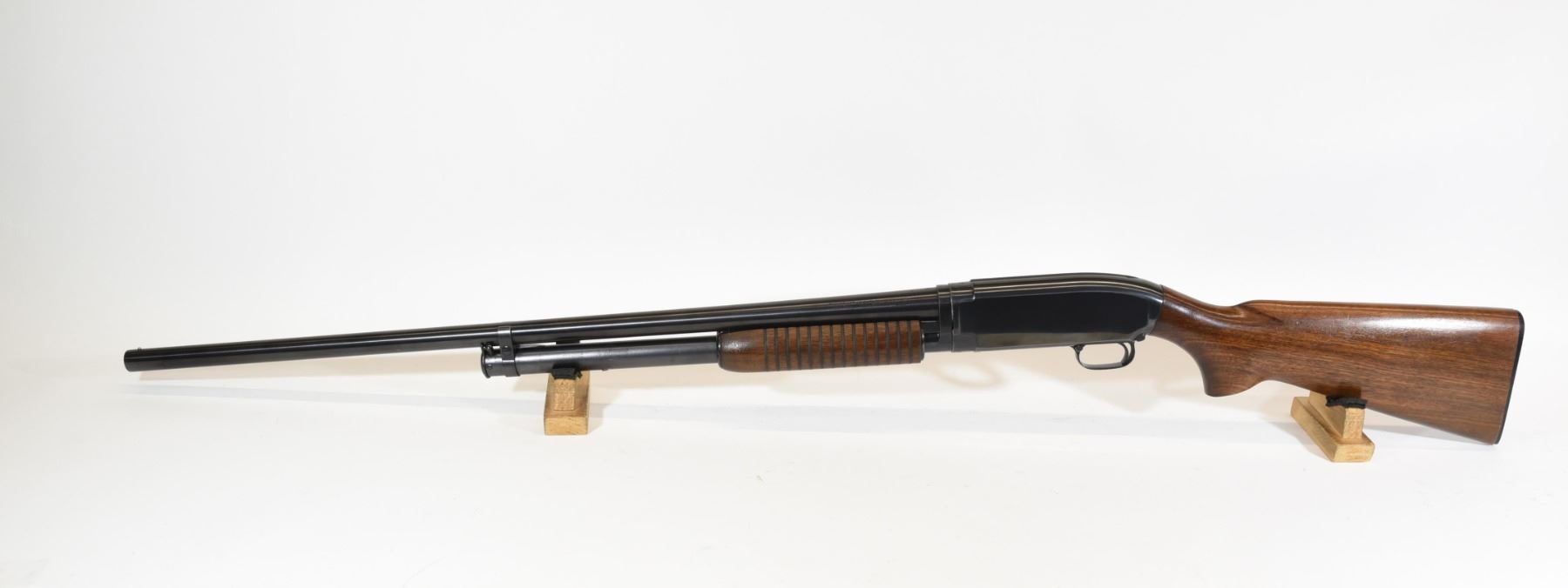 Non-restricted, pump action, 12 ga. 2 3/4", 30" full choke barrel, SN 1486449. Wood is good but has a few light dents and scratches, bluing is very good, bore is very good.