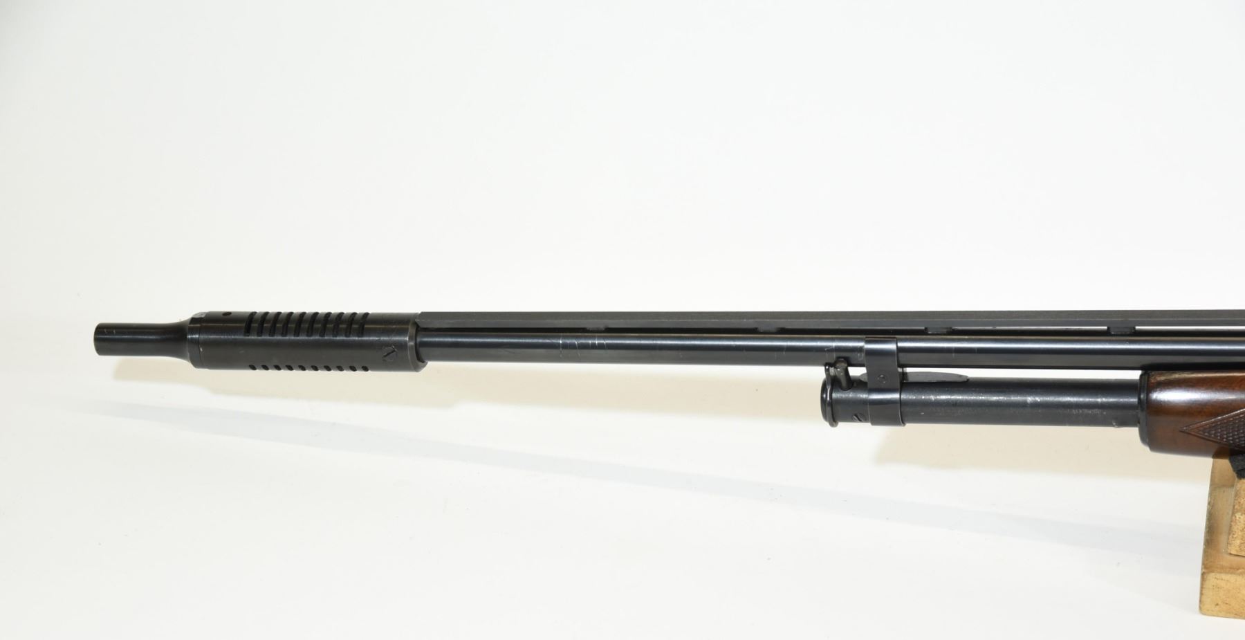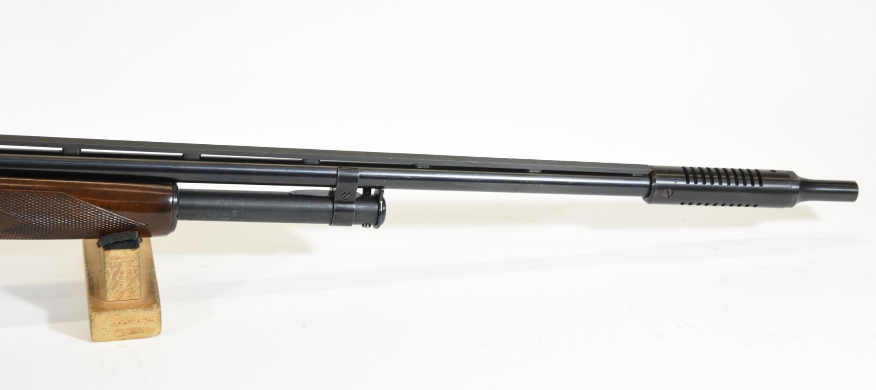 Non-restricted, pump action, .410 ga. 3", 28 1/2" vent rib skeet barrel with a Cutts compensator and a Lyman spreader choke, SN 149018. Wood is very good with a few light marks and double diamond checkering, bluing has a couple of fine scratches, bore is very good.
