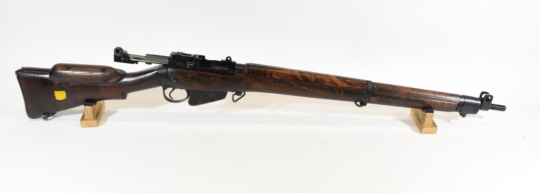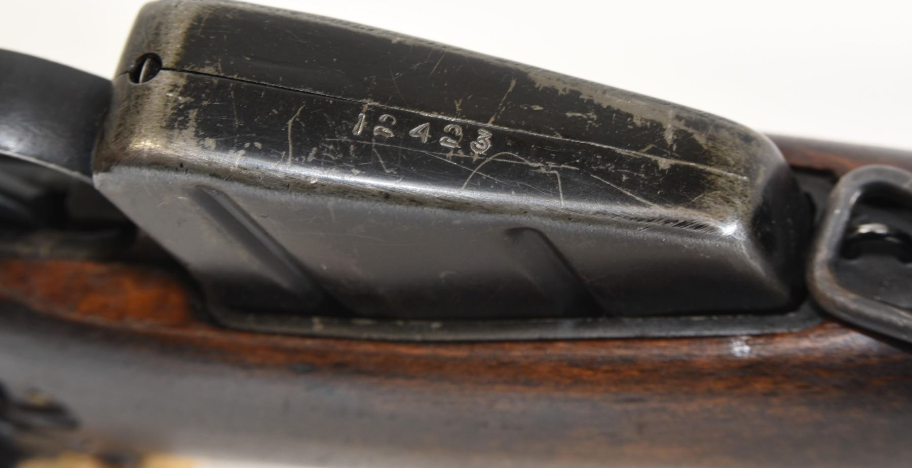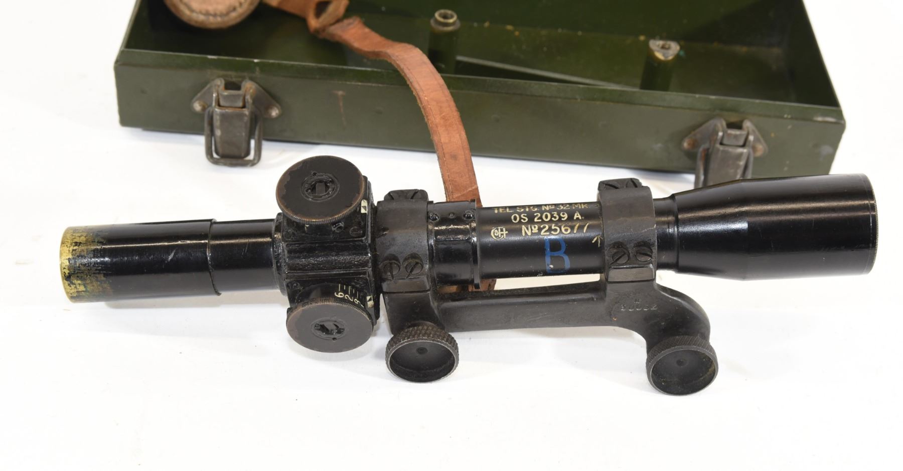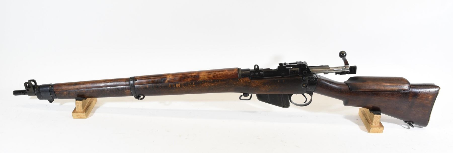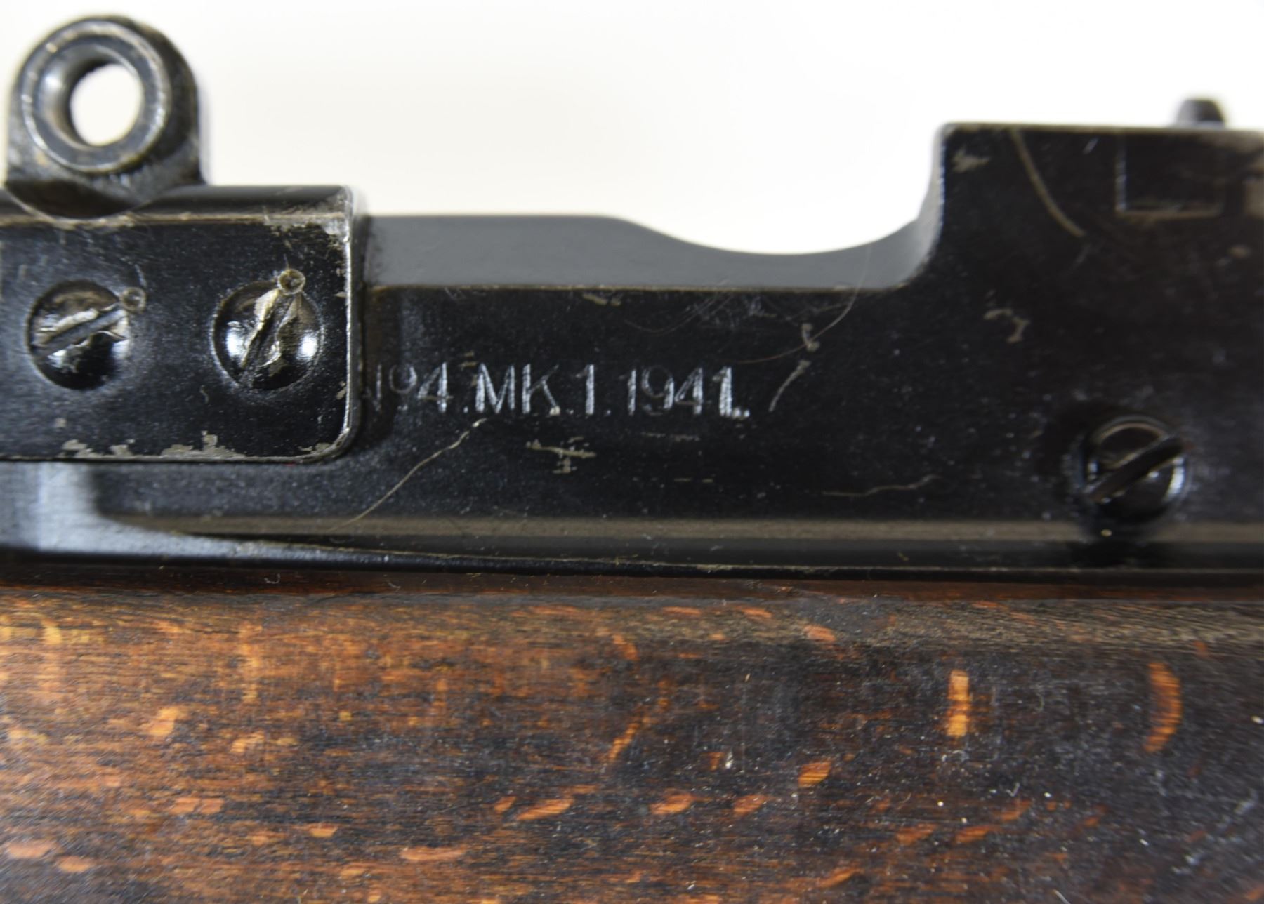 Non-restricted, bolt action, 303 British, 25" barrel, SN 12423. Wood has some dents and scratches, bluing worn with some marks and scratches, bore excellent. Comes with Tel. Stg. No 32 Mk3 Scope SN 25677 in metal case turrets do not turn, wooden storage case - leather handled straps are deteriorated from age. Bolt, receiver and mag have same serial number.
