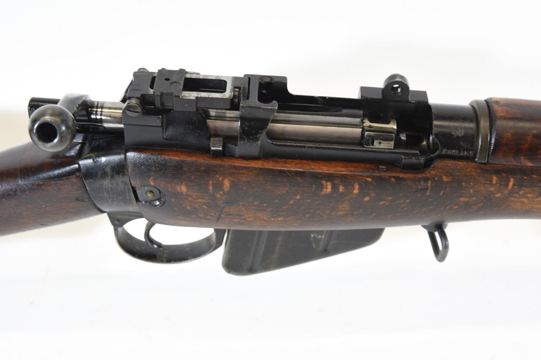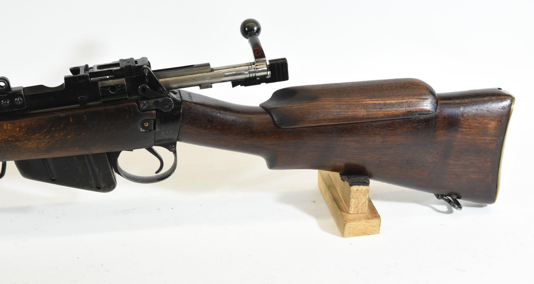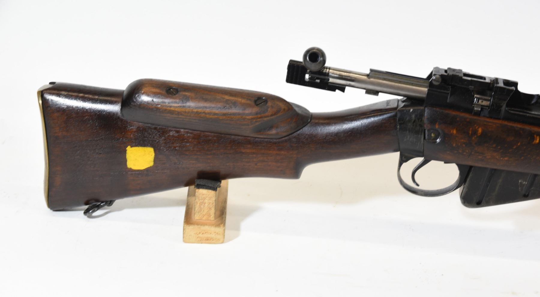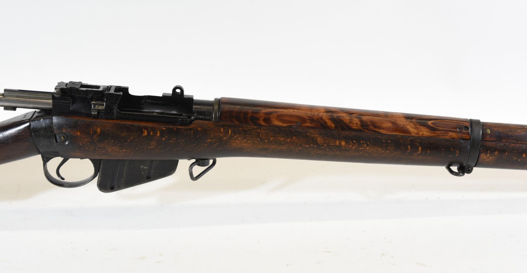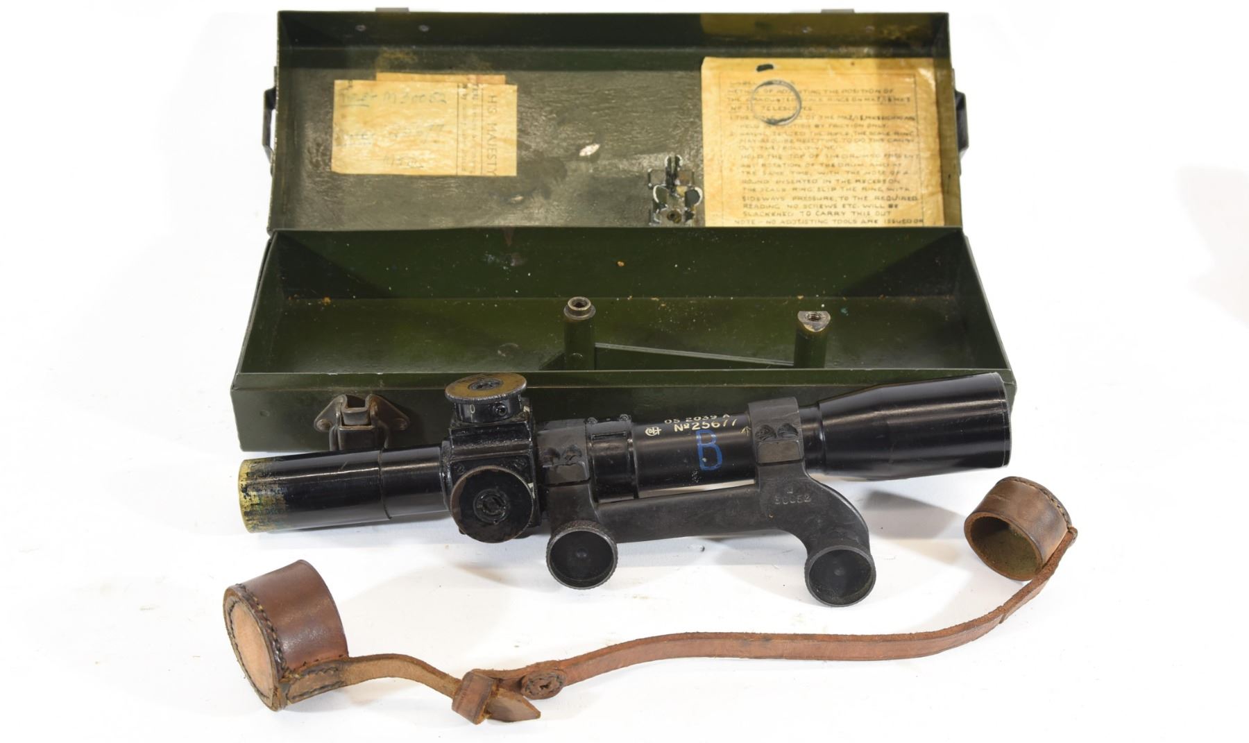 Non-restricted, bolt action, 303 British, 25" barrel, SN 12423. Wood has some dents and scratches, bluing worn with some marks and scratches, bore excellent. Comes with Tel. Stg. No 32 Mk3 Scope SN 25677 in metal case turrets do not turn, wooden storage case - leather handled straps are deteriorated from age. Bolt, receiver and mag have same serial number.