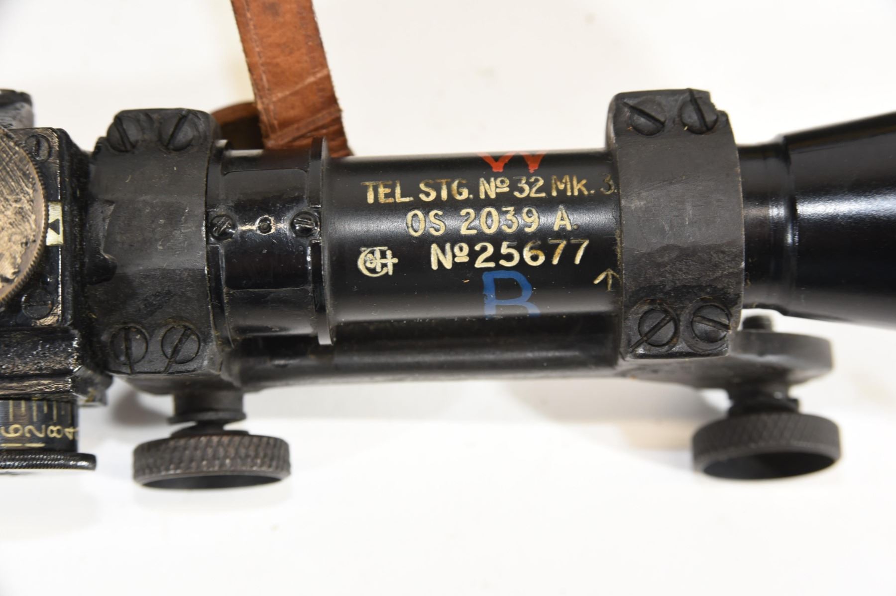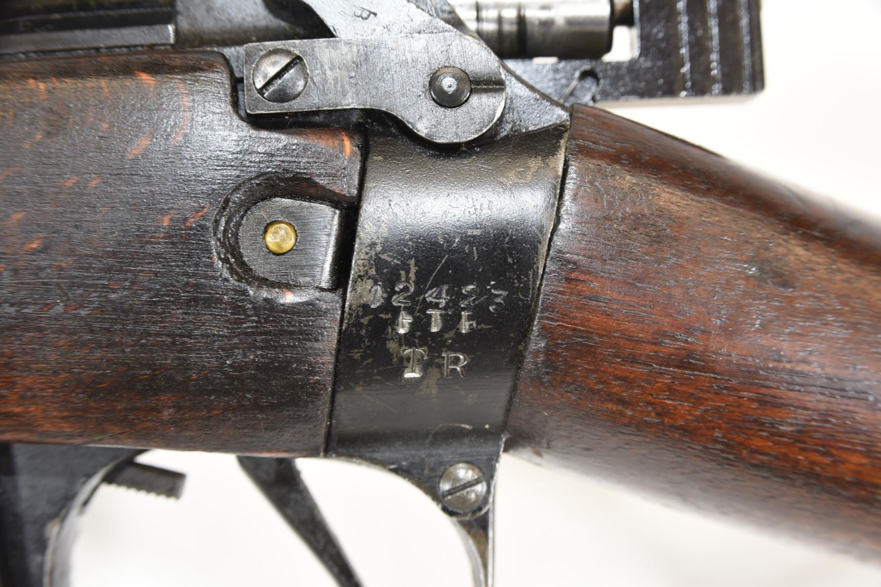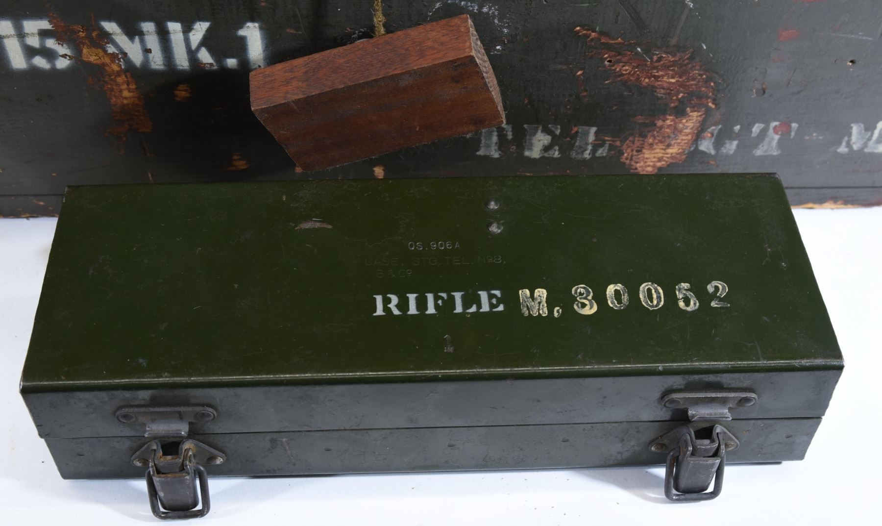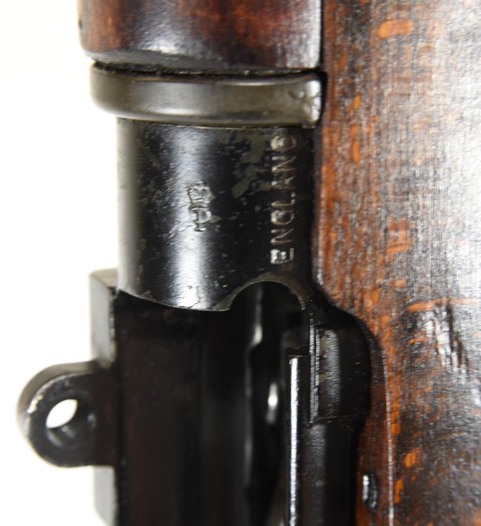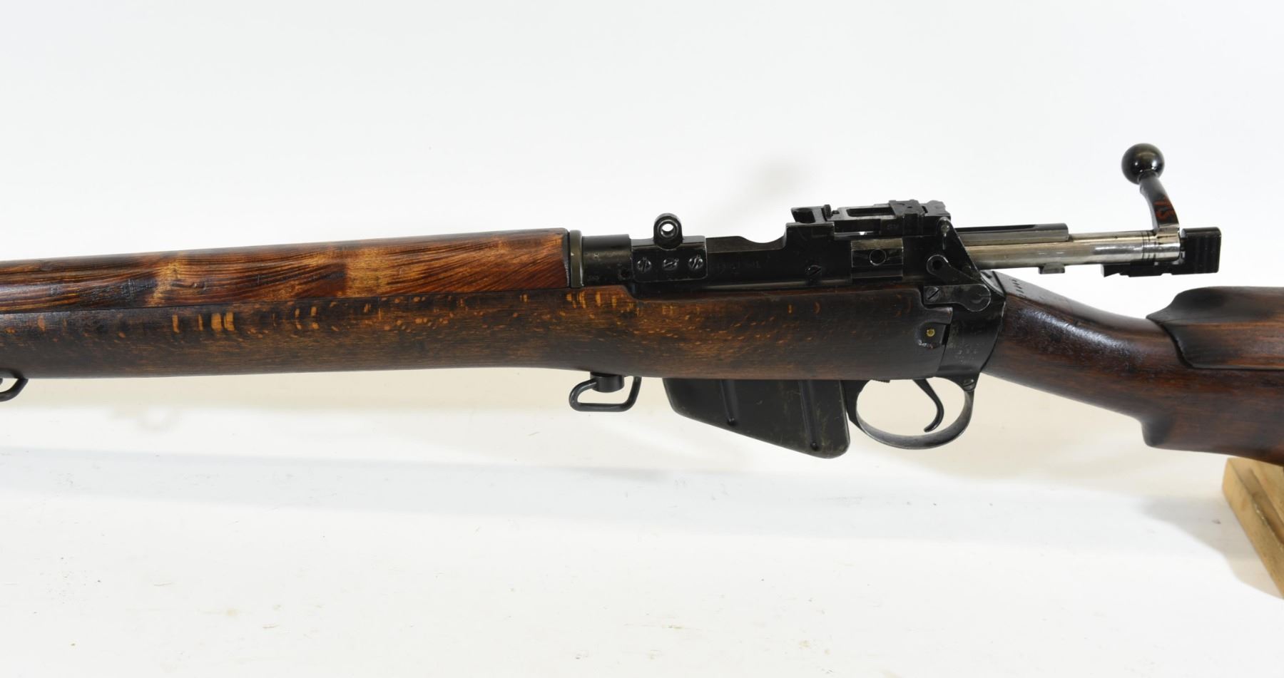 Non-restricted, bolt action, 303 British, 25" barrel, SN 12423. Wood has some dents and scratches, bluing worn with some marks and scratches, bore excellent. Comes with Tel. Stg. No 32 Mk3 Scope SN 25677 in metal case turrets do not turn, wooden storage case - leather handled straps are deteriorated from age. Bolt, receiver and mag have same serial number.