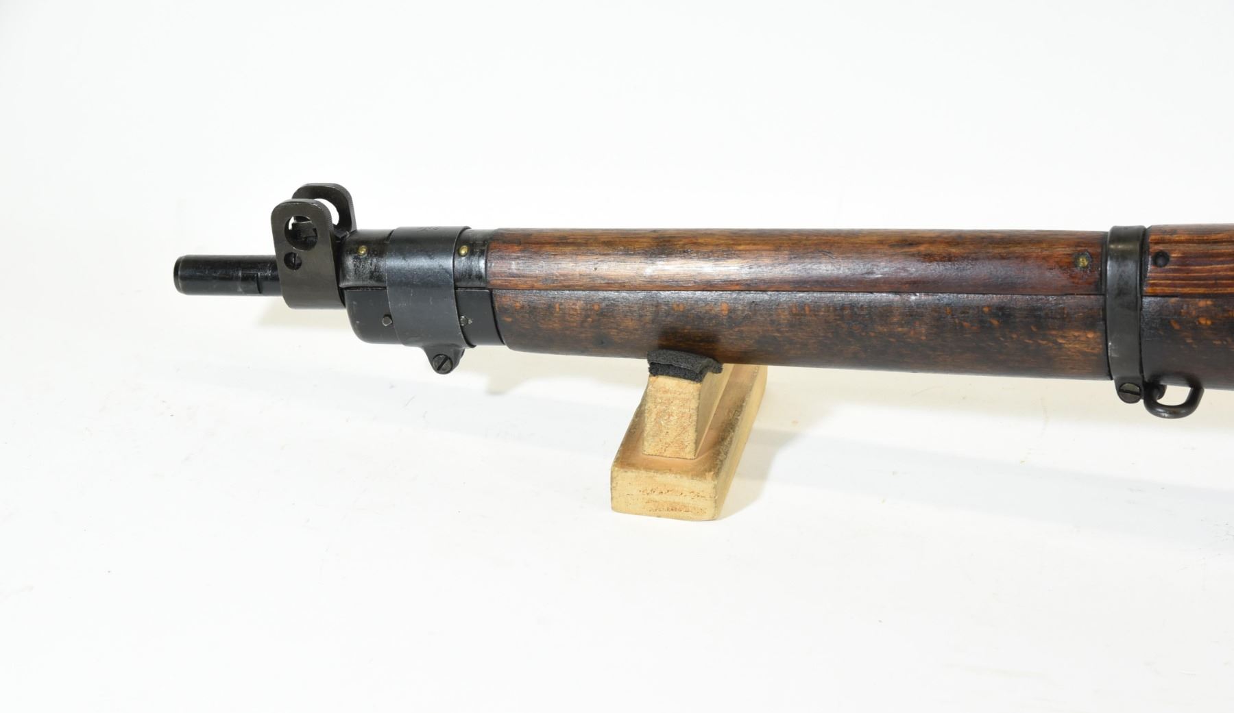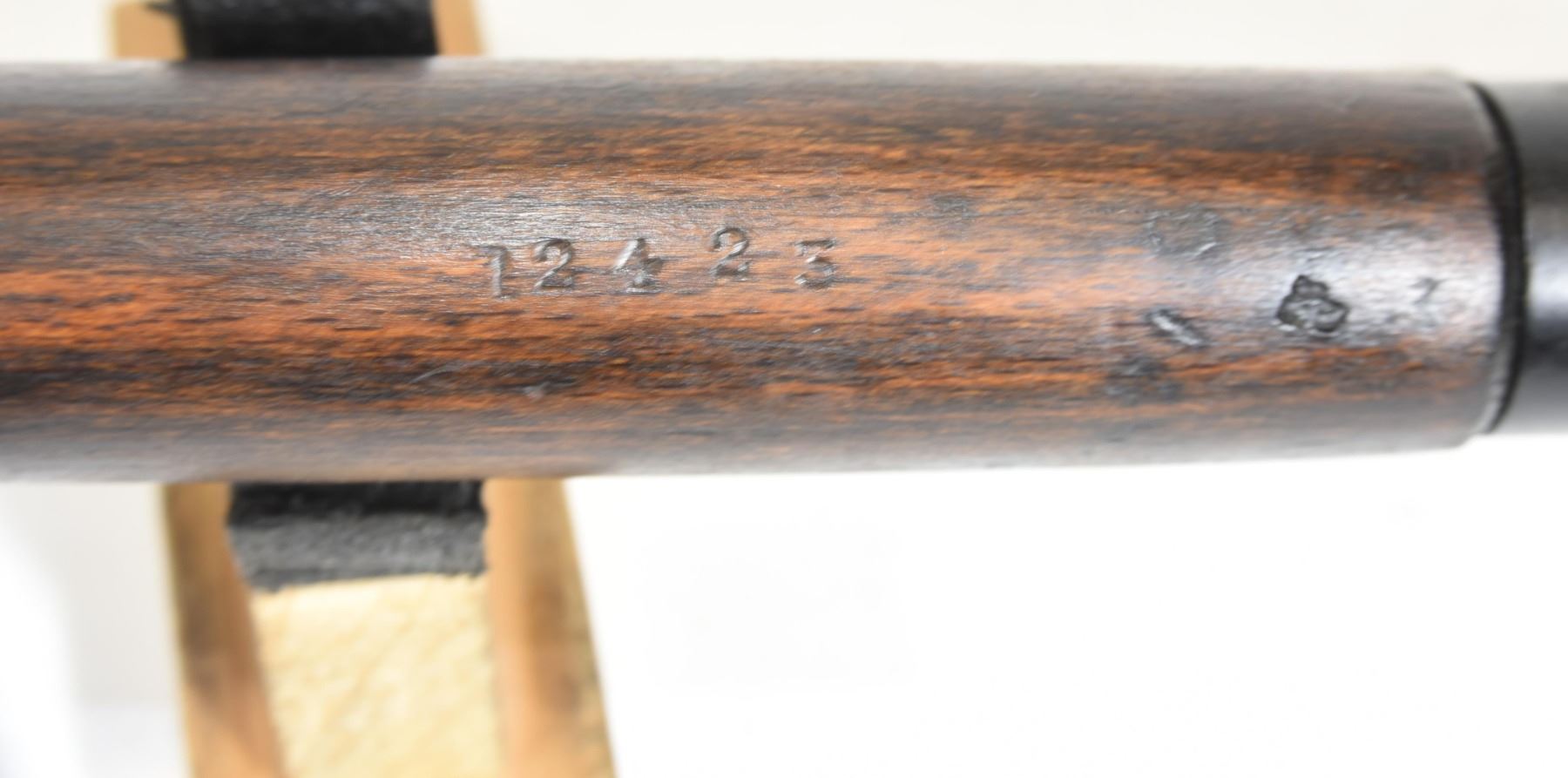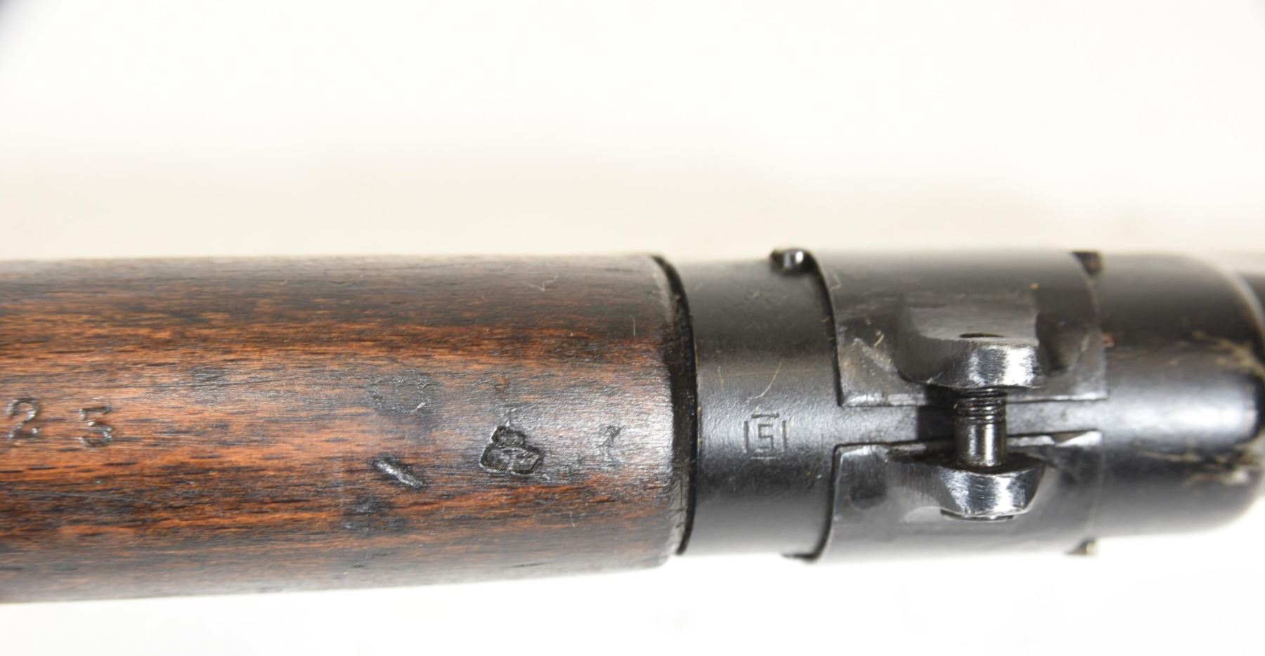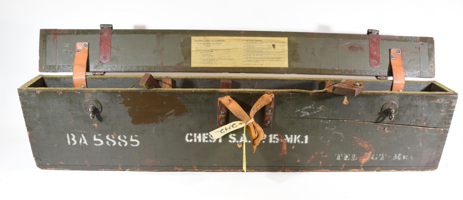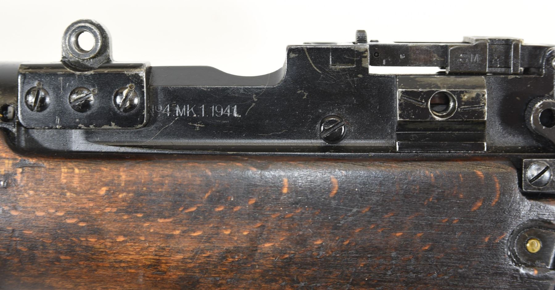 Non-restricted, bolt action, 303 British, 25" barrel, SN 12423. Wood has some dents and scratches, bluing worn with some marks and scratches, bore excellent. Comes with Tel. Stg. No 32 Mk3 Scope SN 25677 in metal case turrets do not turn, wooden storage case - leather handled straps are deteriorated from age. Bolt, receiver and mag have same serial number.