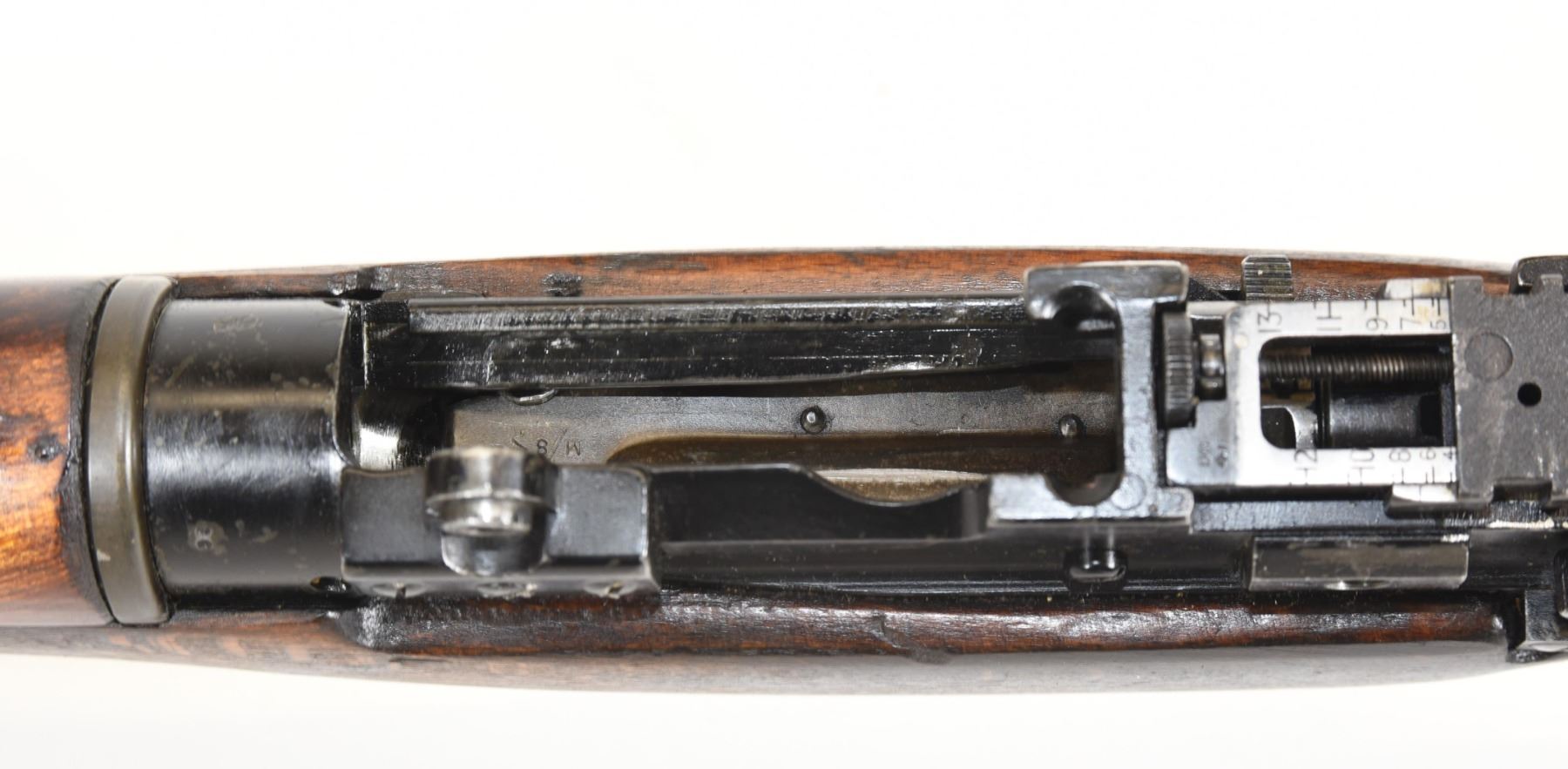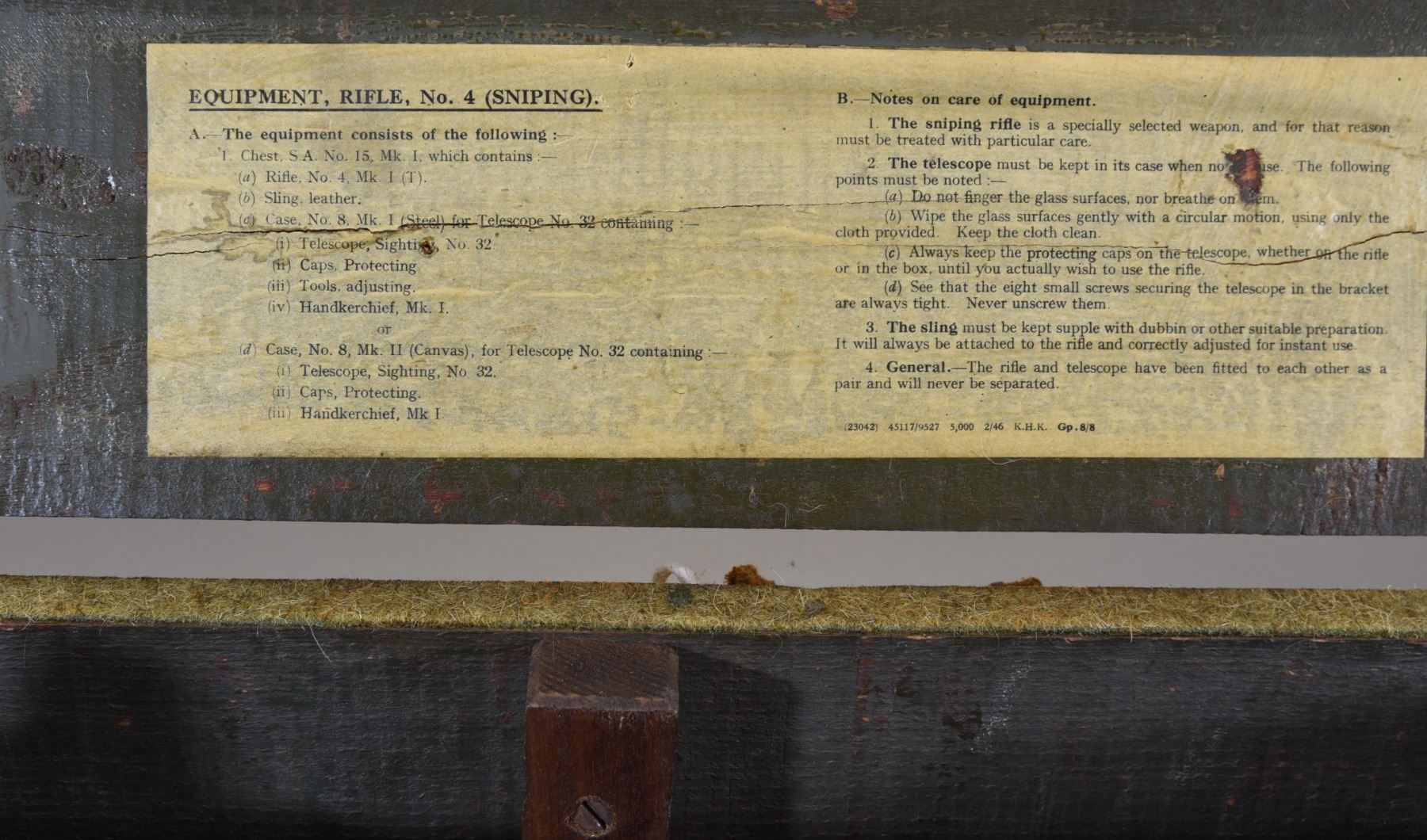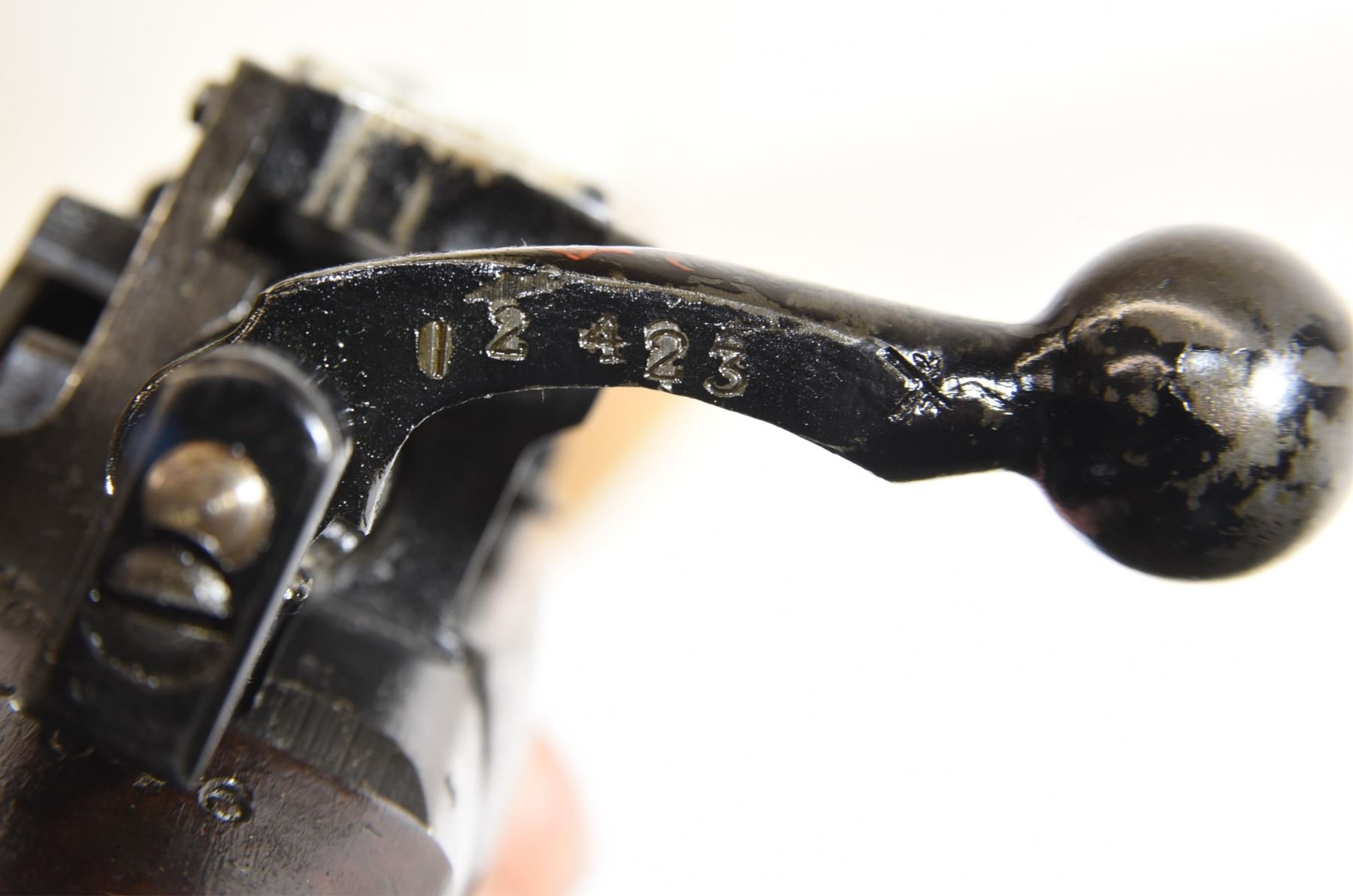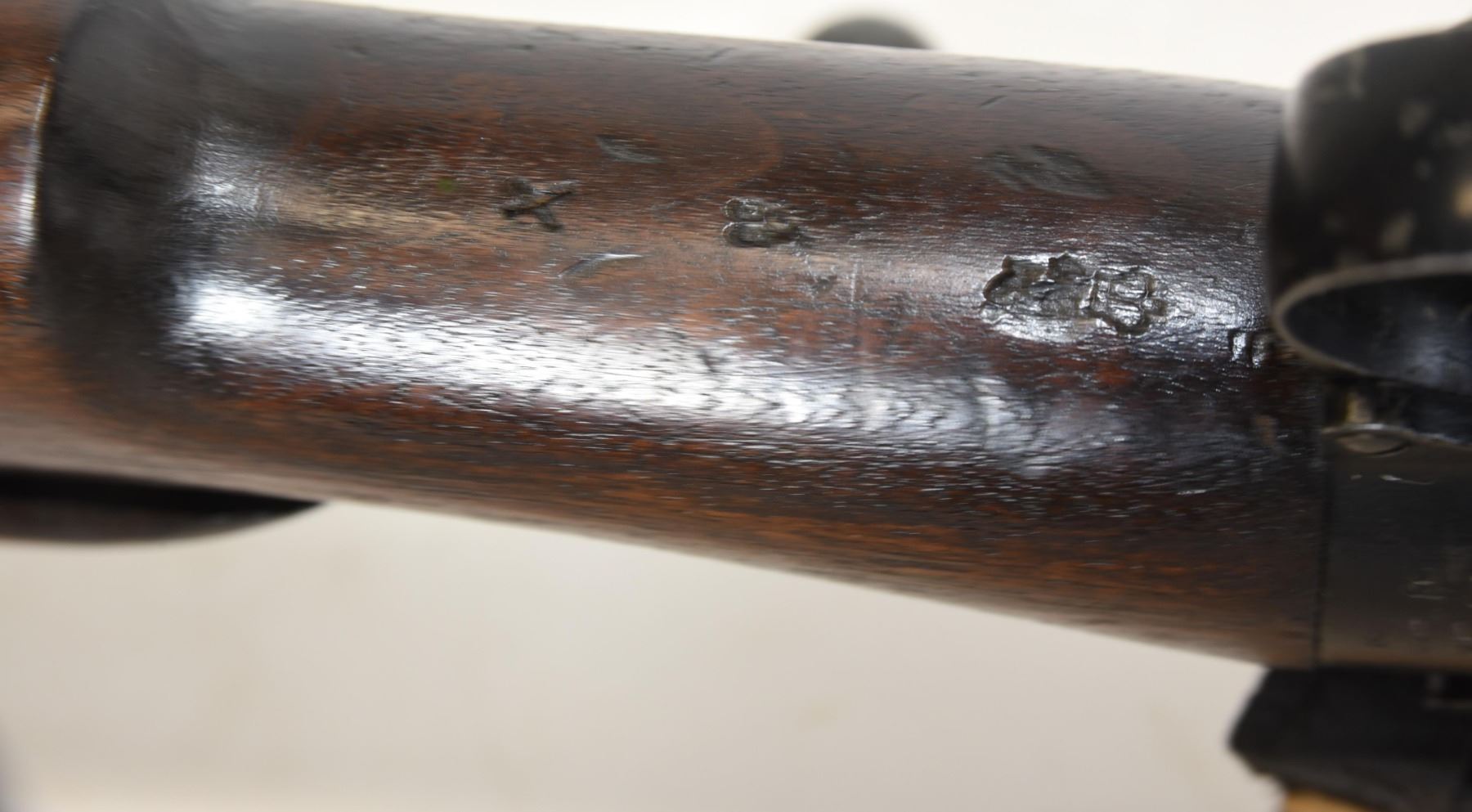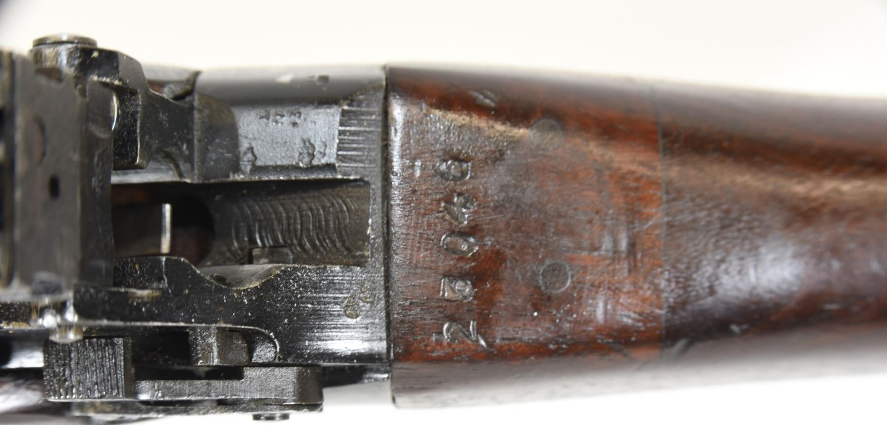 Non-restricted, bolt action, 303 British, 25" barrel, SN 12423. Wood has some dents and scratches, bluing worn with some marks and scratches, bore excellent. Comes with Tel. Stg. No 32 Mk3 Scope SN 25677 in metal case turrets do not turn, wooden storage case - leather handled straps are deteriorated from age. Bolt, receiver and mag have same serial number.