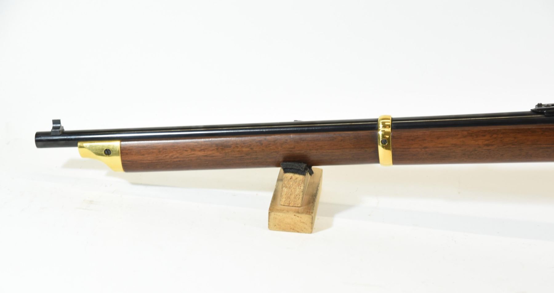Non-restricted, lever action, 30-30 cal , 22" barrel, SN MP3925. Wood is very good with some dents, bluing on barrel is very good with some wear at muzzle, bluing on lever is good. Gold plating on receiver is very good with light pitting, bore is very good.