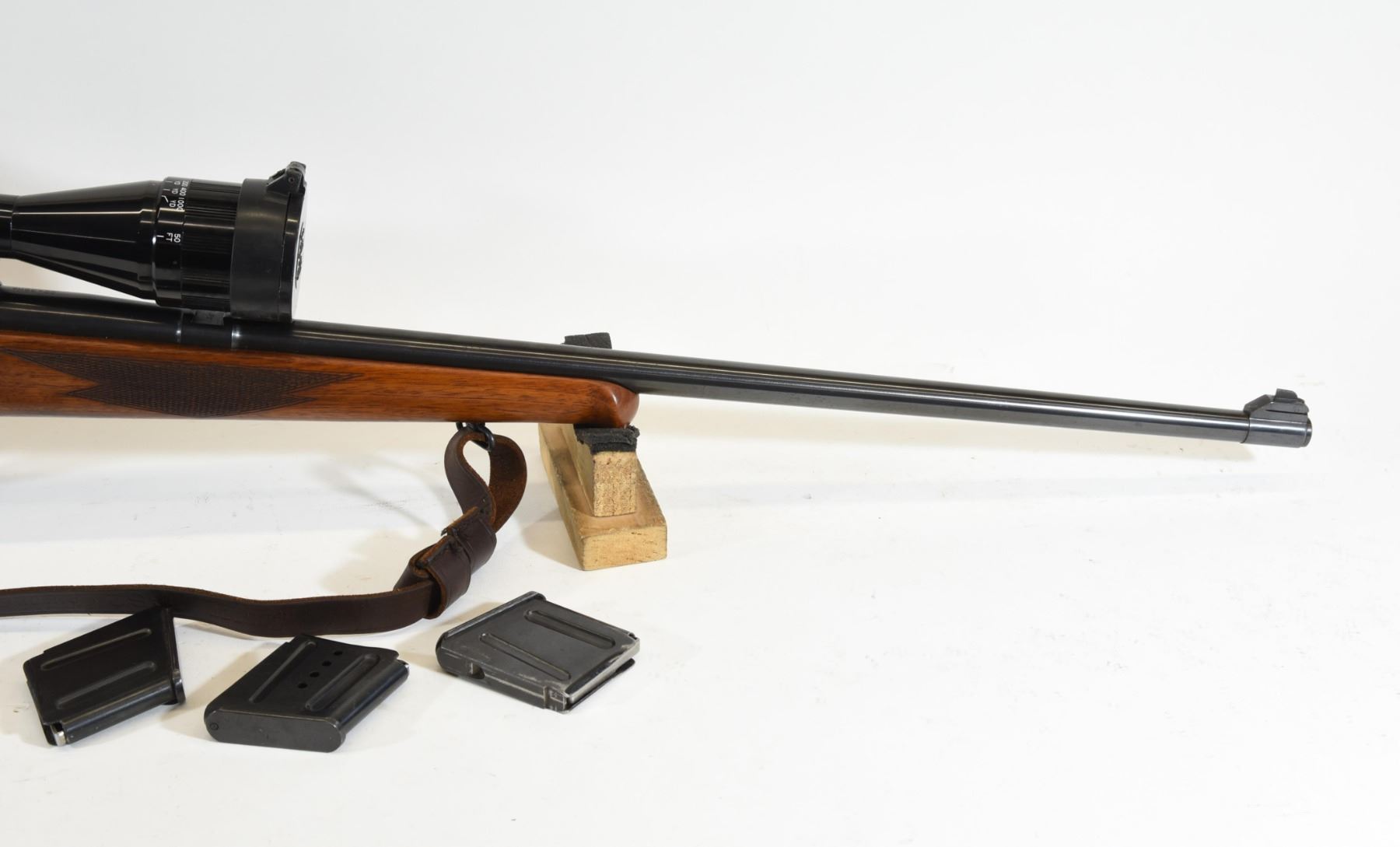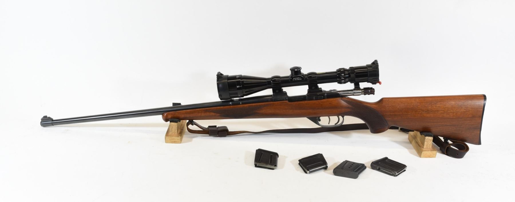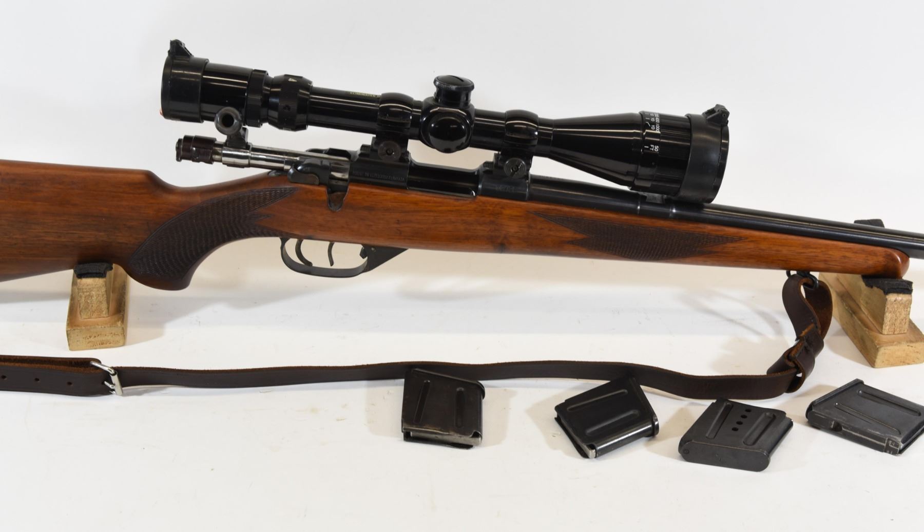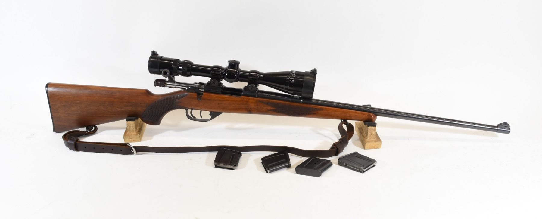 Non-restricted, bolt action, 22 x 36Ho (22 Hornet), 23" barrel, SN 02428. Toe is chipped, bluing has light pitting, bore excellent. Comes with three extra mags, a Bushnell Banner 4-12 x 40AO scope and a sling.