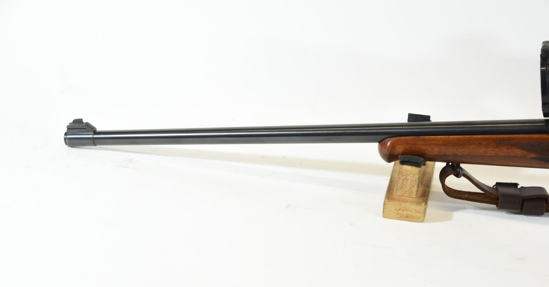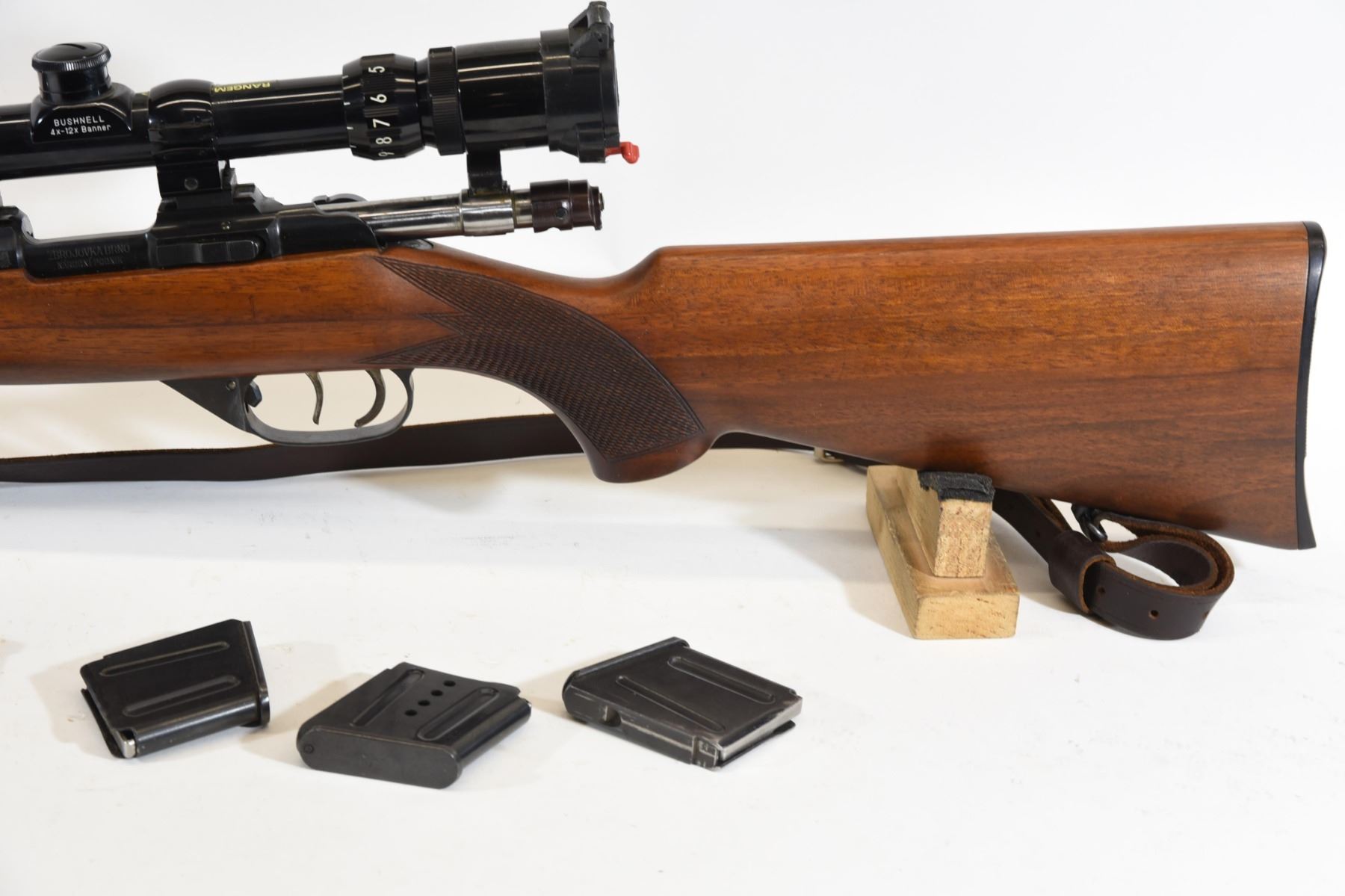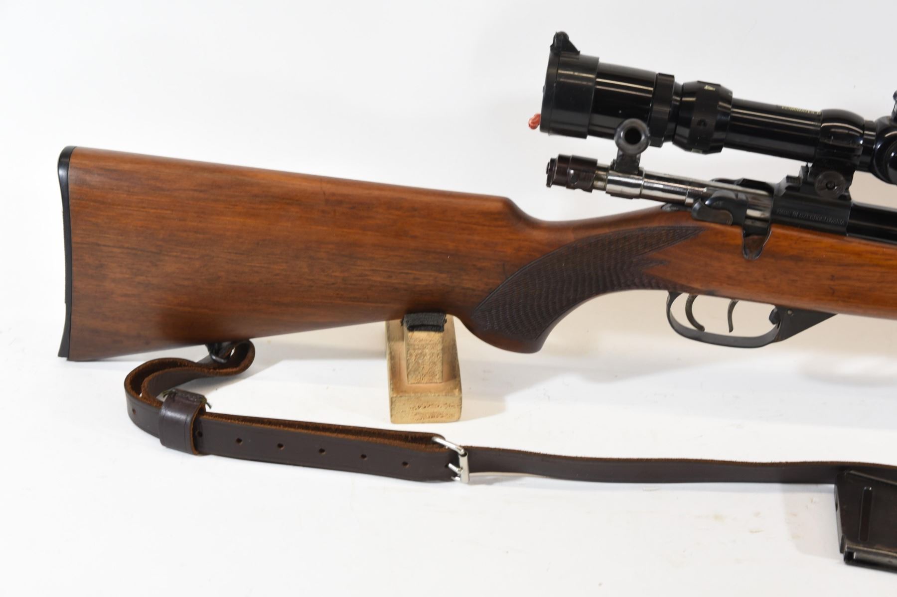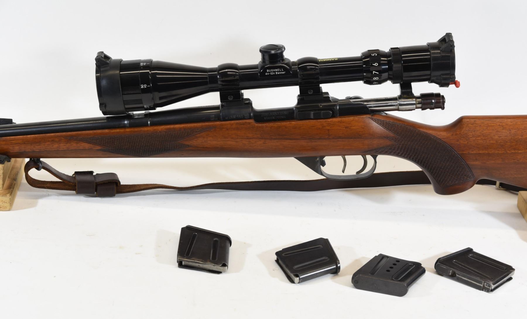 Non-restricted, bolt action, 22 x 36Ho (22 Hornet), 23" barrel, SN 02428. Toe is chipped, bluing has light pitting, bore excellent. Comes with three extra mags, a Bushnell Banner 4-12 x 40AO scope and a sling.