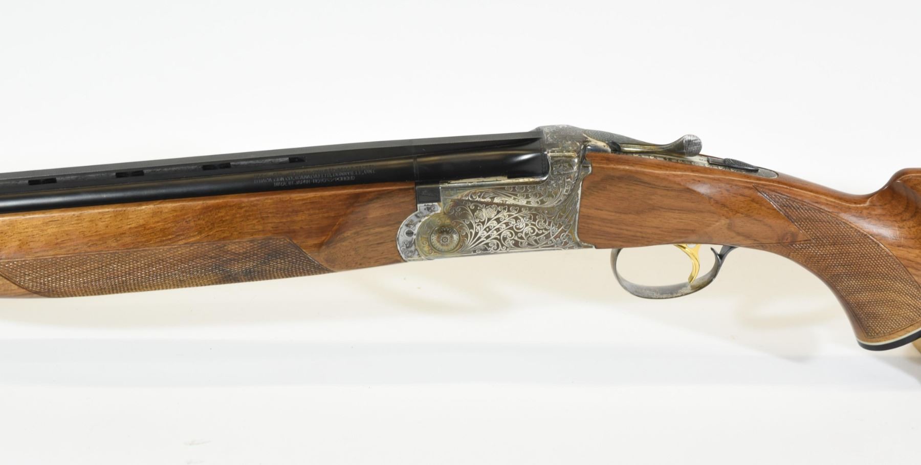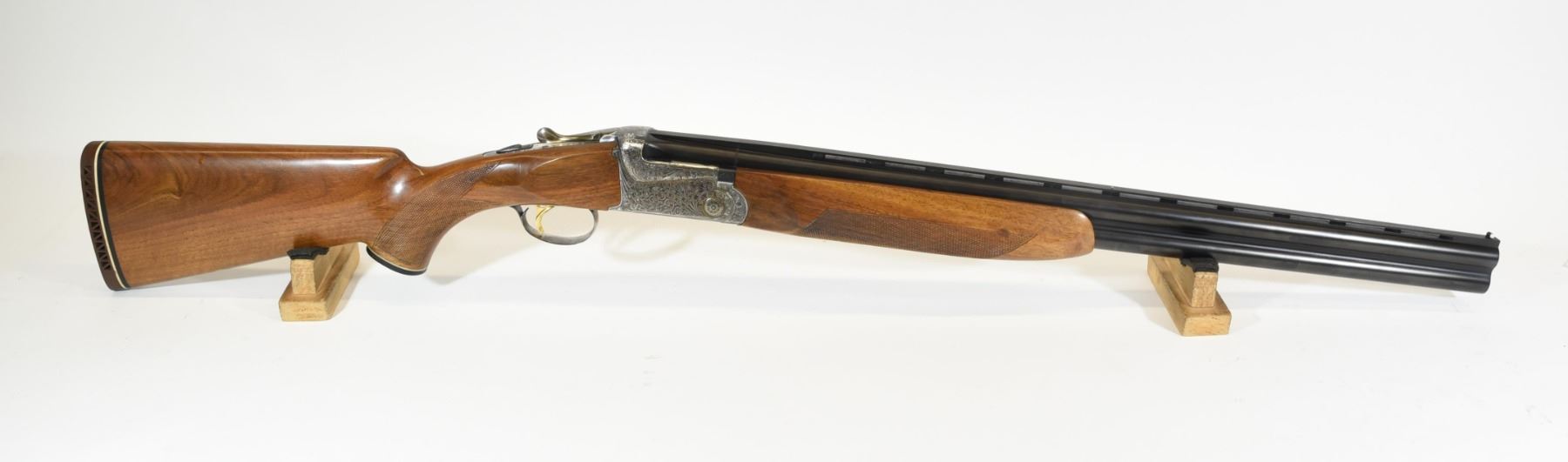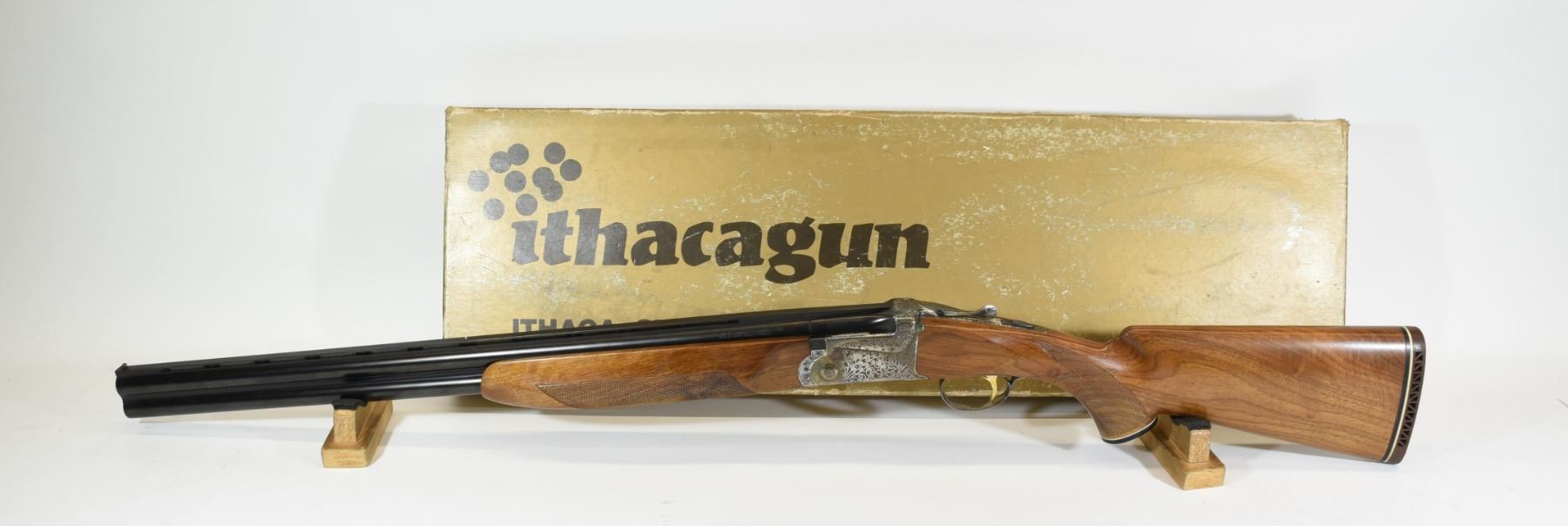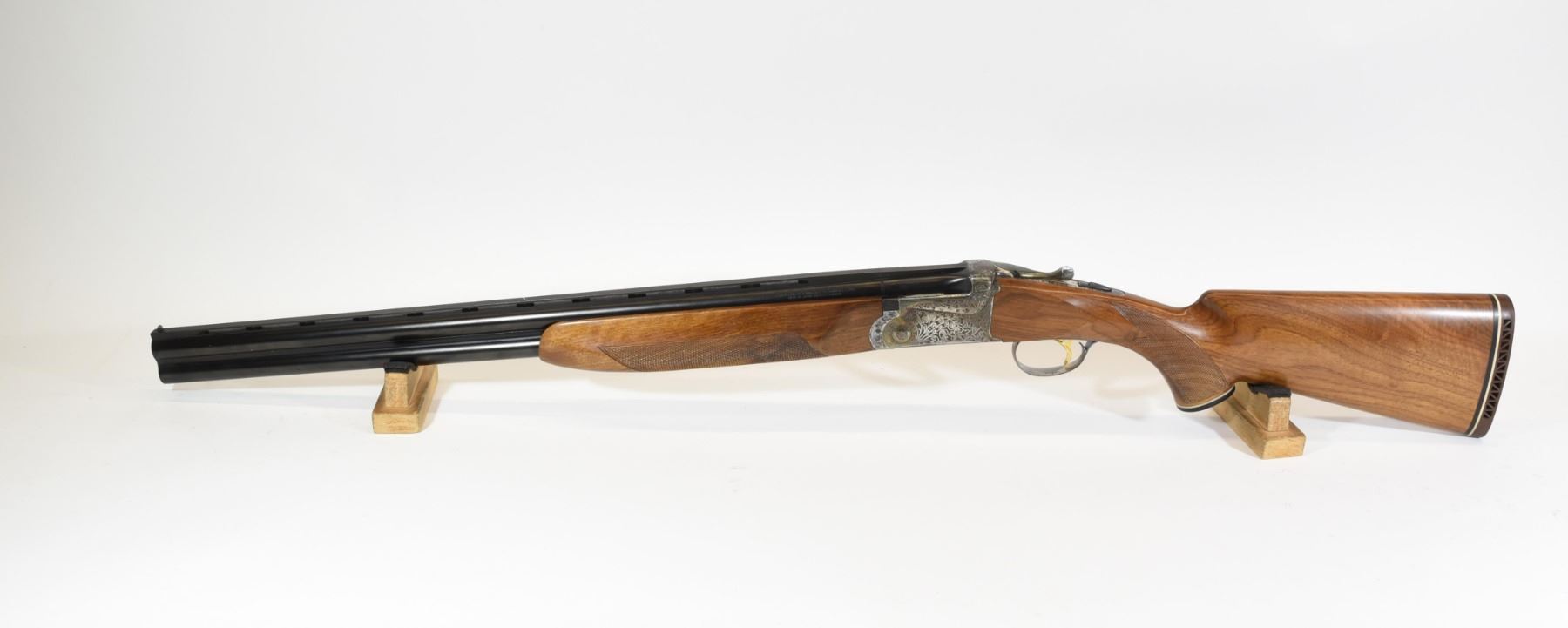 Non-restricted, multi barrel, 12Ga x 2 3/4", 26" vent rib barrels with fixed chokes (skt, skt), SN 55638241. Wood excellent, bluing very good, receiver finish tarnished, bores excellent. Original box.