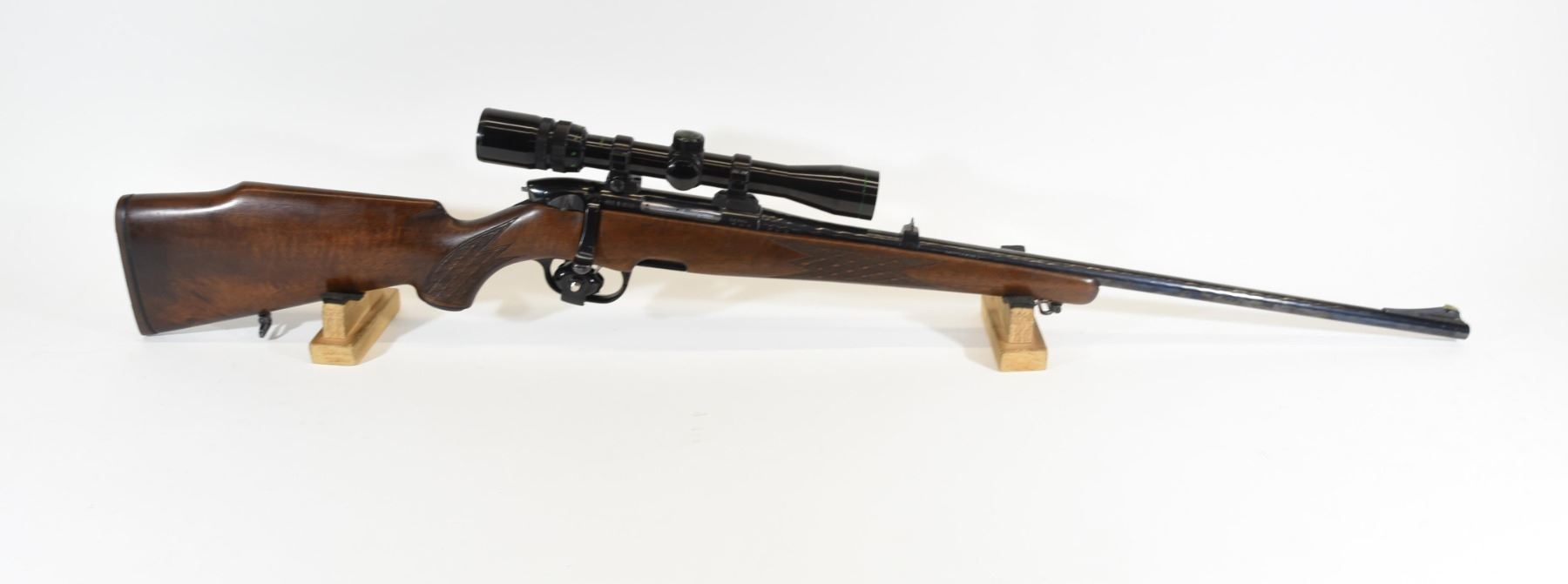 Non-restricted, bolt action, 223 Rem, 23" barrel, SN 68906. Wood has a few small handling marks, bluing has marks on barrel, bore excellent. Comes with Bushnell Buckhorn 3-9 x 32 scope.