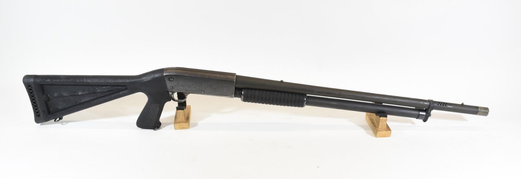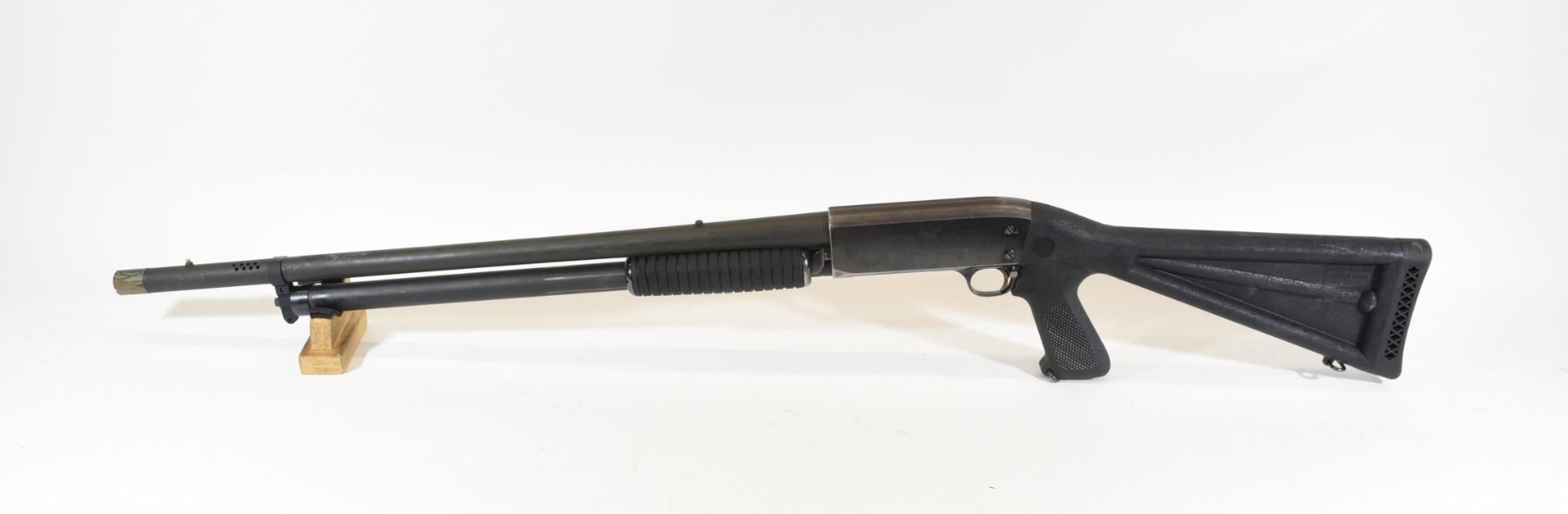 Non-restricted, pump action, 12 ga. 3", 25" ported barrel with a mod. screw in choke tube, SN 613081. Synthetic pistol grip stock in good condition, bluing is turning grey on receiver and a couple of scratches on matte finish of barrel, bore is good, has an extended mag. tube, Choate stock & foregrip, gun said to be custom built by Ron Sharp.