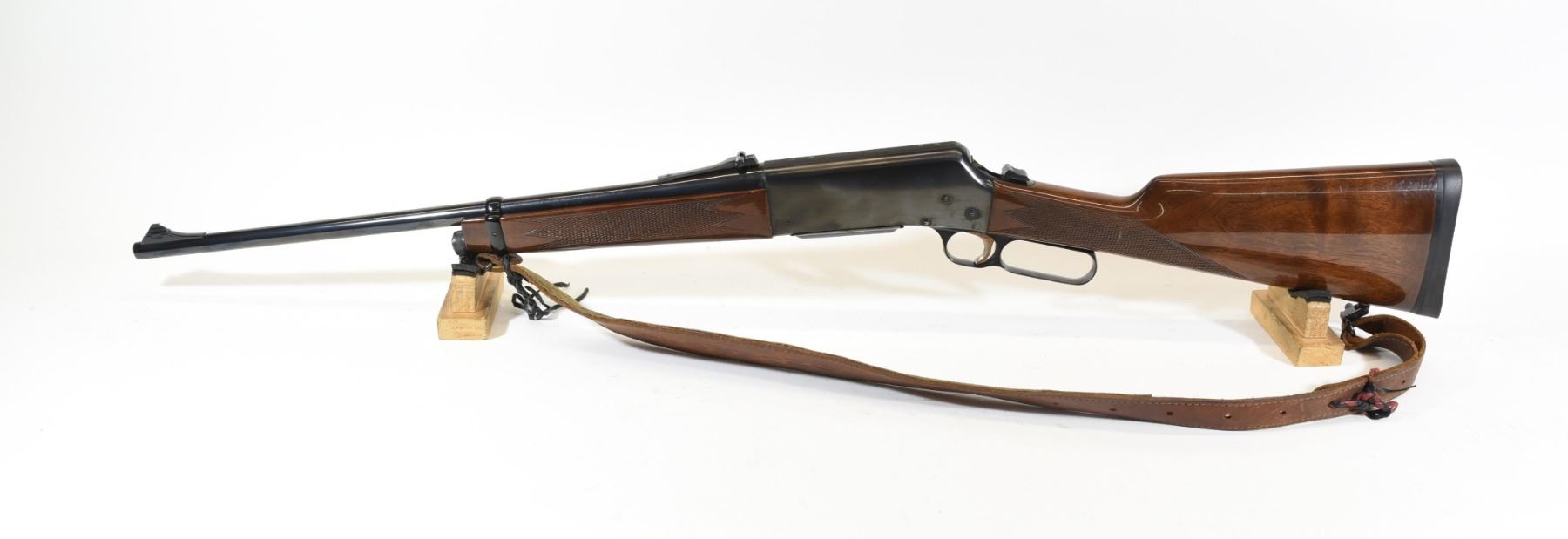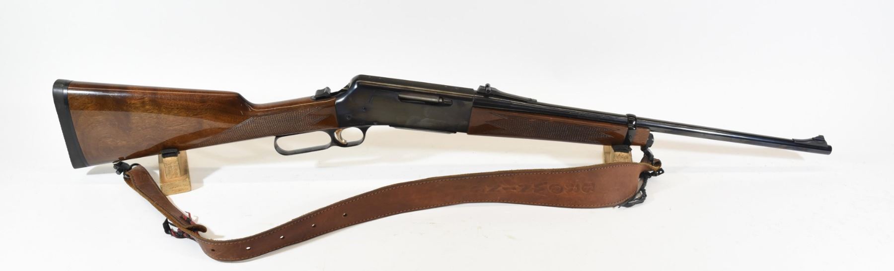 Non-restricted, lever action, 308 cal., 20" barrel, SN 13694PV227. Wood is quite good with light marks, bluing is very good, bore is excellent. Has a Browning leather sling.