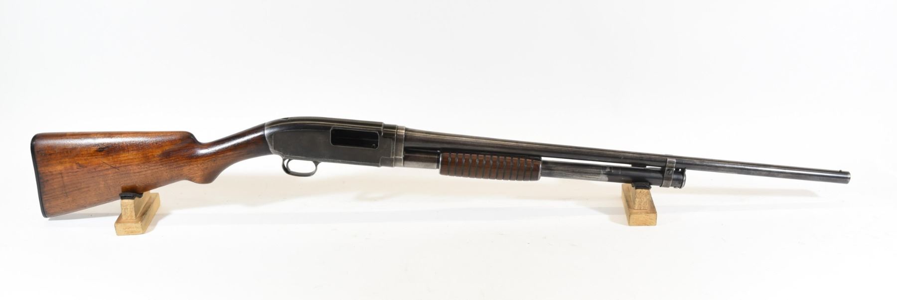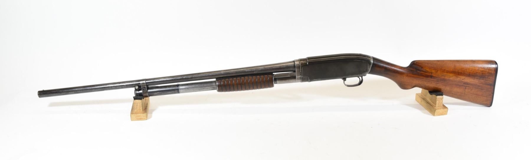 Non-restricted, pump action, 20 ga. 2 3/4", 25" barrel, SN 10383. Wood has handling marks and a few light scratches, bluing is turning grey, bore is good. Gun was manufactured in 1913.