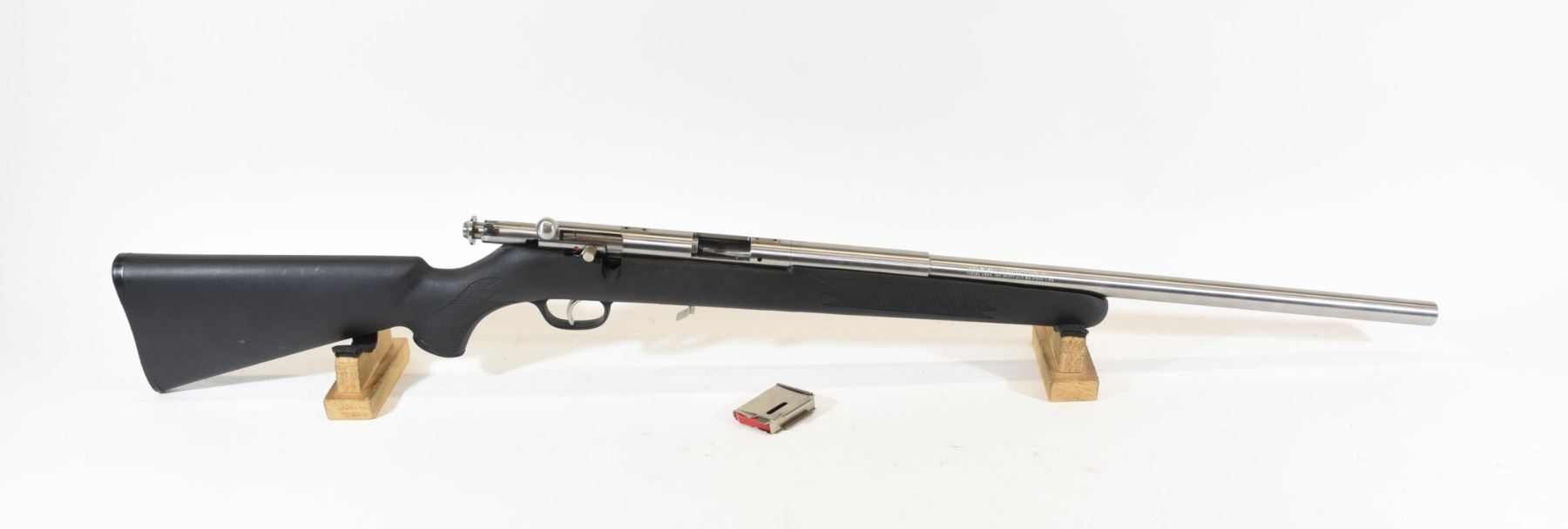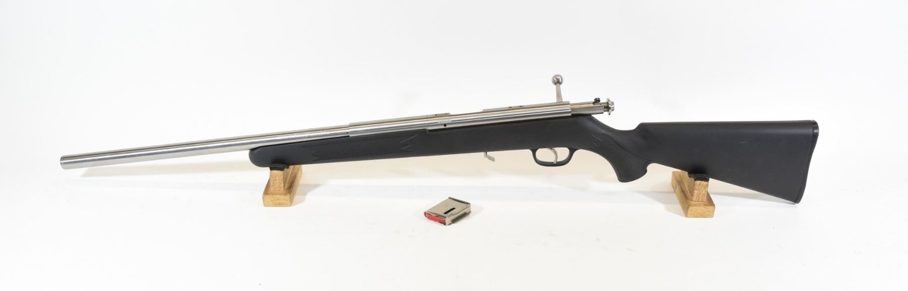 Non-restricted, bolt action .17HMR cal, 21" barrel, SN 0190530. Synthetic stock has some wear marks, nickel barrel and action is very good, 1 mark at muzzle, bore is excellent. Includes 1 magazine.