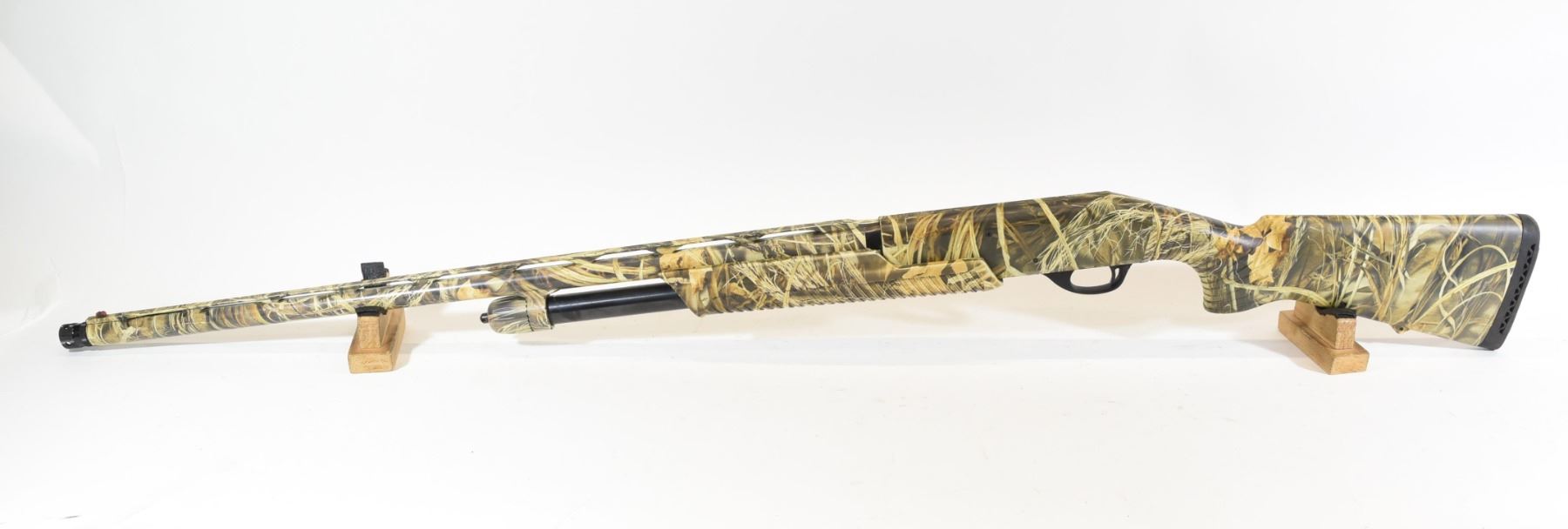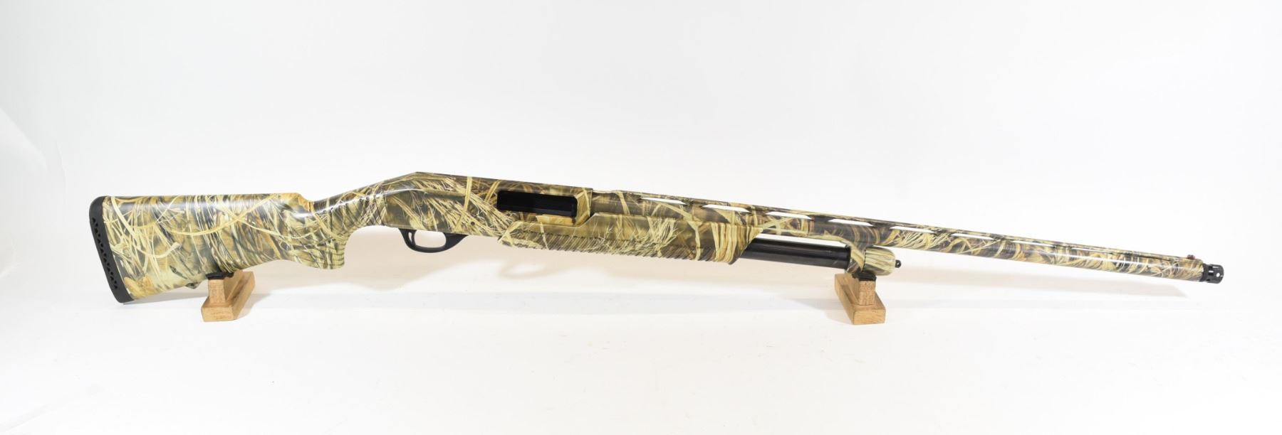 Non-restricted, pump action, 12ga 3 1/2., 28" barrel with undertaker XThd turkey choke , SN 70588. Synthetic camo pattern in very good condition, bore is very good.