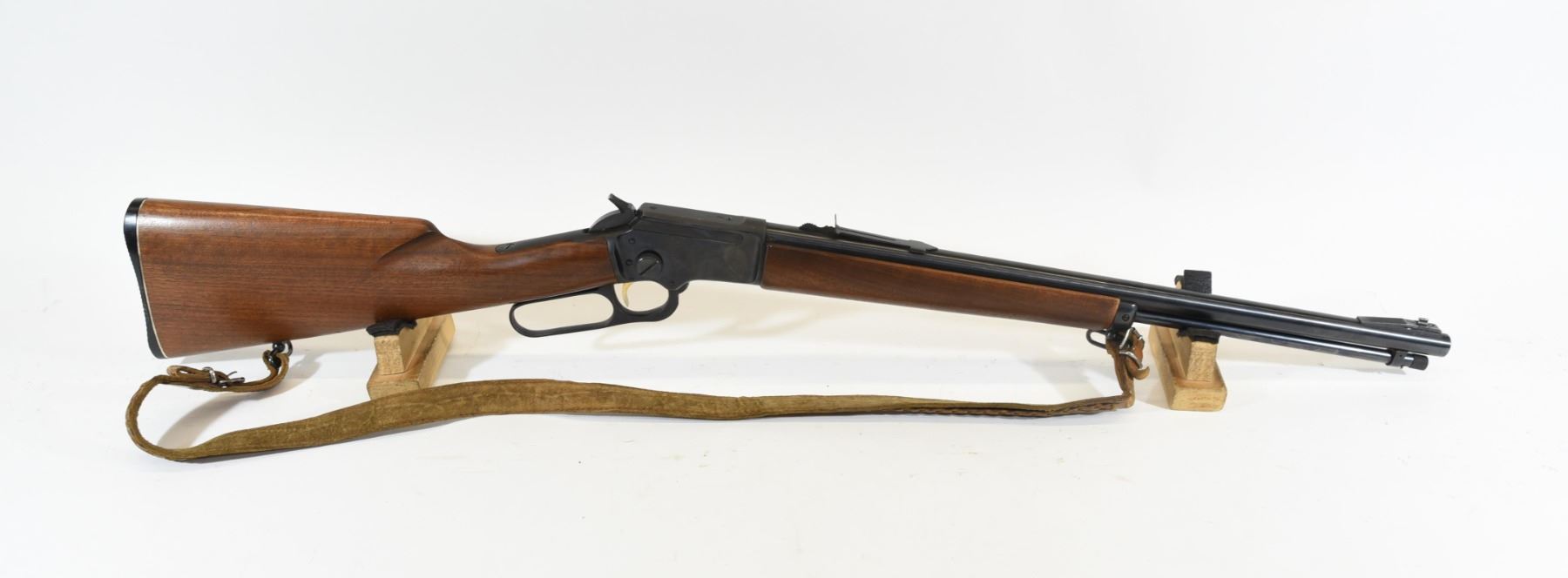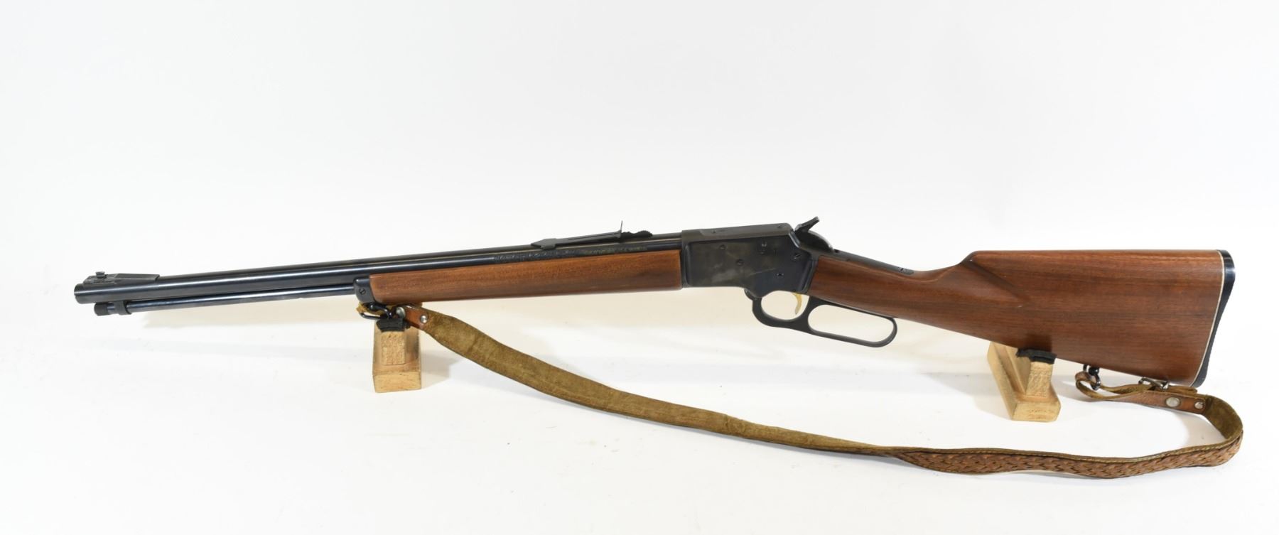Non-restricted, lever action, .22 s-l-lr, 20" barrel, SN R27889. Wood has just one fine crack at lower tang and an extra sling swivel hole in butt stock, bluing is good, bore is excellent. Has a leather sling.