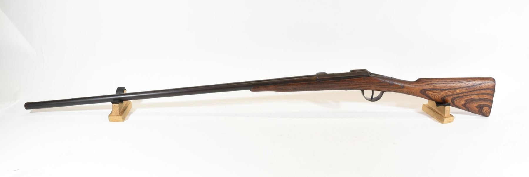 Non-restricted, bolt action, 12Ga 2 3/4", 32" barrel, SN none. Wood has marks, bluing has turned brown, bore is fair, bolt is difficult to operate.